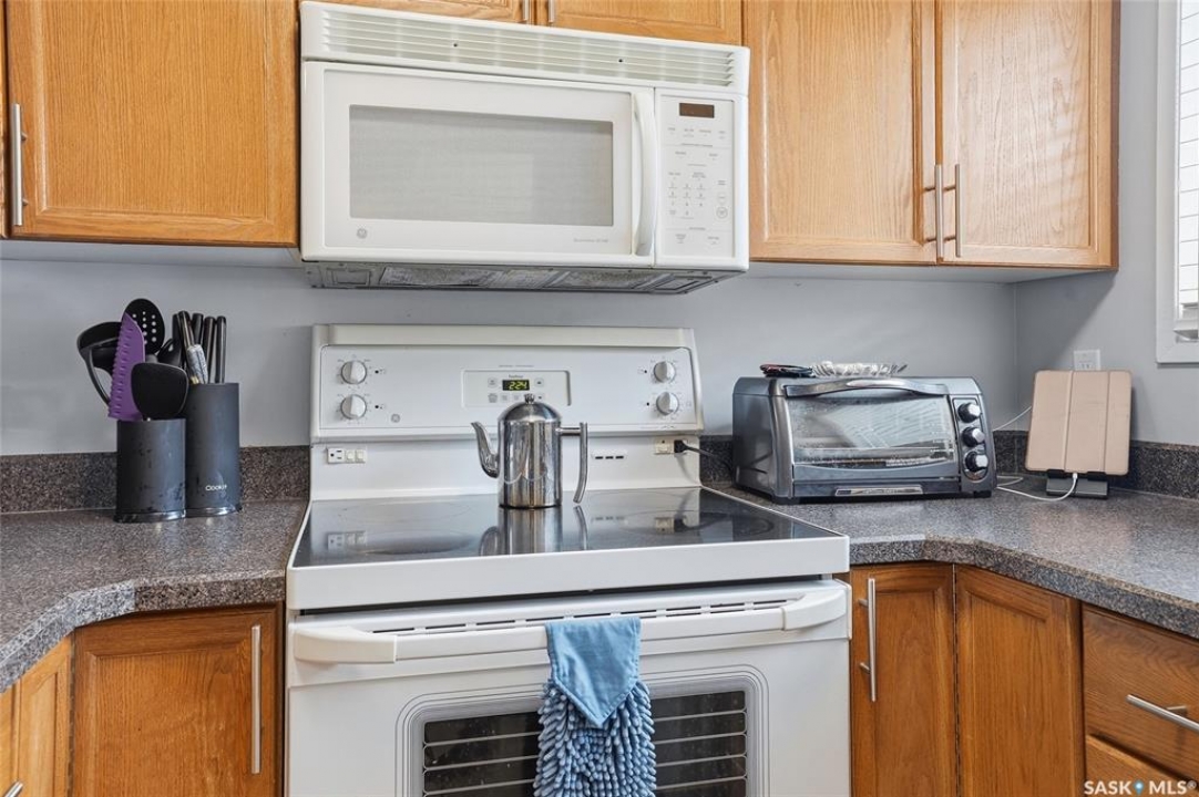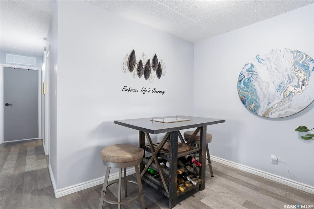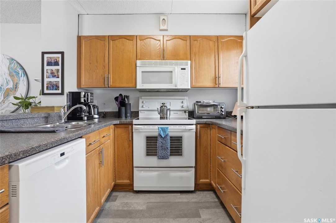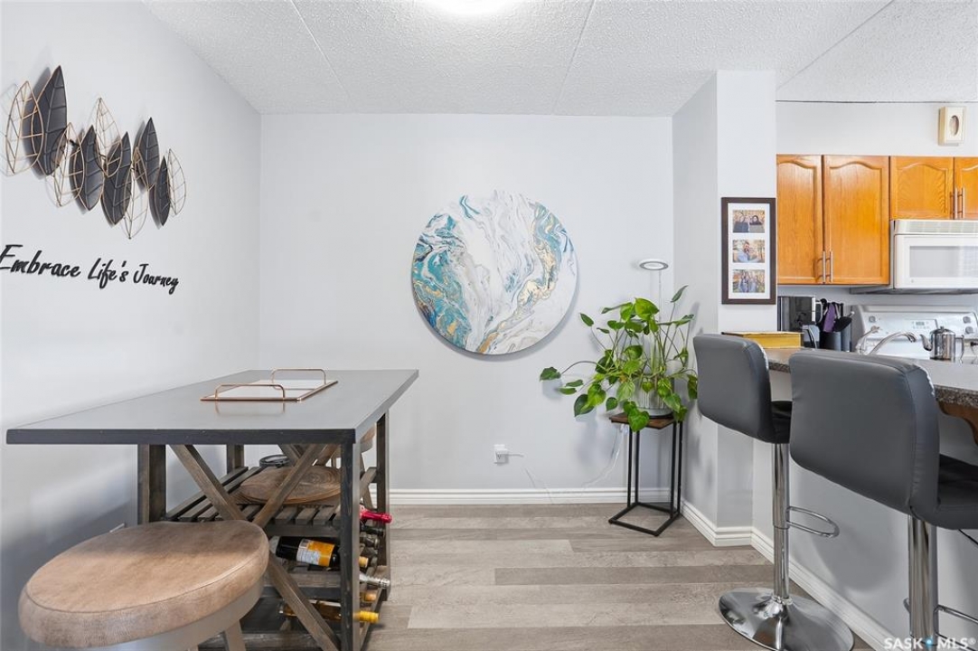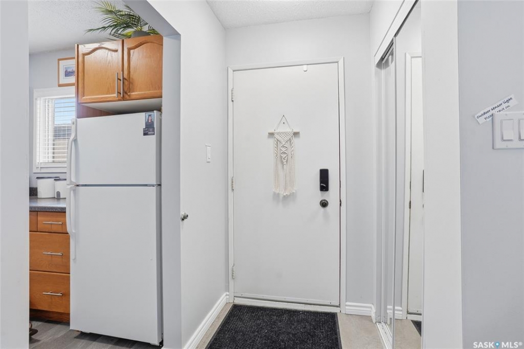 A rare opportunity awaits at River Ridge Estates — and the name truly says it all. Quietly tucked at the back of the complex, this beautifully updated main-floor condo offers the perfect blend of privacy, safety, and low-maintenance living. Even better? A detached garage sits just steps from your door — a hard-to-find feature that provides extra storage and year-round convenience. Located in a well-established community in desirable Lawson Heights, this complex is ideally positioned near schools, parks, the Meewasin Trail, shopping, the civic centre, and more. It's a setting that perfectly balances tranquility with everyday accessibility. Step outside to your private southwest-facing patio overlooking the peaceful courtyard, complete with mature trees and lush garden spaces. Inside, the modern updates shine. Upgraded flooring and fresh paint create a clean, contemporary feel throughout the open-concept layout. The kitchen is fully equipped with appliances, generous cabinetry, ample counter space, and a functional eat-up island. The dining area flows seamlessly into the bright living room, where newer patio doors and a stunning fireplace with a wood-accent mantle create a warm and welcoming focal point. An electric insert adds both comfort and ambiance. The spacious primary bedroom offers impressive square footage, a walk-in closet, and convenient access to the four-piece bathroom — a true retreat at the end of the day. An additional bedroom provides flexibility for guests, an office, or hobbies. And finally, a large storage room houses your laundry, water heater, and plenty of extra storage space. Whether you're a first-time buyer looking to step into homeownership or ready to downsize without compromise, this home checks all the boxes. The complex is pet-friendly, features a strong and established reserve fund, and offers additional parking for rent. Your search ends here — call today for more information and start packing!