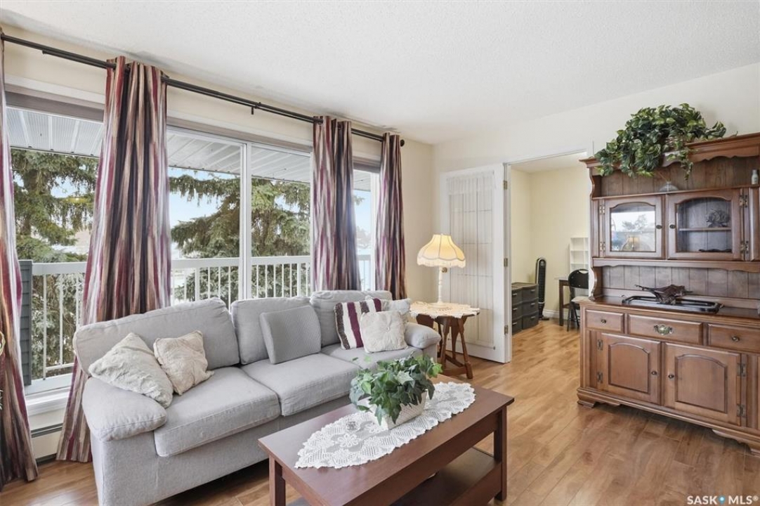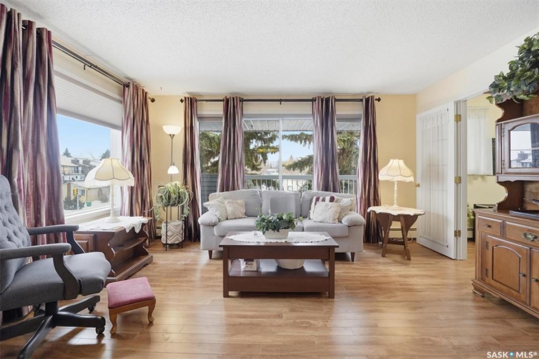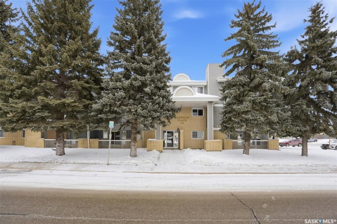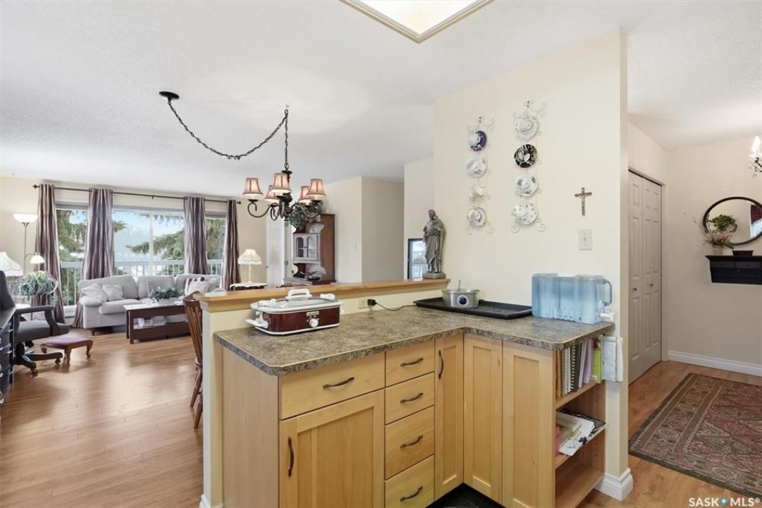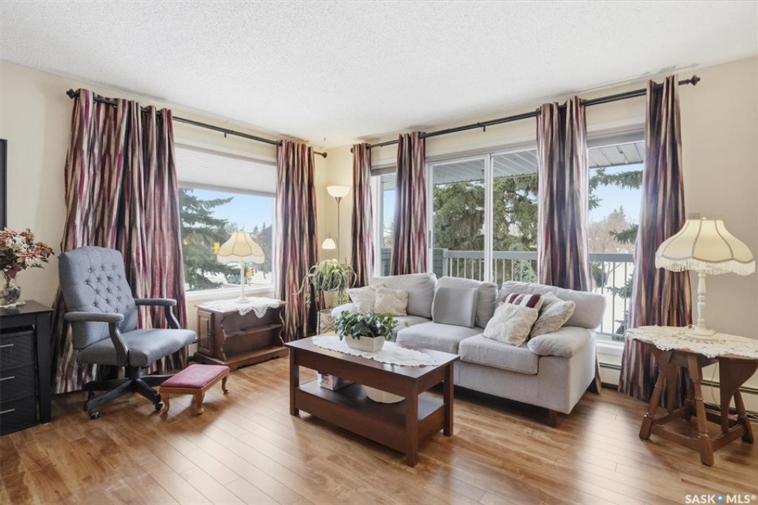 Immaculate corner unit offering 2 bedrooms and 2 bathrooms, numerous upgrades throughout. This bright spacious condo features lots of natural light, a spacious foyer and functional open-concept layout. The kitchen is highlighted by beautiful hickory cupboards. Additional features include newer laminate flooring, large laundry/utility room with plenty of storage, access to a large deck with storage room. This well maintained building has an elevator, amenities and exercise rooms. This unit shows 10/10 and is truly move-in ready.
