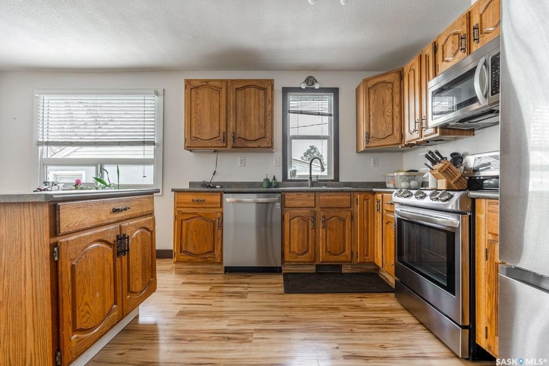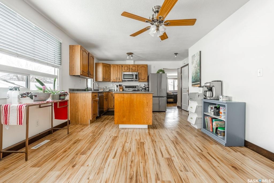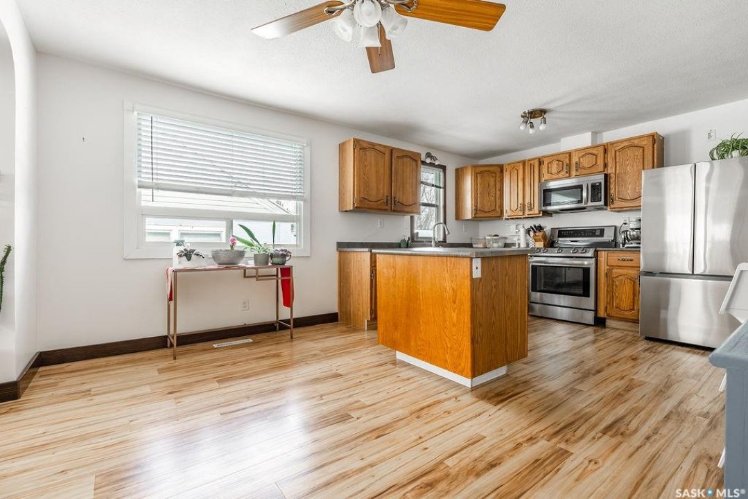 Welcome to 612 Avenue M S! This spacious 1,364 sq. ft. raised bungalow offers incredible versatility with a 2-bedroom legal suite, making it an excellent opportunity for homeowners or investors alike. The front entrance welcomes you into a bright and sunny formal dining room highlighted by large windows and a charming archway that leads into the updated kitchen, complete with an island and stainless steel appliances. Down the hall you'll find two comfortable bedrooms and an updated 4-piece bathroom. Just past the kitchen is another bedroom, which could also serve perfectly as a home office, along with an additional updated 4-piece bathroom. The spacious living room features a large window overlooking the backyard, creating a warm and inviting space to relax. The lower level of the main home offers two more large bedrooms, bringing the total to five bedrooms in the main suite, along with a utility room that hosts the laundry. The legal 2-bedroom suite is well laid out with its own kitchen, living room, dining area, 4-piece bathroom, and private laundry and utility room, providing a fantastic mortgage helper or rental opportunity. Beautifully maintenance with new shingles just last year. Outside, you'll find a concrete driveway in the front and a large 24 x 24 detached garage in the back with plenty of space for parking and storage. Conveniently located close to downtown amenities, schools, and services, this property offers space, flexibility, and excellent income potential.