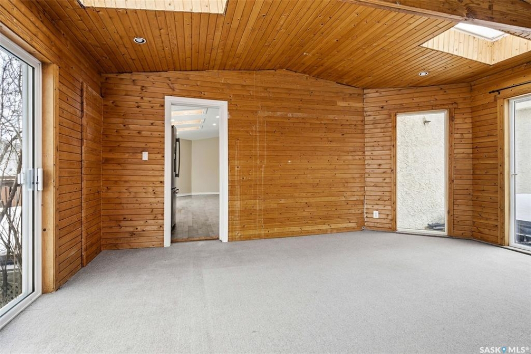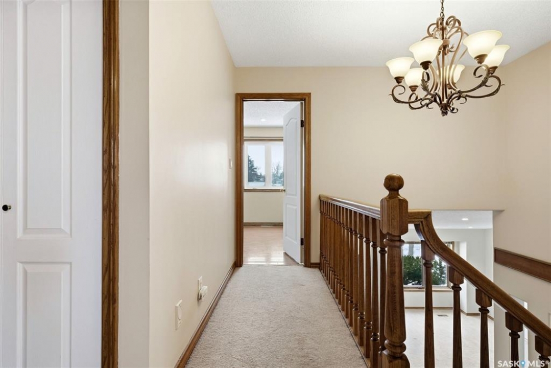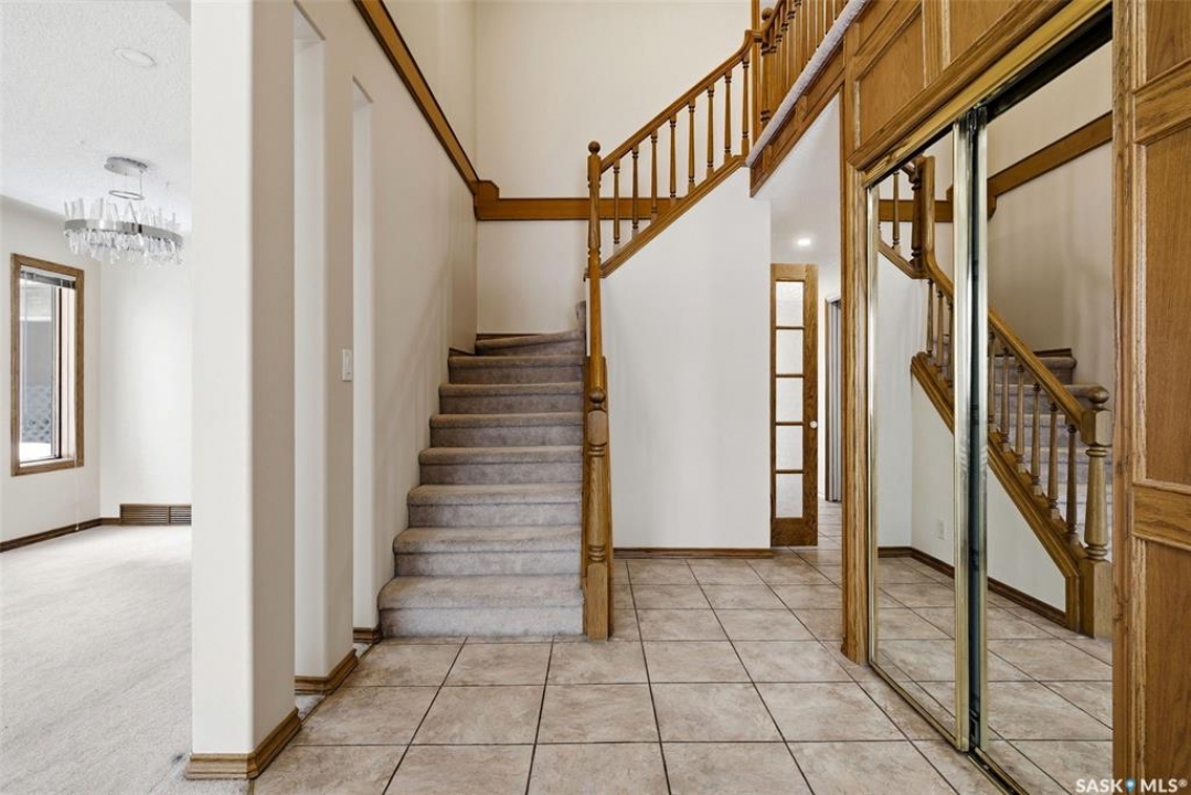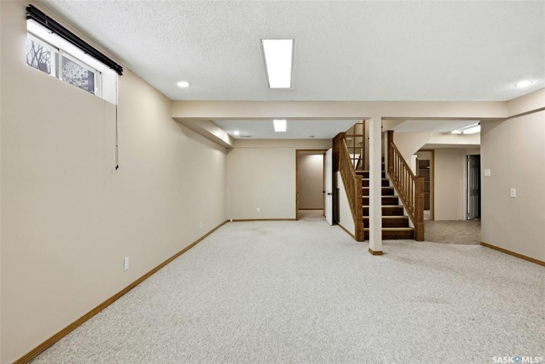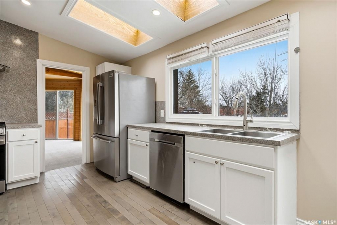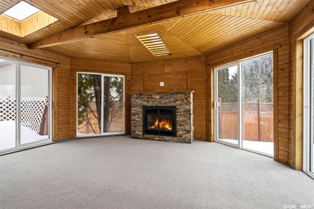 Welcome to 3234 Wascana Glen, a spacious two-storey split located in the highly desirable Wascana View neighbourhood of Regina. Offering 2,496 sq ft above grade, this well-designed home features generous living spaces, timeless oak finishes, and a layout perfect for family living and entertaining. The grand front foyer welcomes you with vaulted ceilings, a striking staircase, and mirrored closet doors, creating an impressive first impression. The main floor offers a bright living room filled with natural light and a formal dining area ideal for hosting gatherings. The kitchen provides ample cabinetry, stainless steel appliances, a large island with seating, and unique skylights above that bring additional natural light into the space. Just off the kitchen is a comfortable family room with hardwood flooring and a cozy wood-burning fireplace. A standout feature of the home is the beautiful cedar sunroom with stone fireplace, offering a warm and inviting space to relax year-round while overlooking the backyard. The main level also includes a convenient laundry room with exterior access and a 2-piece bathroom. Upstairs you'll find three bedrooms, including a very spacious primary suite featuring laminate flooring, a walk-in closet, and a 3-piece ensuite with shower. Two additional bedrooms and a full 4-piece bathroom complete the upper level. The fully developed basement adds additional living space with a recreation room, games room, an extra bedroom, a den, and a 3-piece bathroom—perfect for guests, hobbies, or a growing family. Situated on a 9,235 sq ft lot, the backyard offers lawn space, mature trees, deck and patio areas for outdoor enjoyment. A double attached garage and double driveway provide plenty of parking. Located close to parks, schools, and east Regina amenities, this home offers space, comfort, and an excellent location in one of Regina's most sought-after neighbourhoods.