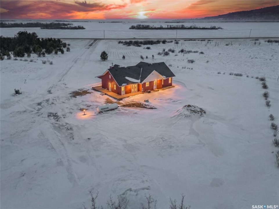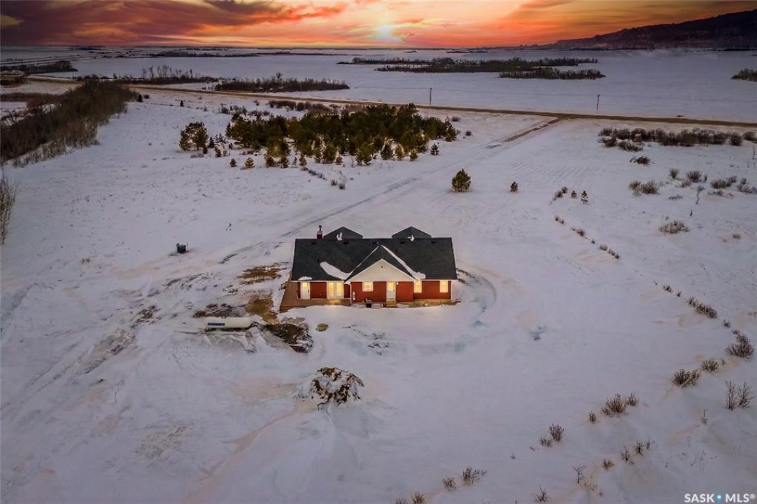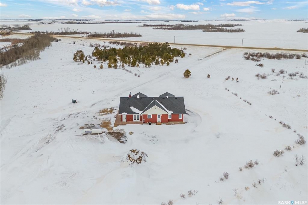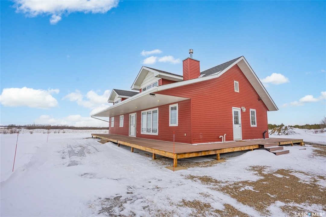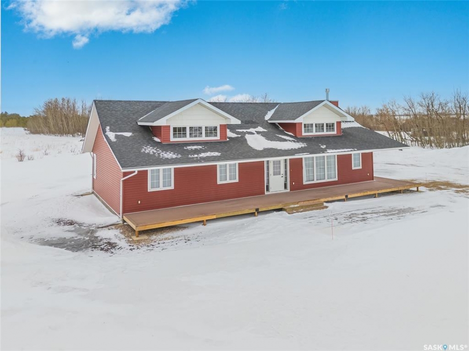 Welcome to this beautiful 2014 Cape Cod style bungalow situated on 10 scenic acres just minutes from Saskatoon, Dalmeny, and Martensville, offering the perfect balance of peaceful acreage living and convenient access to the city with nearly all pavement via Highway 16. This former Pinnacle Homes show home features 1,618 sq ft of thoughtfully designed living space with soaring vaulted ceilings, large dormer windows, and a stunning floor to ceiling stone fireplace that anchors the bright, open living area. The spacious kitchen is ideal for entertaining with a peninsula island, quartz countertops, tile backsplash, stainless steel appliances, and a corner pantry with excellent storage, while durable laminate and tile flooring run throughout the home with no carpet anywhere. The layout includes three bedrooms and a large mudroom that could easily be reconfigured by relocating laundry to the adjacent 3-piece bathroom. A 4-foot crawl space basement provides abundant usable storage, and outside you'll find a wraparound deck overlooking the property, with railing included should the new owner wish to install it, though the deck sits less than two feet from the ground. The 10-acre parcel offers a great mix of mature trees and open pasture with subdivision currently in process, a well with outdoor hydrant and tap, and the home currently supplied by a large cistern with the option to switch to the well if desired. The home is heated by propane with very low annual heating costs, and buyers also have the option to incorporate a dream garage into their mortgage through a purchase-plus-improvements program, making this a rare opportunity to own a flexible, beautifully designed acreage property with endless possibilities just minutes from the city! Welcome to your dream prairie acreage!