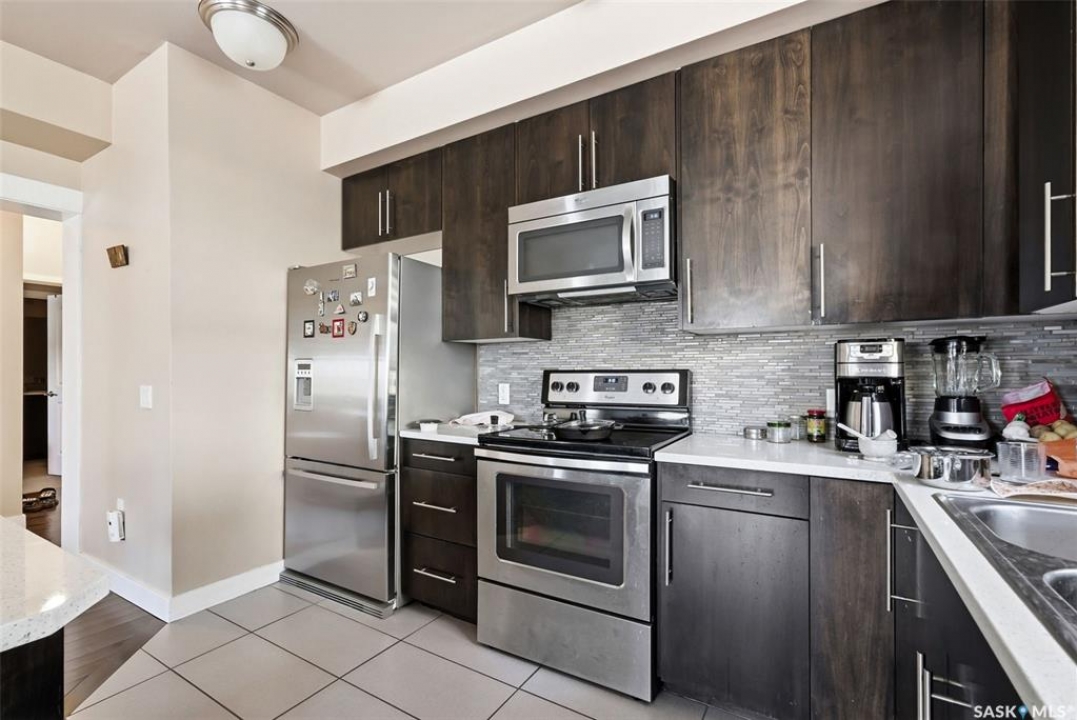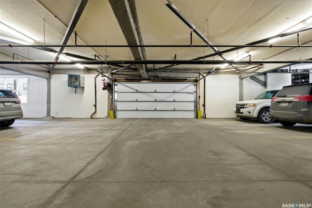 Welcome to The Strathmore located in Regina's desirable Cathedral neighbourhood, perfectly situated in the heart of the city. This 977 sq. ft. unit is located on the northeast side of the building and offers 2 bedrooms and 2 bathrooms. Ideally located close to downtown amenities, it's perfect for downtown professionals or investors. The open-concept kitchen features modern Weckworth cabinetry with soft-close doors and drawers, white quartz countertops, stainless steel appliances and mosaic tile backsplash. The kitchen opens to the living room with engineered hardwood flooring and patio doors leading to a balcony with gas BBQ hookup. The primary bedroom includes a 5-piece ensuite with double sinks. A second bedroom, full main bathroom, and in-suite laundry complete the unit. Parking stall #22 in the indoor and heated parkade is included as well as storage unit #6. The building is wheelchair accessible with elevator access and secure intercom entry. There is also visitor parking available.