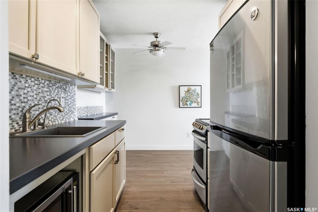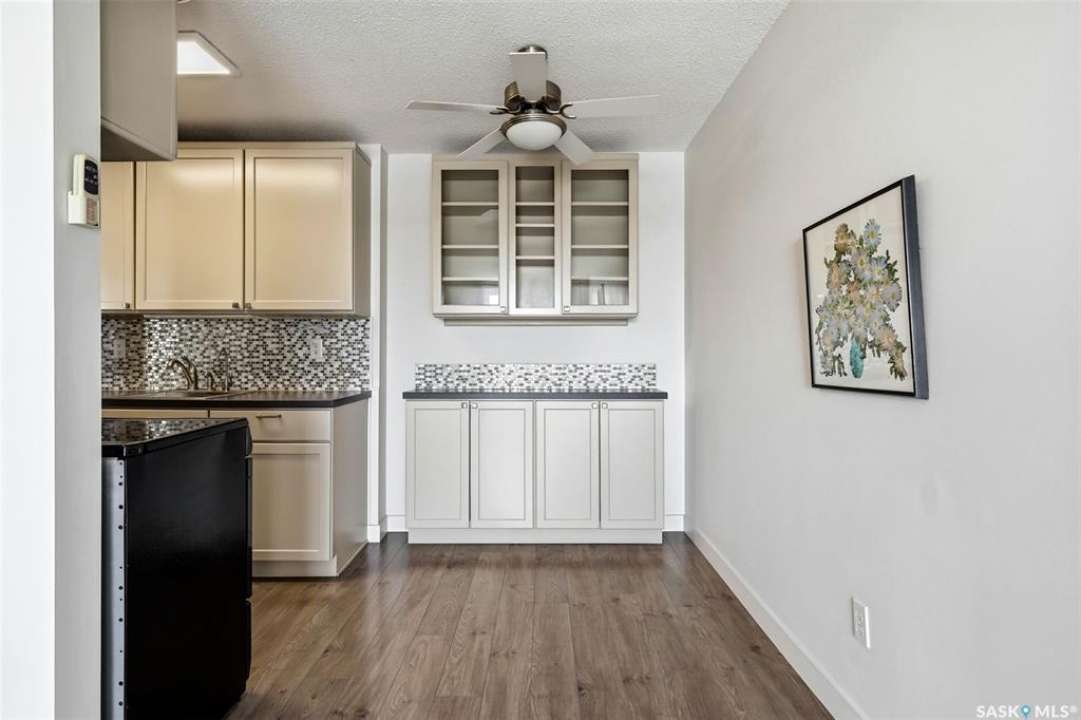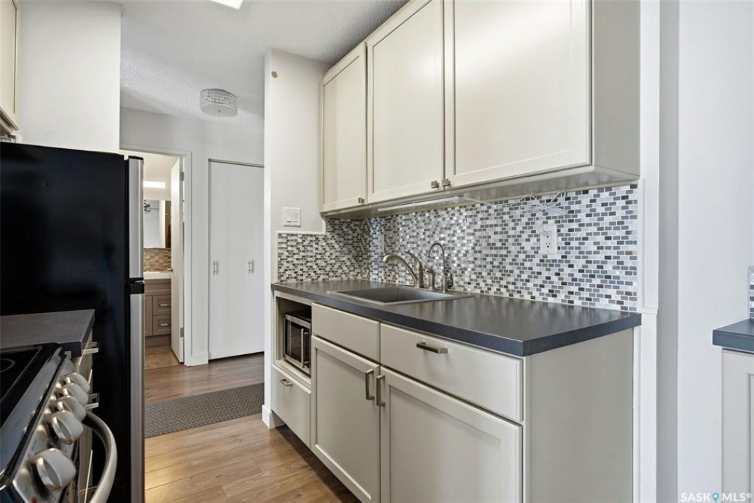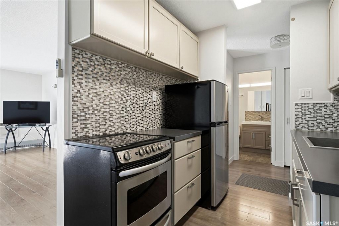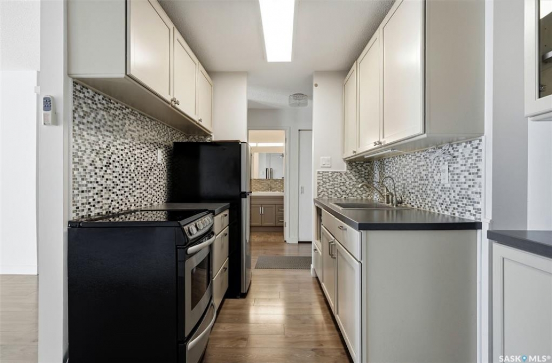 Excellent opportunity for a first-time buyer or investor. This gorgeous east-facing fourth-floor condo is well located and tastefully renovated, featuring modern laminate flooring throughout, updated lighting, an updated bathroom, and a beautifully designed custom kitchen with a matching built-in buffet in the dining area. The unit was freshly repainted in 2025 and is completely move-in ready. Bedroom window and balcony window/door were replaced in February 2024. The building elevator was replaced in 2019. Enjoy the solitude and security of fourth-floor living along with lovely morning light and views. Ideally located close to transit, Southland Mall, and all Albert Park/South Regina amenities. Residents enjoy access to excellent building amenities including a meeting room, party room, laundry room, and workshop. This unit also includes a good-sized storage space in the basement. Appliances are included. Condo fees include common area insurance, maintenance, lawn care, snow removal, as well as basic cable,in-unit heat, water, and sewer.