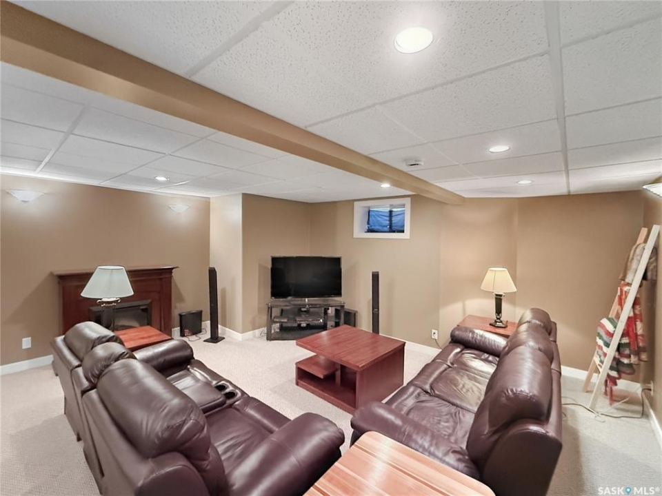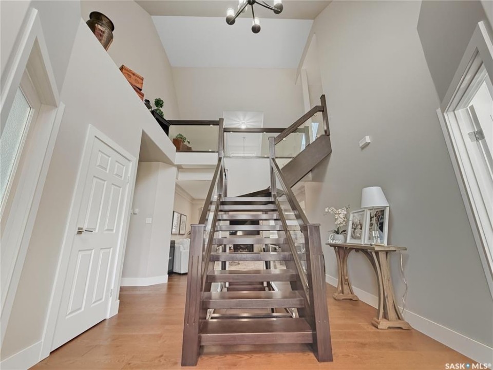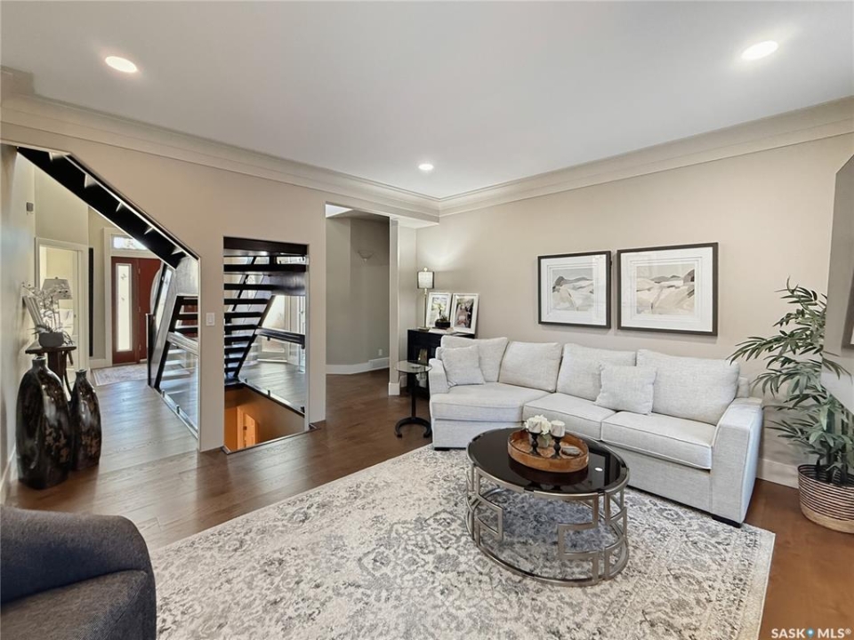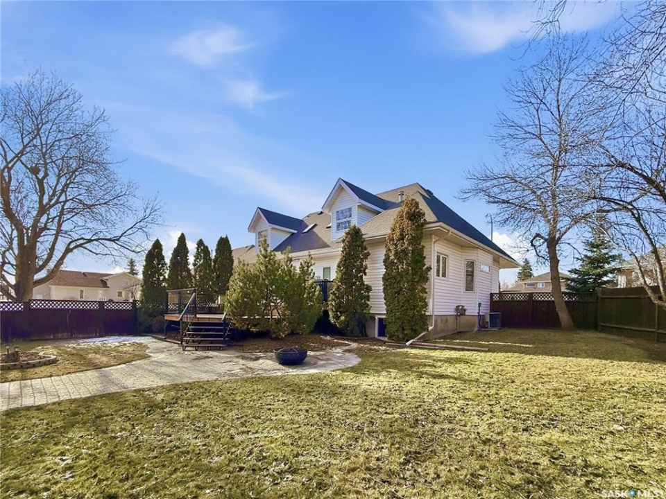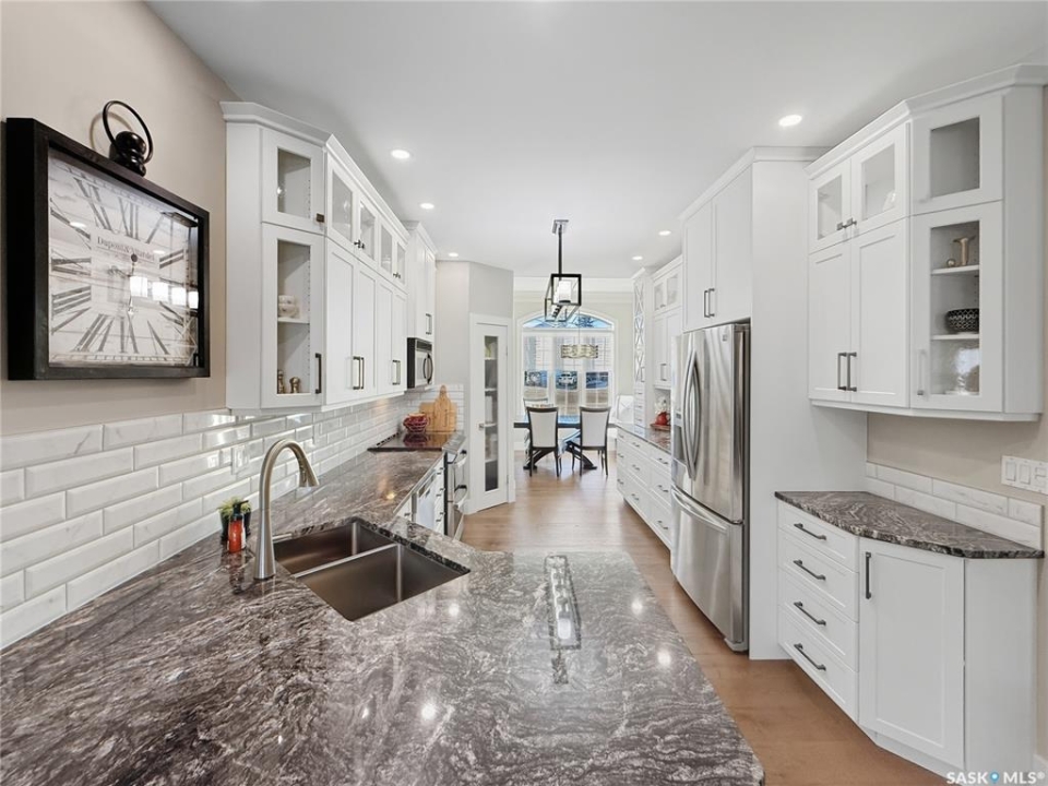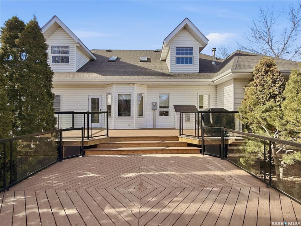 Executive two-storey home located on a quiet cul-de-sac in Swift Current's desirable North Hill neighbourhood. Situated on a mature, oversized pie-shaped lot, this beautifully maintained property offers over 2,400 sq ft above grade with a layout ideal for both everyday living and entertaining. A grand staircase welcomes you into an impressive foyer featuring 10' ceilings, crown moulding, and engineered hardwood flooring. The main floor includes a private office with French doors, a formal dining room filled with natural light, and a spacious living room with updated windows, quality blinds, silk curtains, and a cozy gas fireplace. The fully renovated kitchen (2019) showcases white cabinetry, granite countertops, tile backsplash, under-cabinet lighting, and stainless steel appliances including a double-oven slide-in range. A sit-up peninsula and bright east-facing dining nook provide access to the composite deck and backyard. Main floor laundry, a powder room, and direct entry to the attached garage add everyday convenience. The main floor primary suite offers privacy with a walk-in closet and renovated ensuite featuring granite counters, an oversized custom shower, and a corner jetted tub. Upstairs features a large family room with skylights overlooking the foyer, two spacious bedrooms with a generous Jack & Jill closet, and a full bathroom. The fully developed lower level includes a family room, two bedrooms, a three-piece bath, dance studio/flex space, storage rooms, and access to the lower-level garage. Parking and storage are exceptional with a front attached double garage plus a second garage with alley access—ideal for extra vehicles, hobbies, or workshop space. The private east-facing backyard offers mature landscaping, an oversized tiered composite deck, underground sprinklers on timers, and space to build an additional garage if desired. Shingles replaced in 2024.