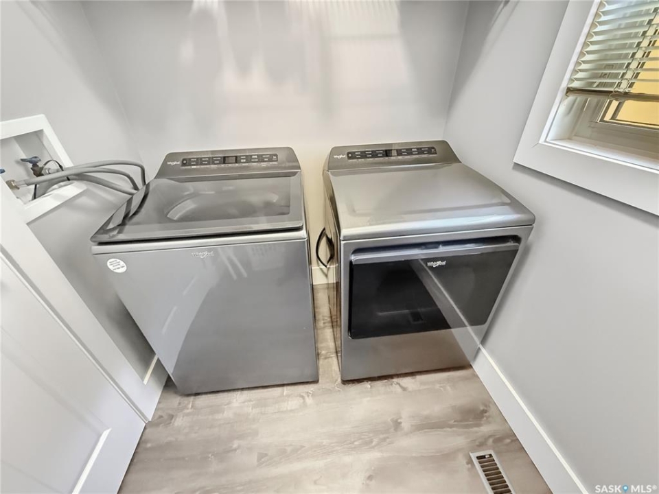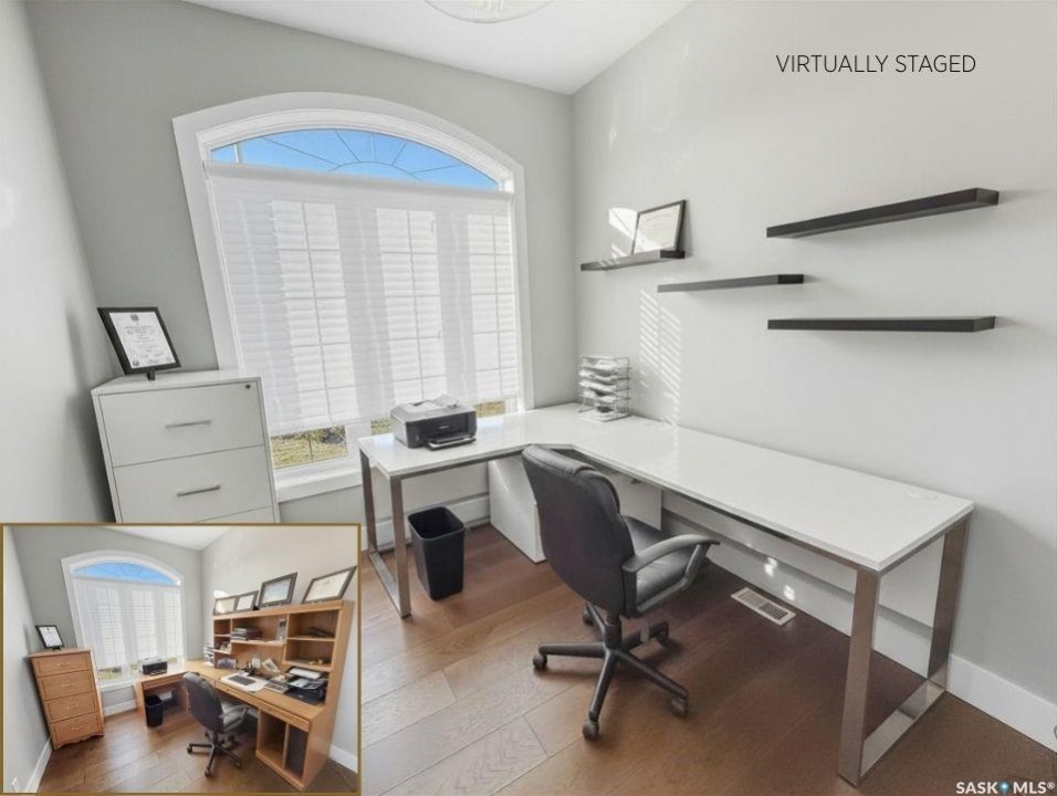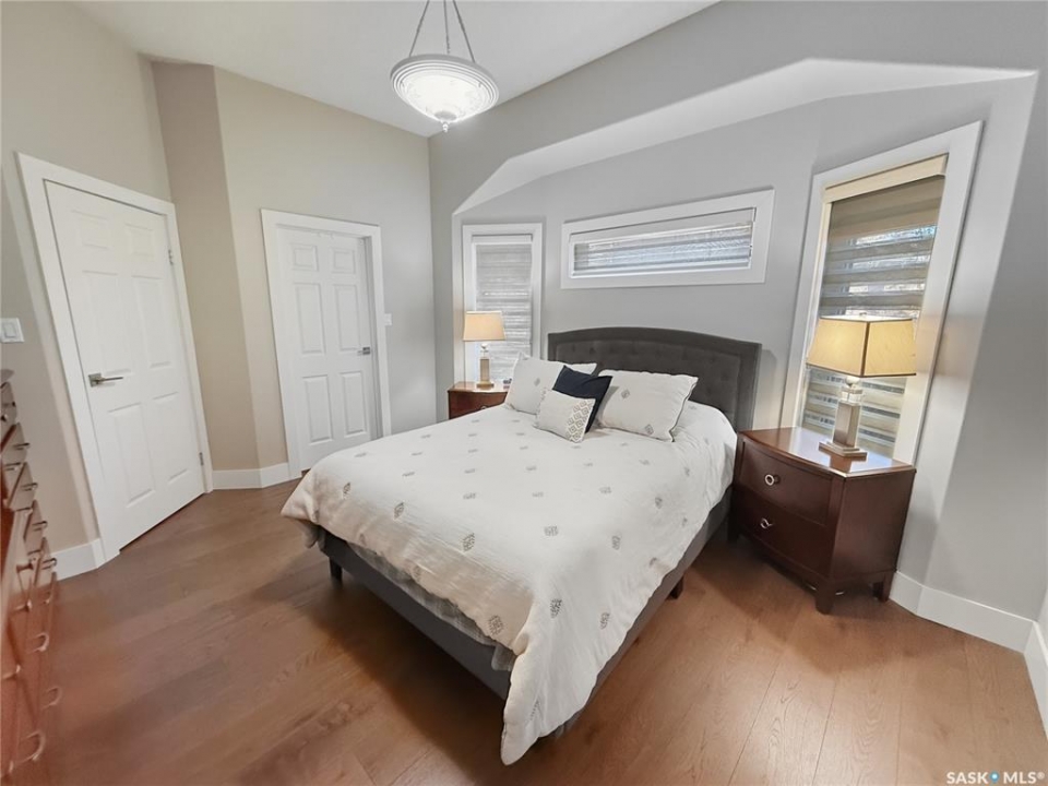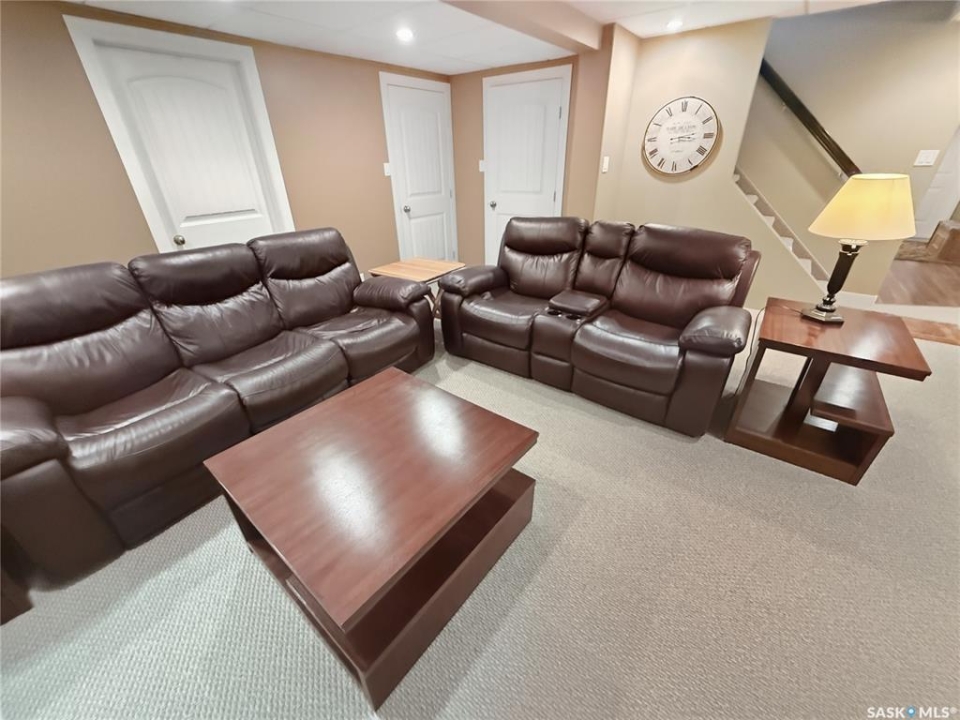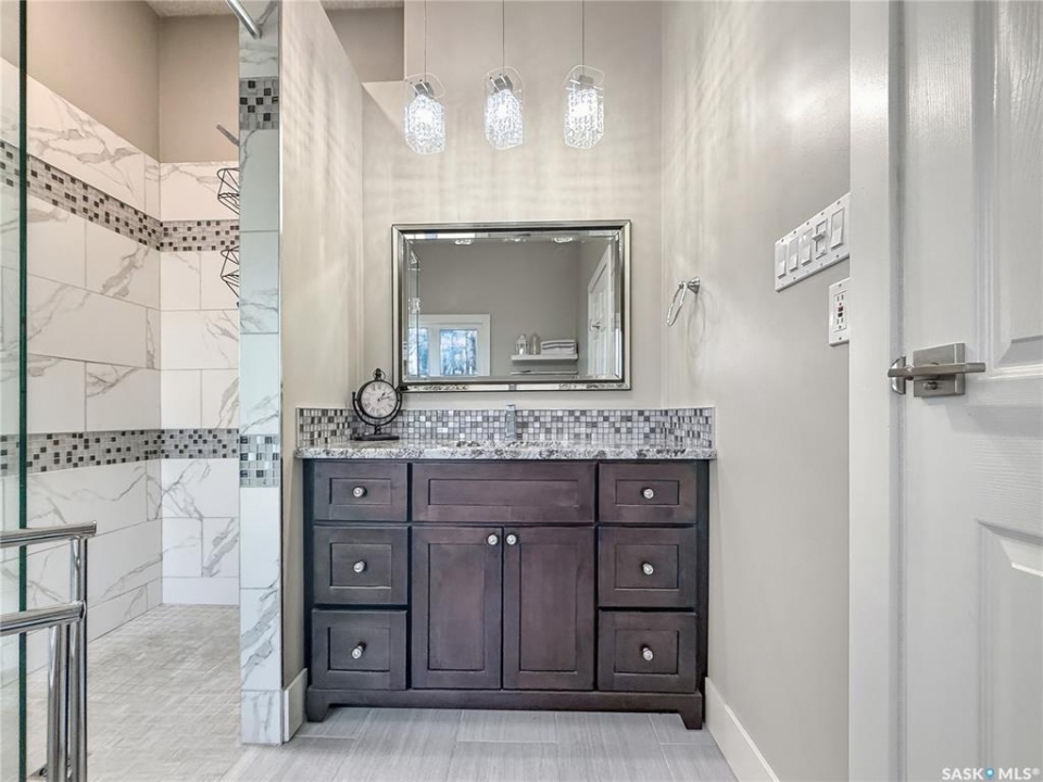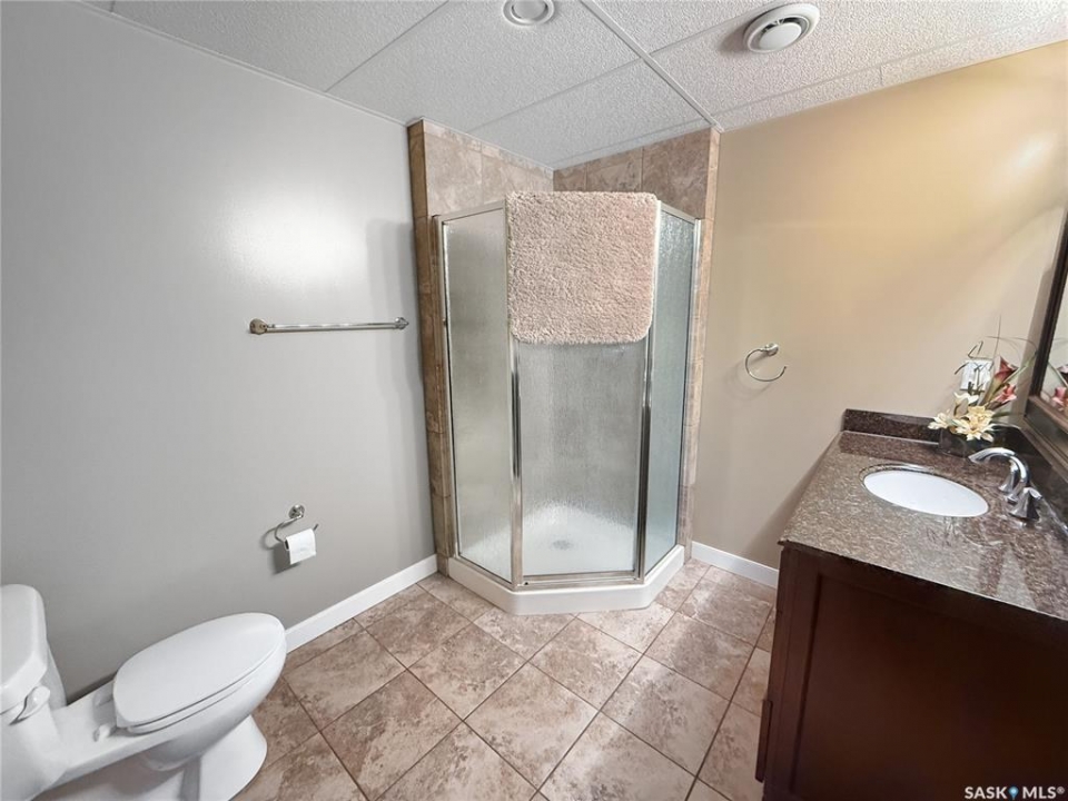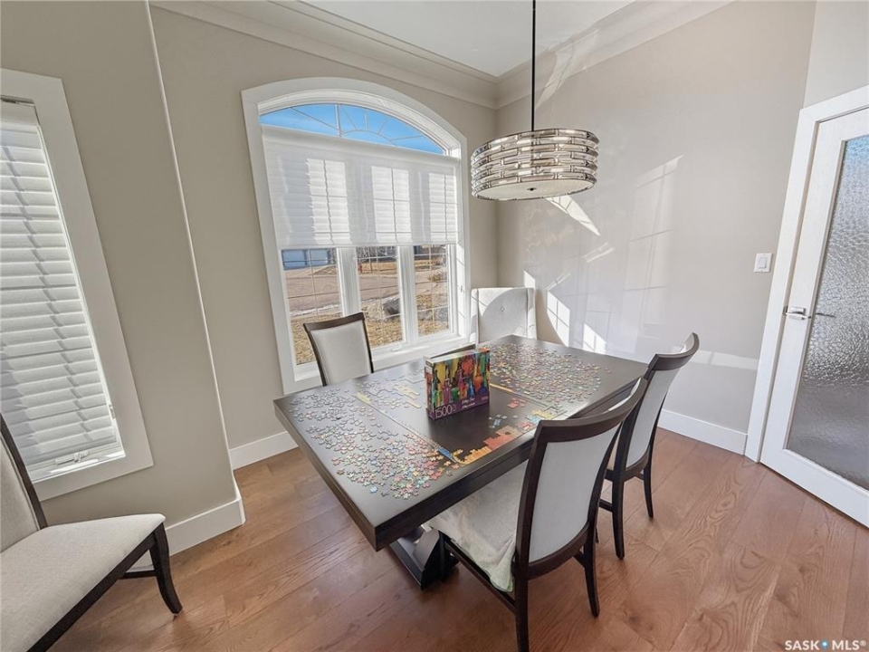 Executive two-storey home located on a quiet cul-de-sac in Swift Current's desirable North Hill neighbourhood. Situated on a mature, oversized pie-shaped lot, this beautifully maintained property offers over 2,400 sq ft above grade with a layout ideal for both everyday living and entertaining. A grand staircase welcomes you into an impressive foyer featuring 10' ceilings, crown moulding, and engineered hardwood flooring. The main floor includes a private office with French doors, a formal dining room filled with natural light, and a spacious living room with updated windows, quality blinds, silk curtains, and a cozy gas fireplace. The fully renovated kitchen (2019) showcases white cabinetry, granite countertops, tile backsplash, under-cabinet lighting, and stainless steel appliances including a double-oven slide-in range. A sit-up peninsula and bright east-facing dining nook provide access to the composite deck and backyard. Main floor laundry, a powder room, and direct entry to the attached garage add everyday convenience. The main floor primary suite offers privacy with a walk-in closet and renovated ensuite featuring granite counters, an oversized custom shower, and a corner jetted tub. Upstairs features a large family room with skylights overlooking the foyer, two spacious bedrooms with a generous Jack & Jill closet, and a full bathroom. The fully developed lower level includes a family room, two bedrooms, a three-piece bath, dance studio/flex space, storage rooms, and access to the lower-level garage. Parking and storage are exceptional with a front attached double garage plus a second garage with alley access—ideal for extra vehicles, hobbies, or workshop space. The private east-facing backyard offers mature landscaping, an oversized tiered composite deck, underground sprinklers on timers, and space to build an additional garage if desired. Shingles replaced in 2024.