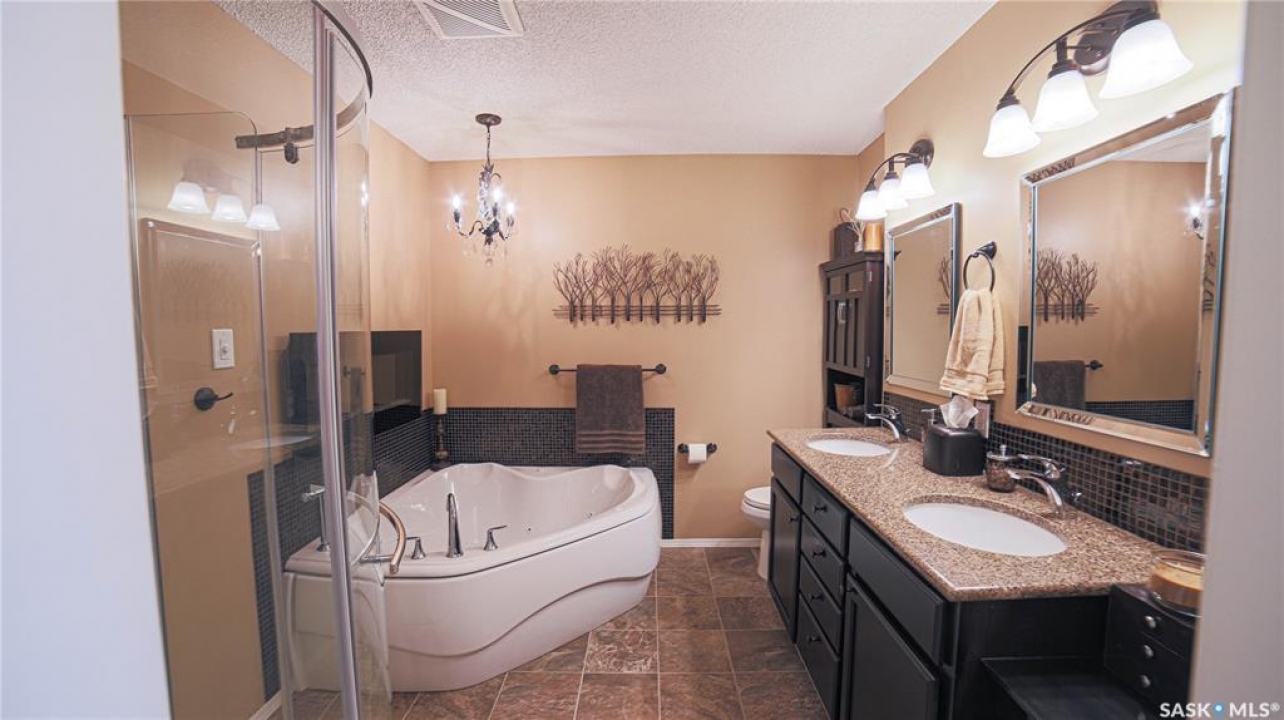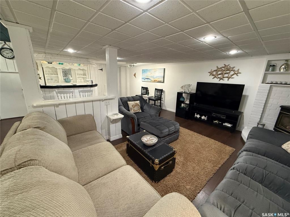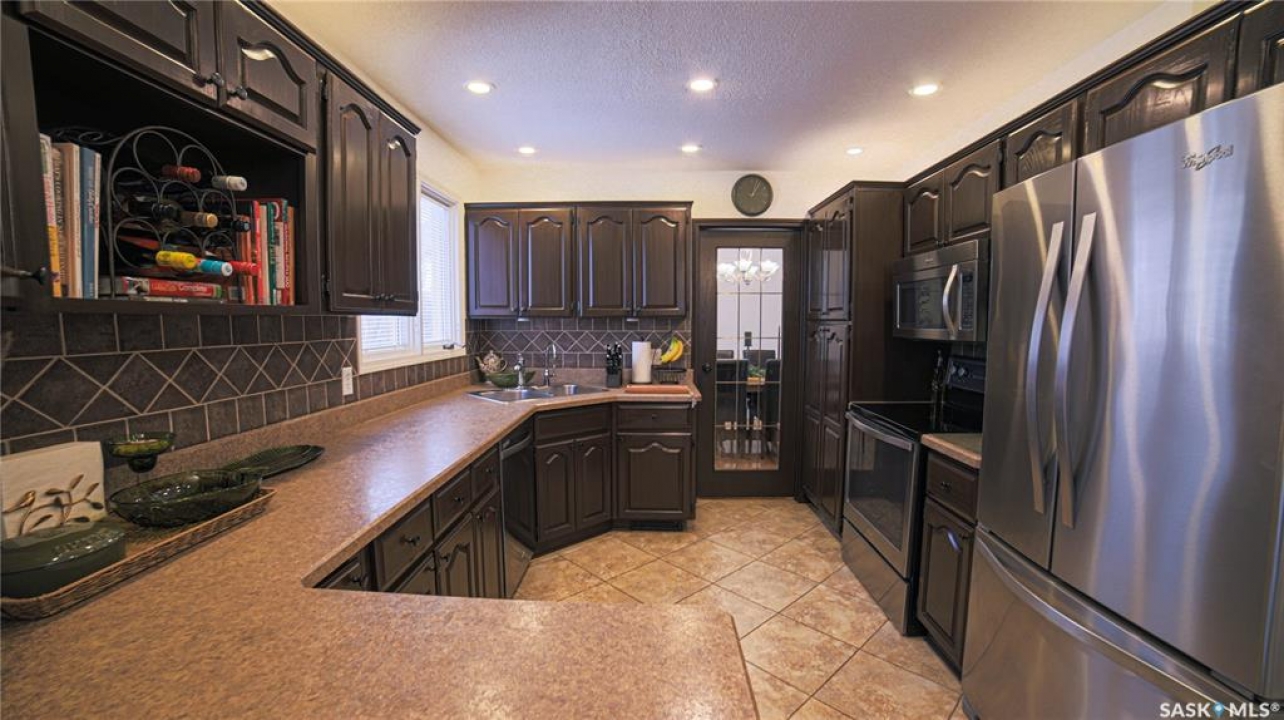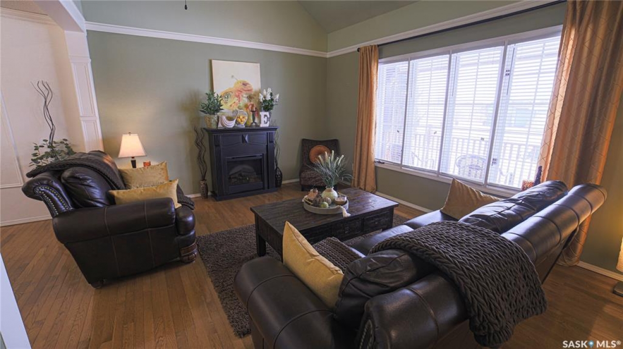 This exceptional home is a rare find in one of Estevan's most desirable neighbourhoods. Offering over 2,000 sq. ft. of living space above grade, this beautifully maintained property stands apart from the ordinary with its thoughtful layout and immaculate condition inside and out. Step into the spacious front foyer where you're immediately welcomed by soaring vaulted ceilings in the bright front living room, creating an impressive first impression. The living room flows seamlessly into the large formal dining area, perfect for entertaining. The eat-in kitchen is ideally situated between the dining room and a cozy secondary living space, providing the perfect spot to relax with family. From here, patio doors lead to the incredible backyard featuring a covered deck, mature trees, and lush foliage that creates exceptional privacy throughout the summer months. A convenient two-piece powder room and direct access to the attached double garage complete the main floor. Upstairs you'll find three generous bedrooms plus a versatile bonus room that would make an ideal playroom, office, or hobby space. The spacious primary suite features a walk-in closet and a stunning five-piece ensuite complete with a heated whirlpool tub. A second full bathroom and conveniently located laundry complete the upper level. The fully developed basement is an entertainer's dream, offering a large gathering space perfect for a dining area or pool table, a wet bar, comfortable family room with gas stove, and an additional two-piece bathroom. It's large enough for hosting gatherings while still providing a cozy space for family movie nights. Meticulously maintained from top to bottom, this one-of-a-kind home offers space, comfort, and exceptional care in every detail.