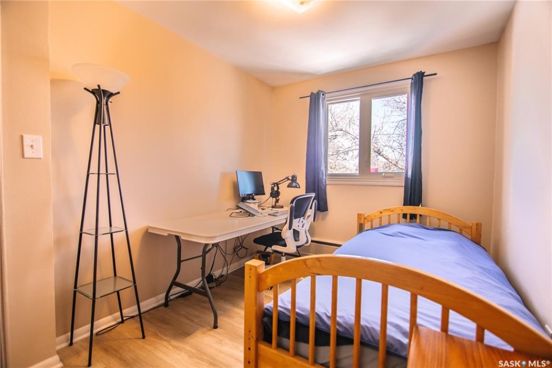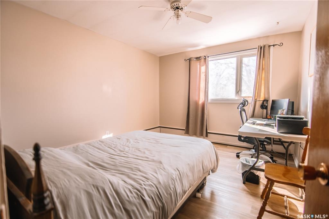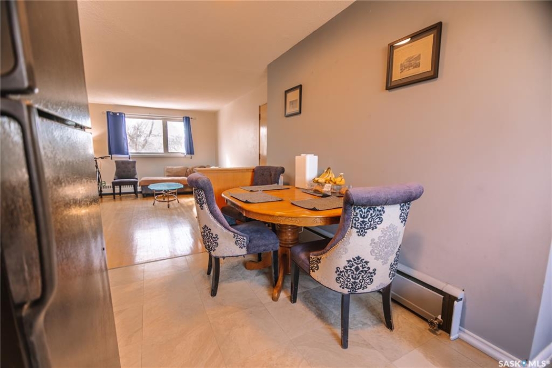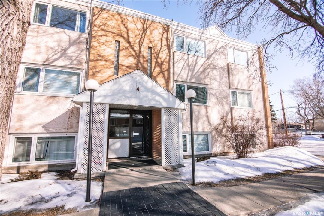 Located in an exceptional south Regina location just steps from the scenic walking and biking paths of Wascana Park and the family-friendly attractions of Candy Cane Park, this well-maintained two-bedroom, one-bathroom condo in Douglas Place offers comfortable living with excellent access to outdoor recreation and city amenities. Situated on the top floor, this unit benefits from added privacy and an abundance of natural light that fills the living spaces throughout the day. Upon entering the suite, you are welcomed into a spacious living room featuring hardwood flooring and large windows that create a bright and inviting atmosphere. The adjoining kitchen offers ample cabinet and counter space providing a functional layout for everyday cooking and entertaining. The unit features two well-sized bedrooms, offering flexibility for a guest room, home office, or additional living space. A full four-piece bathroom completes the interior layout. The courtyard includes a deck and BBQ area available for owners to use, adding to the community atmosphere of the complex. One electrified parking stall is included with the unit, and the monthly condo fees are a reasonable $350, helping keep ownership affordable while covering the maintenance of common areas and building amenities. Whether you are a first-time buyer, student, or someone looking to be close to Regina's beautiful Wascana Centre, this top-floor condo offers a great combination of location, value, and comfortable living.