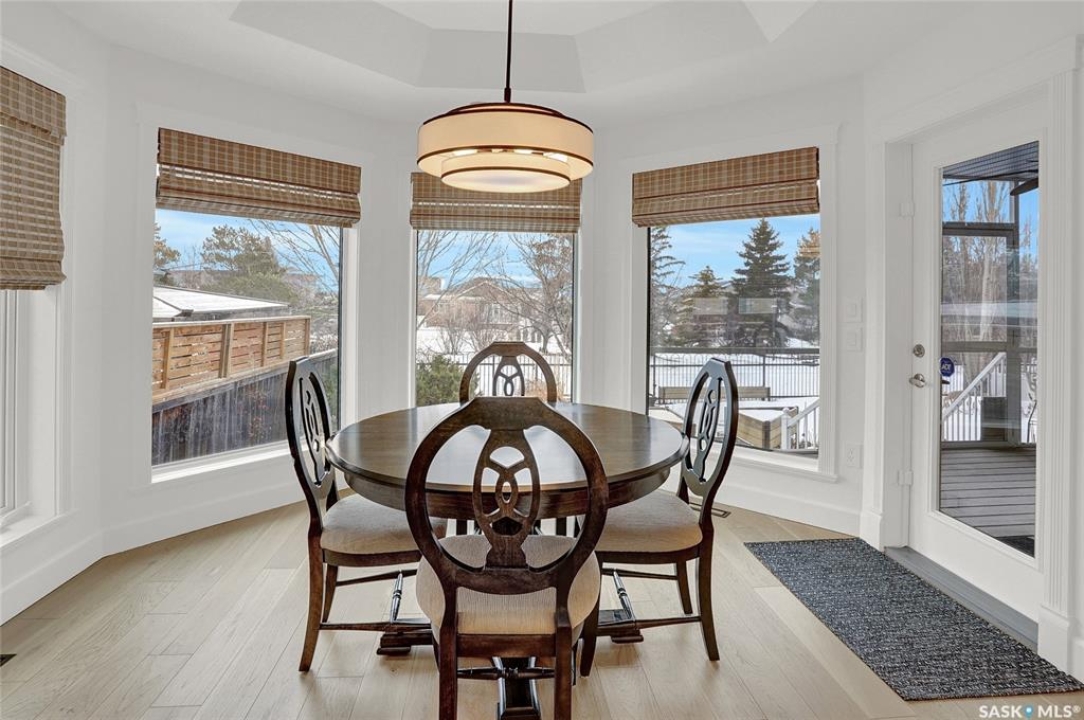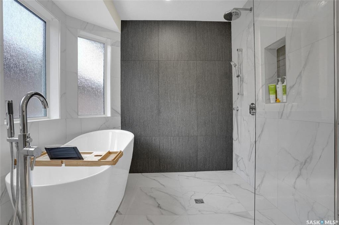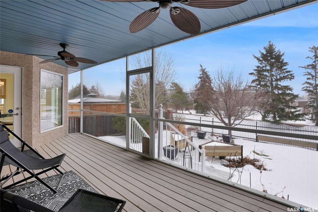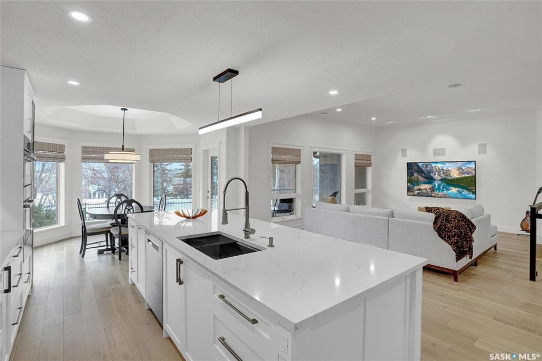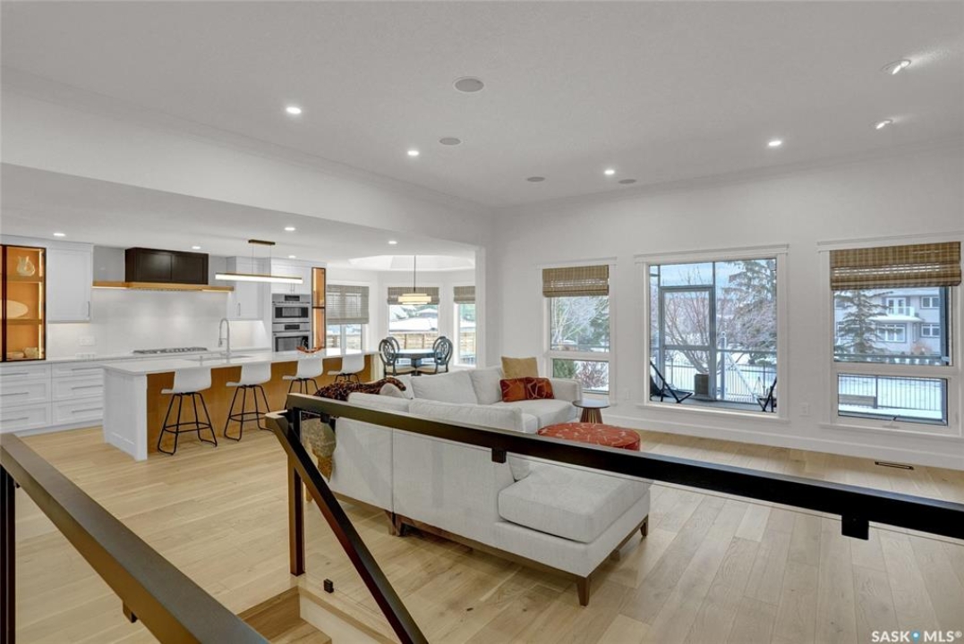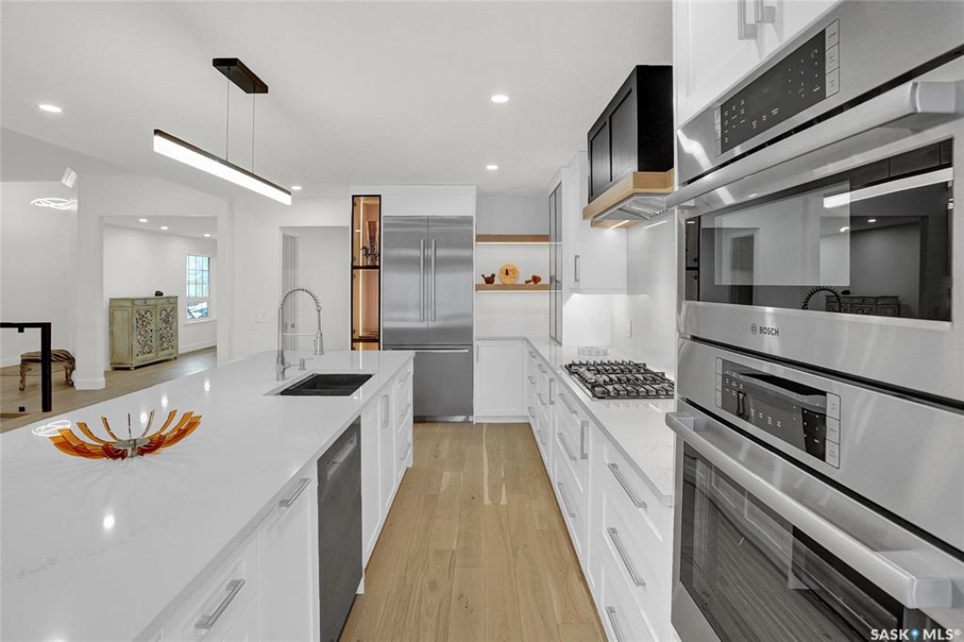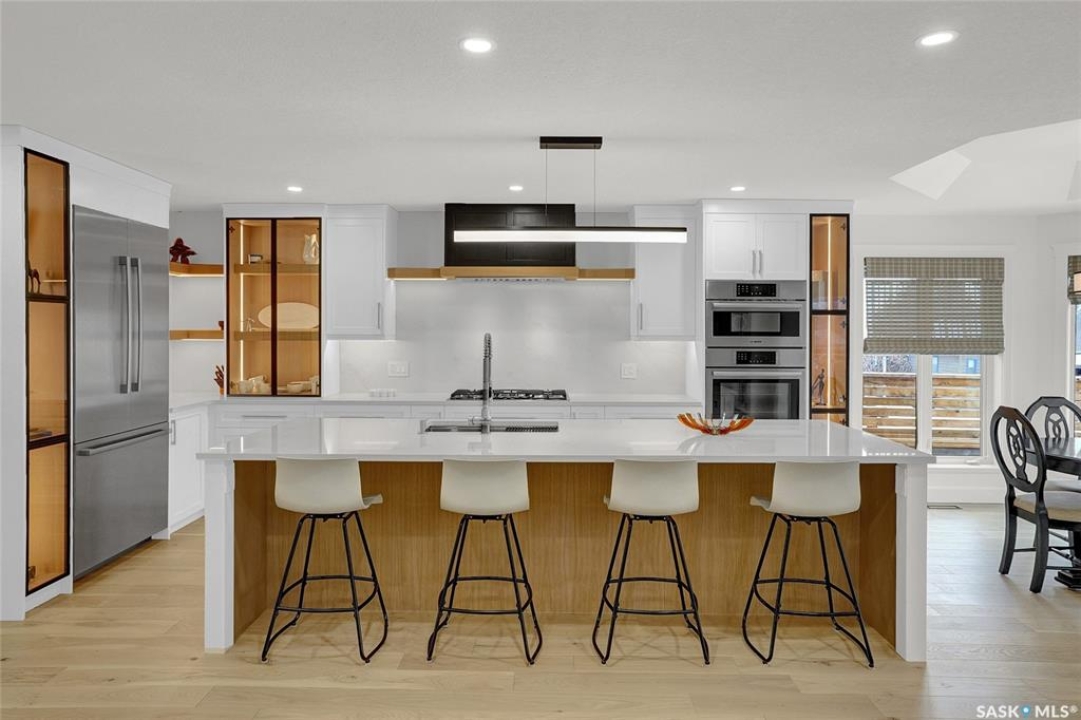 Absolutely stunning 1,922 sq. ft. bungalow backing onto a park in Wascana View. This beautifully updated home offers a bright, open-concept floor plan and has undergone extensive main floor renovations. The main level features all new flooring with white engineered oak by Burkhardt Bros., including custom stair nosing, along with new tile flooring in the bathrooms and mudroom. The completely renovated dream kitchen showcases custom cabinetry by Grace & Mave, a Kraus sink, large island with quartz countertops and quartz backsplash wall, glass accent cabinets, floating shelves, and high-end Bosch stainless steel appliances including a gas cooktop. A spacious eating area overlooks the backyard and park, with a garden door leading to a screened-in deck, perfect for relaxing or entertaining. A formal dining room or main floor office adds flexibility to the layout. The main floor also features all new lighting and updated 6-inch baseboards throughout. The large primary bedroom includes a custom Clutter-X closet and a beautifully renovated spa-like ensuite featuring a dual-sink vanity with automatic under-cabinet lighting, heated tile floors, large zero-entry glass shower, freestanding tub, and private water closet. The second bedroom offers two closets and direct access to the main floor stylish three-piece bathroom. New glass railing, new woodwork and white oak HW on stairs to lower level that is partially developed with a third bedroom, den, and full bathroom offering plenty of additional living space. Additional highlights include a spacious mudroom/laundry area with new tile flooring and cabinetry and direct entry to the insulated and drywalled double attached garage. This is truly a wonderful home in show home condition!