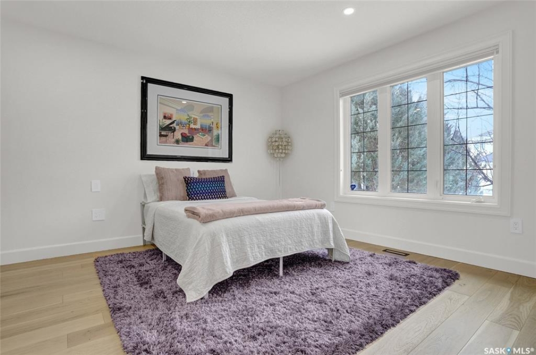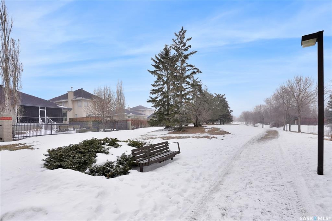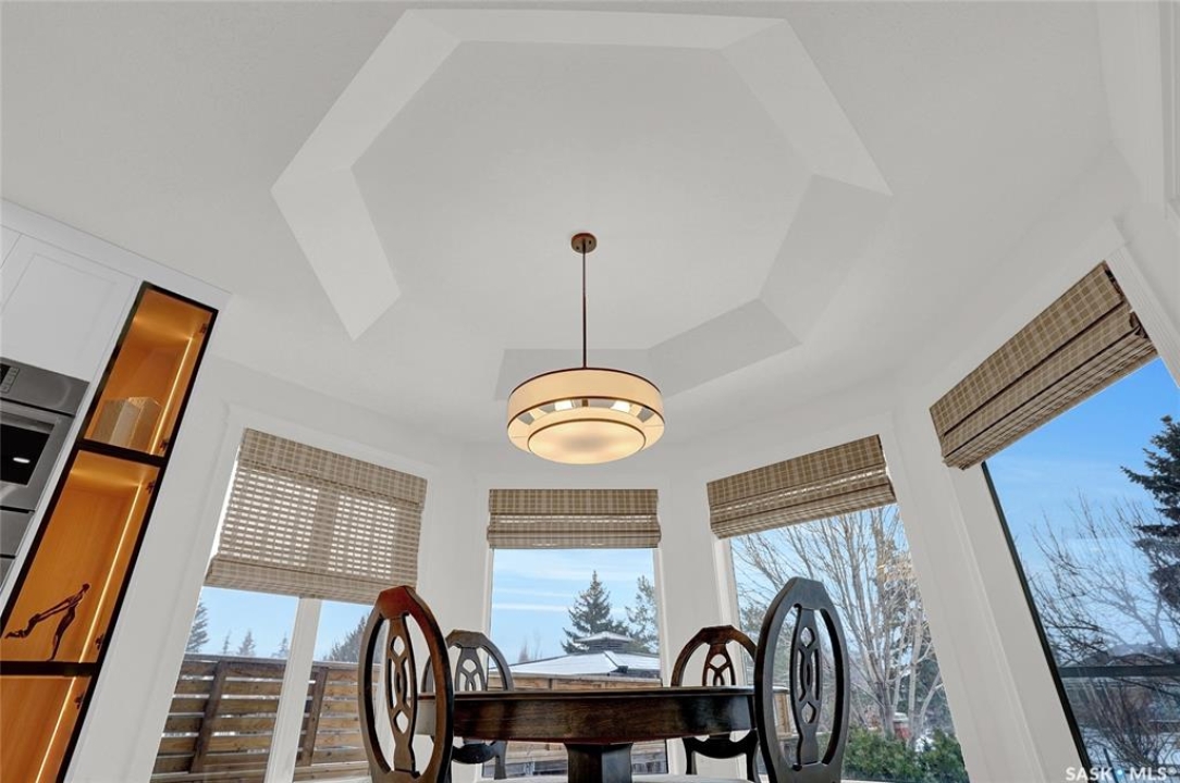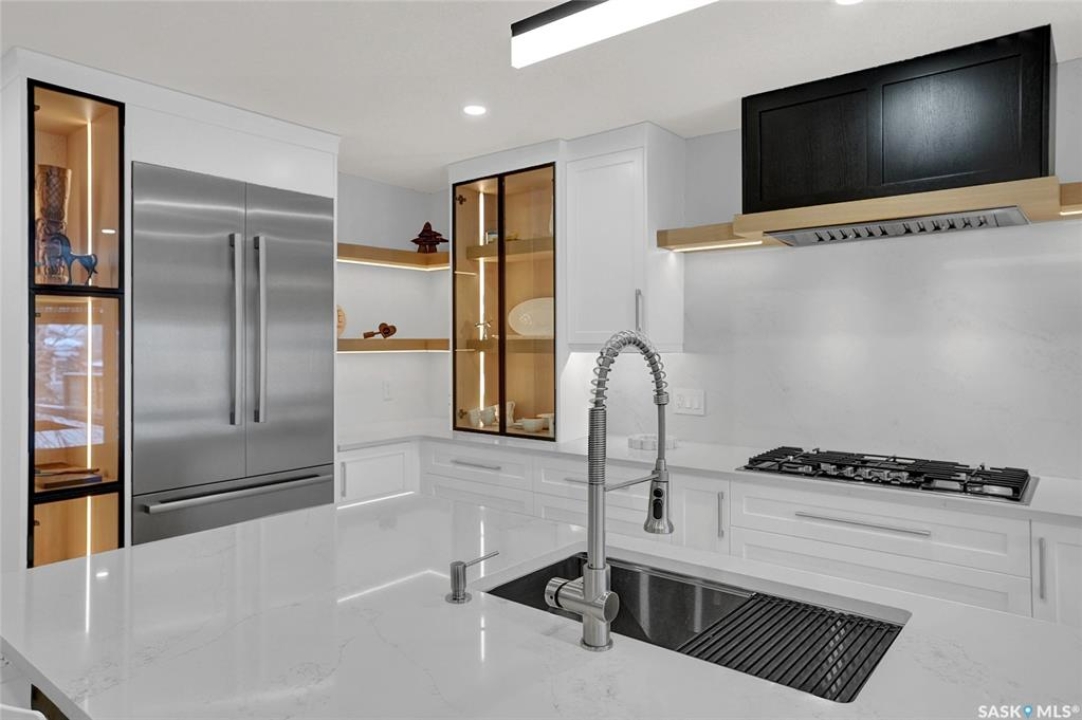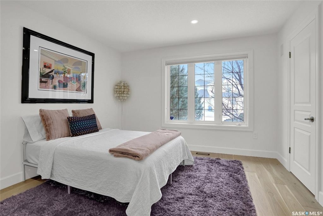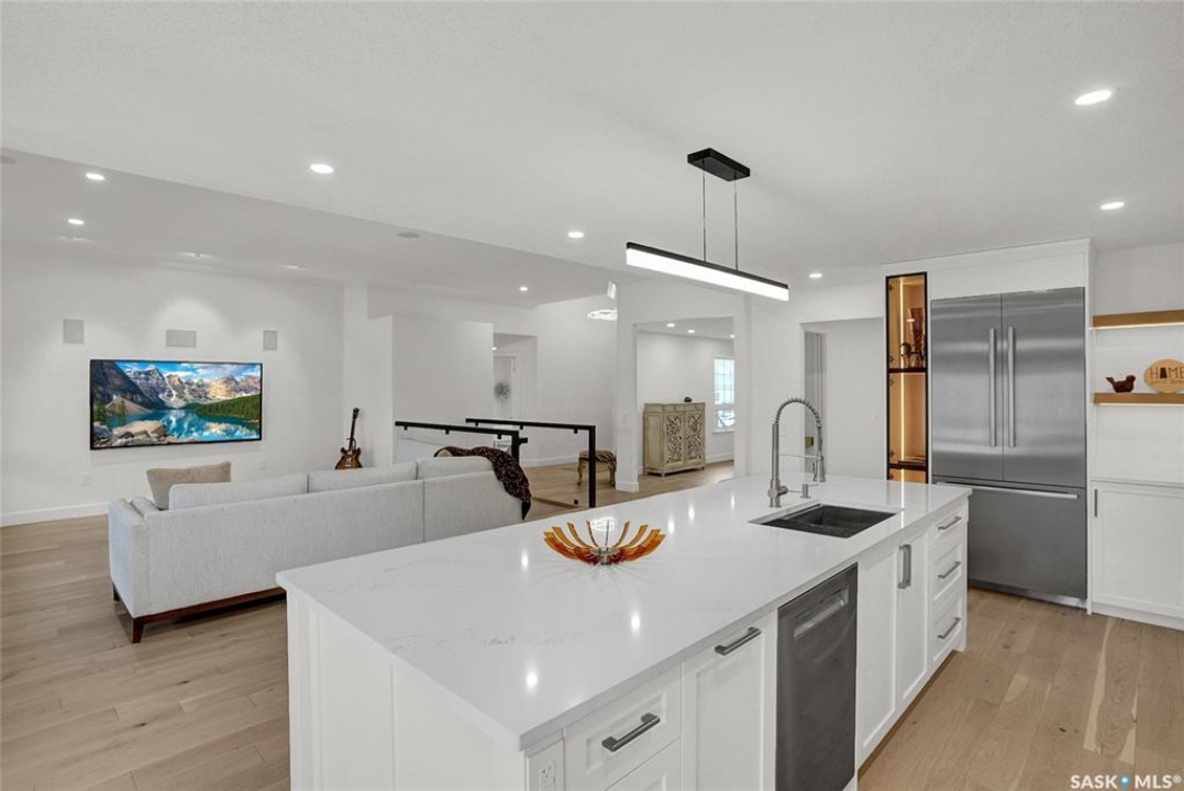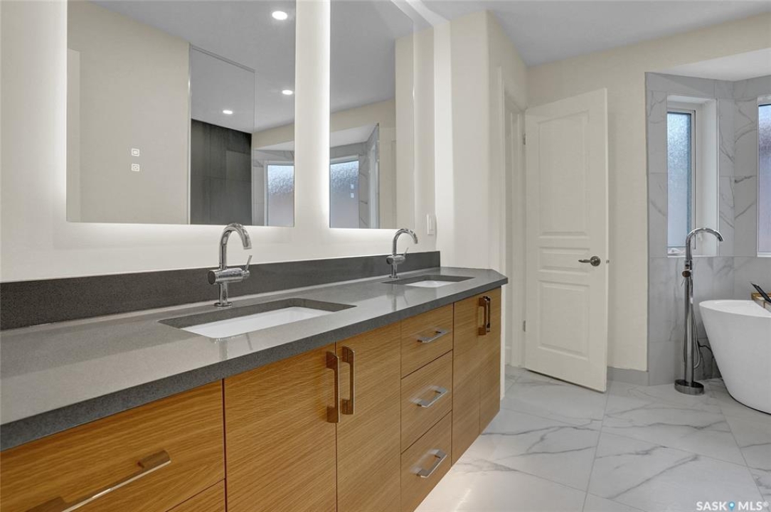 Absolutely stunning 1,922 sq. ft. bungalow backing onto a park in Wascana View. This beautifully updated home offers a bright, open-concept floor plan and has undergone extensive main floor renovations. The main level features all new flooring with white engineered oak by Burkhardt Bros., including custom stair nosing, along with new tile flooring in the bathrooms and mudroom. The completely renovated dream kitchen showcases custom cabinetry by Grace & Mave, a Kraus sink, large island with quartz countertops and quartz backsplash wall, glass accent cabinets, floating shelves, and high-end Bosch stainless steel appliances including a gas cooktop. A spacious eating area overlooks the backyard and park, with a garden door leading to a screened-in deck, perfect for relaxing or entertaining. A formal dining room or main floor office adds flexibility to the layout. The main floor also features all new lighting and updated 6-inch baseboards throughout. The large primary bedroom includes a custom Clutter-X closet and a beautifully renovated spa-like ensuite featuring a dual-sink vanity with automatic under-cabinet lighting, heated tile floors, large zero-entry glass shower, freestanding tub, and private water closet. The second bedroom offers two closets and direct access to the main floor stylish three-piece bathroom. New glass railing, new woodwork and white oak HW on stairs to lower level that is partially developed with a third bedroom, den, and full bathroom offering plenty of additional living space. Additional highlights include a spacious mudroom/laundry area with new tile flooring and cabinetry and direct entry to the insulated and drywalled double attached garage. This is truly a wonderful home in show home condition!