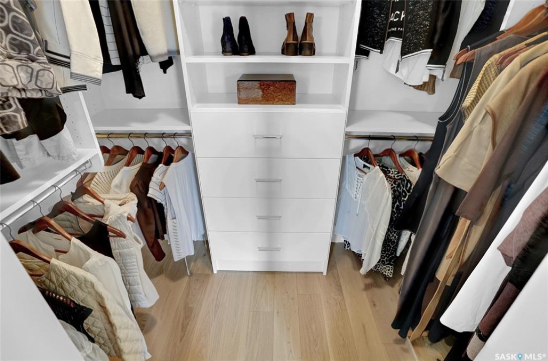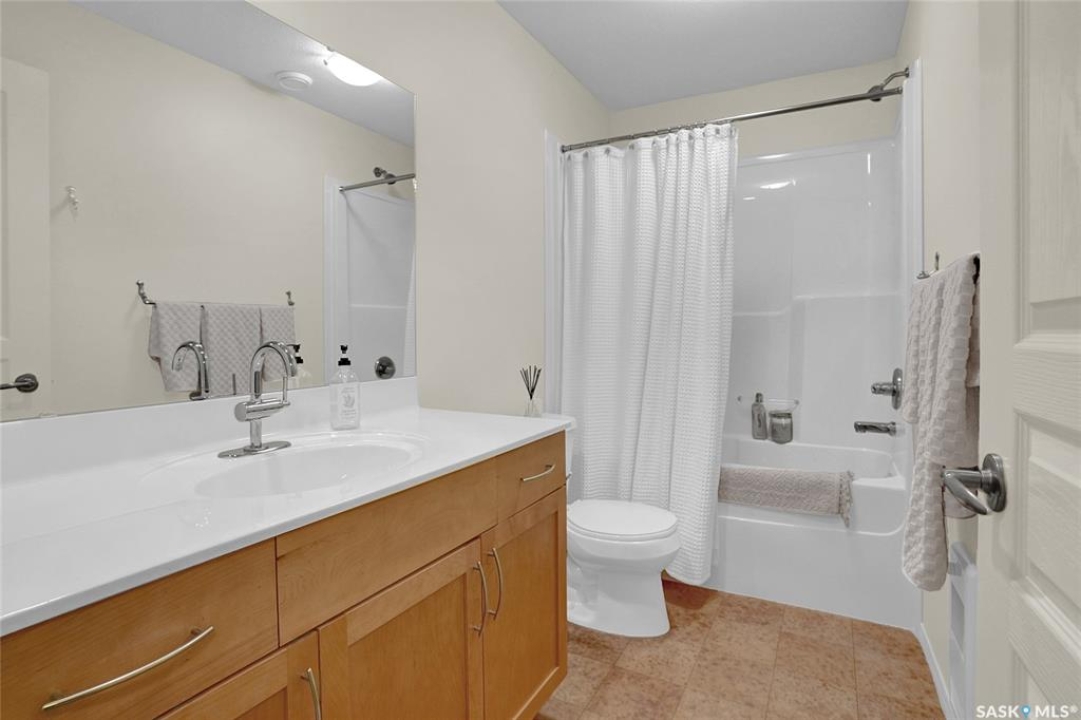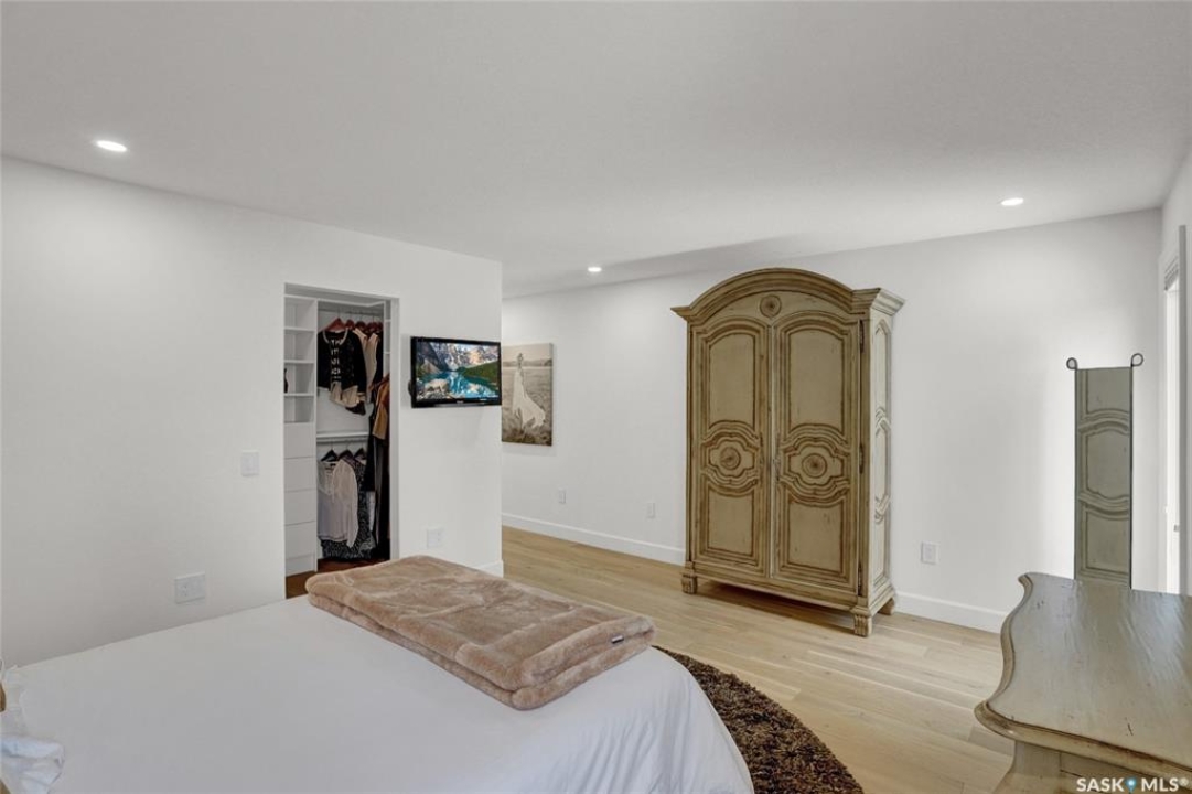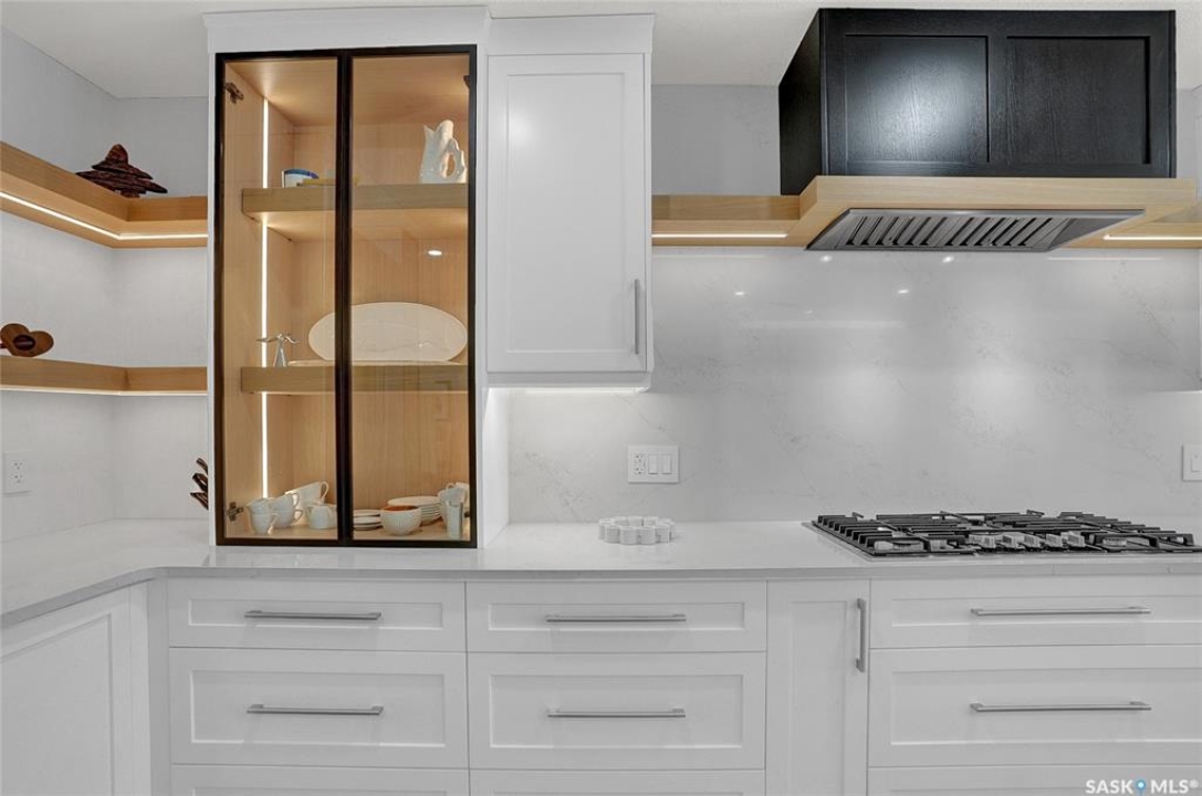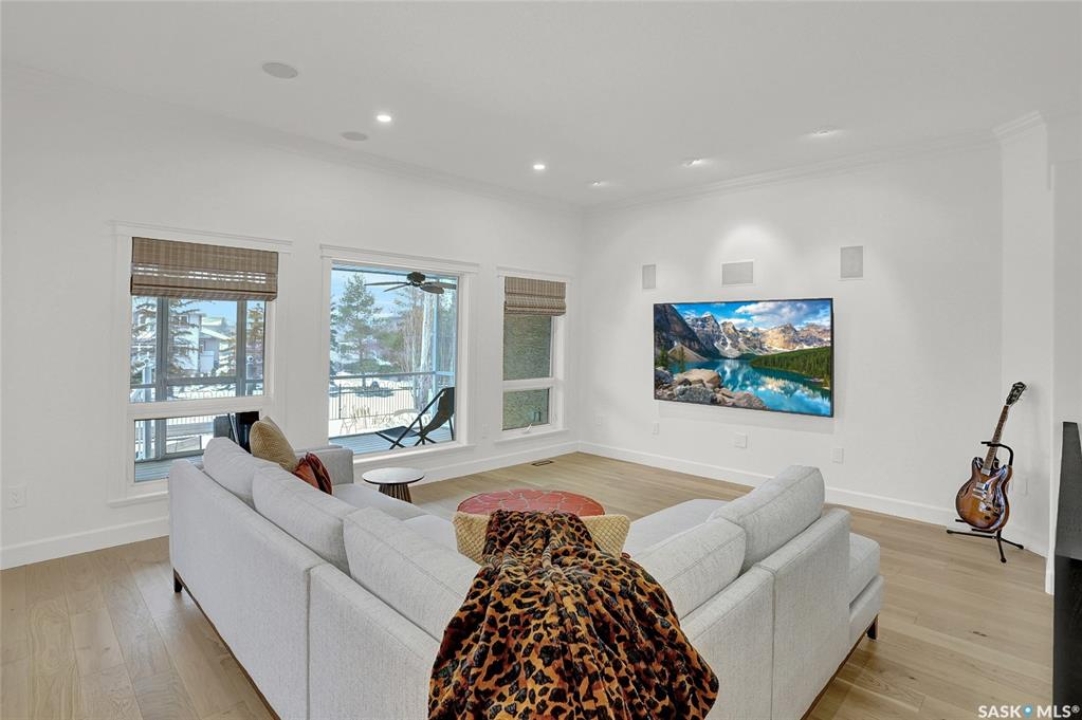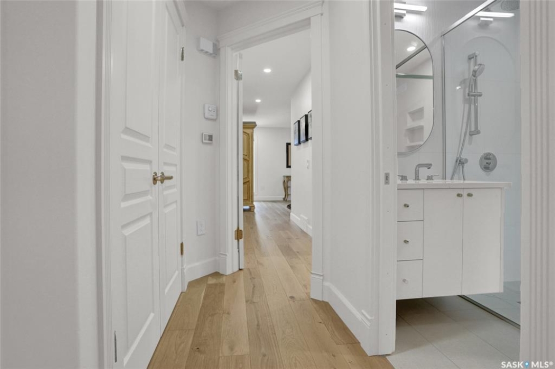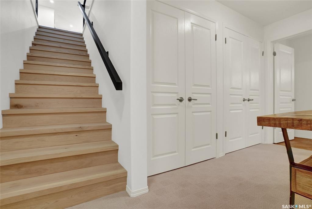 Absolutely stunning 1,922 sq. ft. bungalow backing onto a park in Wascana View. This beautifully updated home offers a bright, open-concept floor plan and has undergone extensive main floor renovations. The main level features all new flooring with white engineered oak by Burkhardt Bros., including custom stair nosing, along with new tile flooring in the bathrooms and mudroom. The completely renovated dream kitchen showcases custom cabinetry by Grace & Mave, a Kraus sink, large island with quartz countertops and quartz backsplash wall, glass accent cabinets, floating shelves, and high-end Bosch stainless steel appliances including a gas cooktop. A spacious eating area overlooks the backyard and park, with a garden door leading to a screened-in deck, perfect for relaxing or entertaining. A formal dining room or main floor office adds flexibility to the layout. The main floor also features all new lighting and updated 6-inch baseboards throughout. The large primary bedroom includes a custom Clutter-X closet and a beautifully renovated spa-like ensuite featuring a dual-sink vanity with automatic under-cabinet lighting, heated tile floors, large zero-entry glass shower, freestanding tub, and private water closet. The second bedroom offers two closets and direct access to the main floor stylish three-piece bathroom. New glass railing, new woodwork and white oak HW on stairs to lower level that is partially developed with a third bedroom, den, and full bathroom offering plenty of additional living space. Additional highlights include a spacious mudroom/laundry area with new tile flooring and cabinetry and direct entry to the insulated and drywalled double attached garage. This is truly a wonderful home in show home condition!