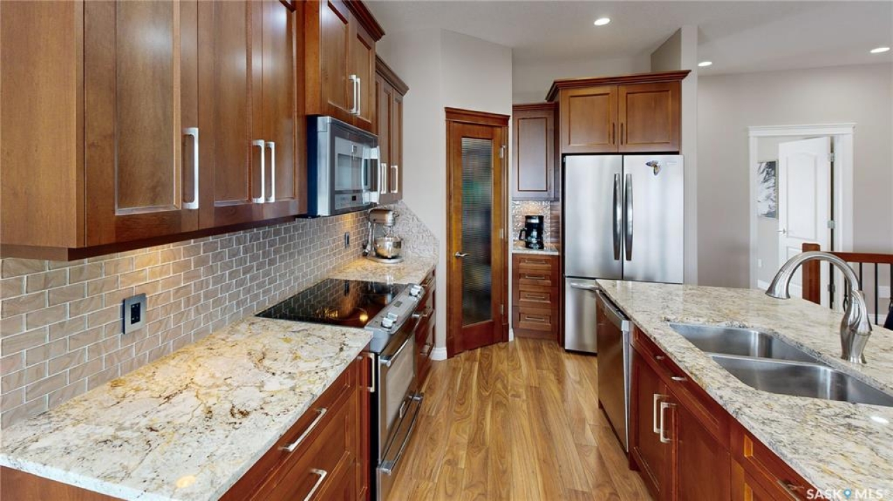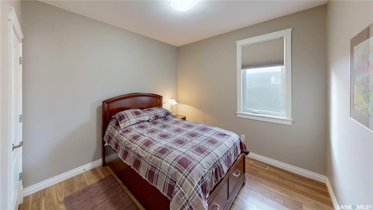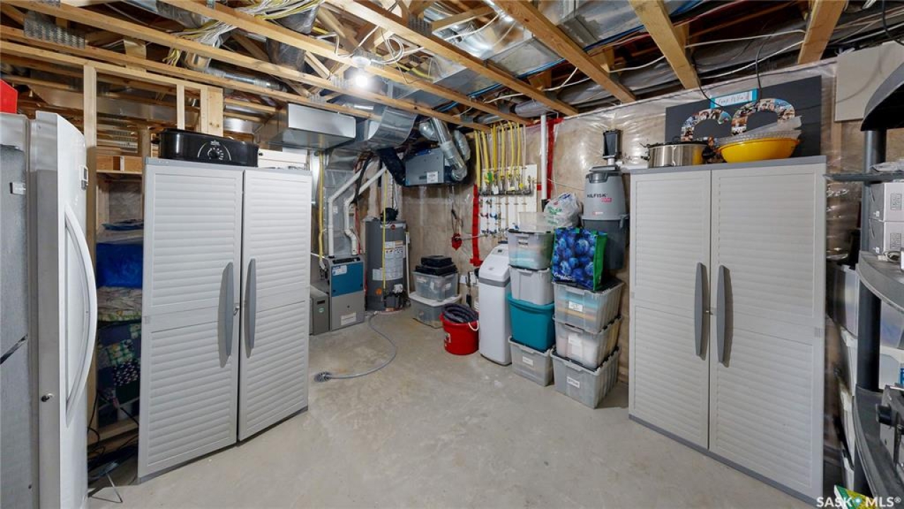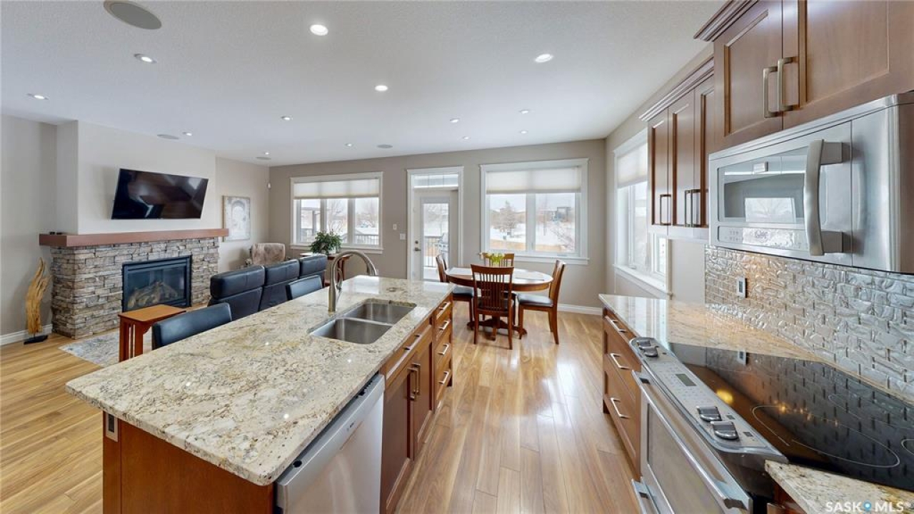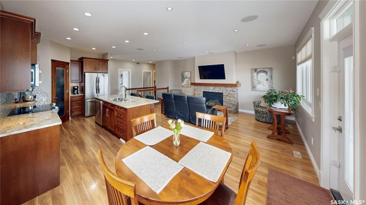 This 1,381 sq ft bungalow is ideally positioned on a quiet, low-traffic bay with a park directly behind—something the current owners have especially appreciated as it provides a safe setting for kids to play. The home was custom-built in 2013 by Ripplinger and offers 3 bedrooms and 2 bathrooms on the main level, along with an additional bedroom and bathroom partially developed downstairs. The front yard is professionally landscaped with underground sprinklers. There's a 24 x 26 attached garage which is heated and insulated, featuring 14 ft ceilings (great for anyone considering a car lift), a 220 volt plug-in, and a full drain pit connected to the sewer. The fully fenced backyard is also professionally landscaped and features a stone wall, underground sprinklers, a covered deck, natural gas BBQ hookup, exposed aggregate patio, and an included storage shed. Inside, the living room features laminate flooring and 9 ft ceilings that continue throughout the main level. There are LED pot lights, a built-in speaker system (also connected to the primary bedroom and deck), and a natural gas fireplace. The open layout flows into the dining area and kitchen, complete with soft-close drawers, corner pantry, glass tile backsplash, granite countertops, an island with bar seating, and included stainless steel appliances. The main floor continues with a bedroom, followed by the laundry room with included washer and dryer, another bedroom, and a 4-piece bathroom with ceramic tile heated flooring. The primary suite features a walk-in closet and a 4-piece ensuite, also with ceramic tile heated flooring. Downstairs, the partially finished basement offers excellent potential for future development, including a large rec room, framed bedroom, additional den or storage area, and bathroom. There is also roughed-in plumbing for a future bar area if desired. The mechanical room includes a 200 amp electrical panel, owned water softener, gas water heater and high efficiency furnace.