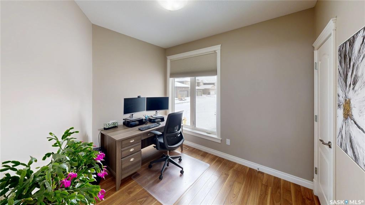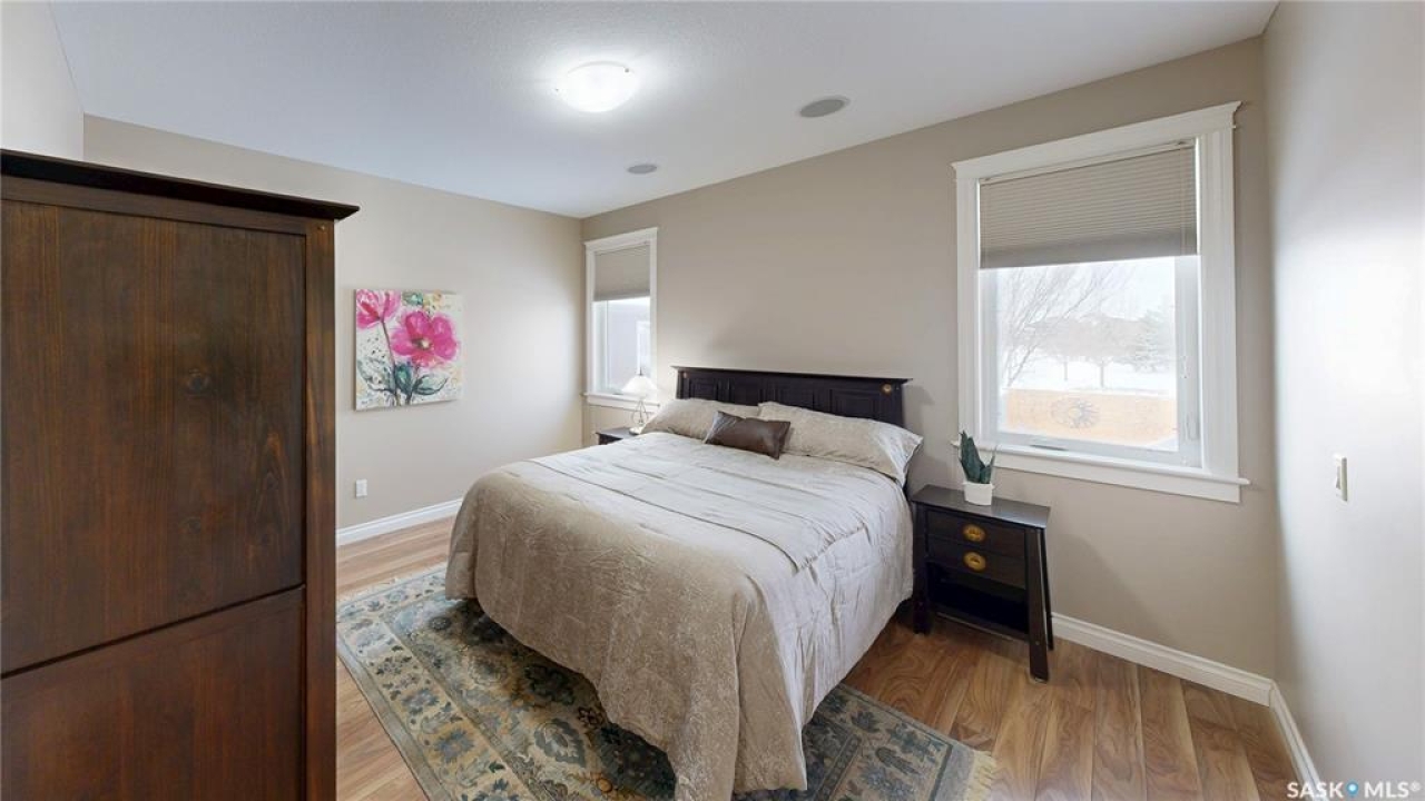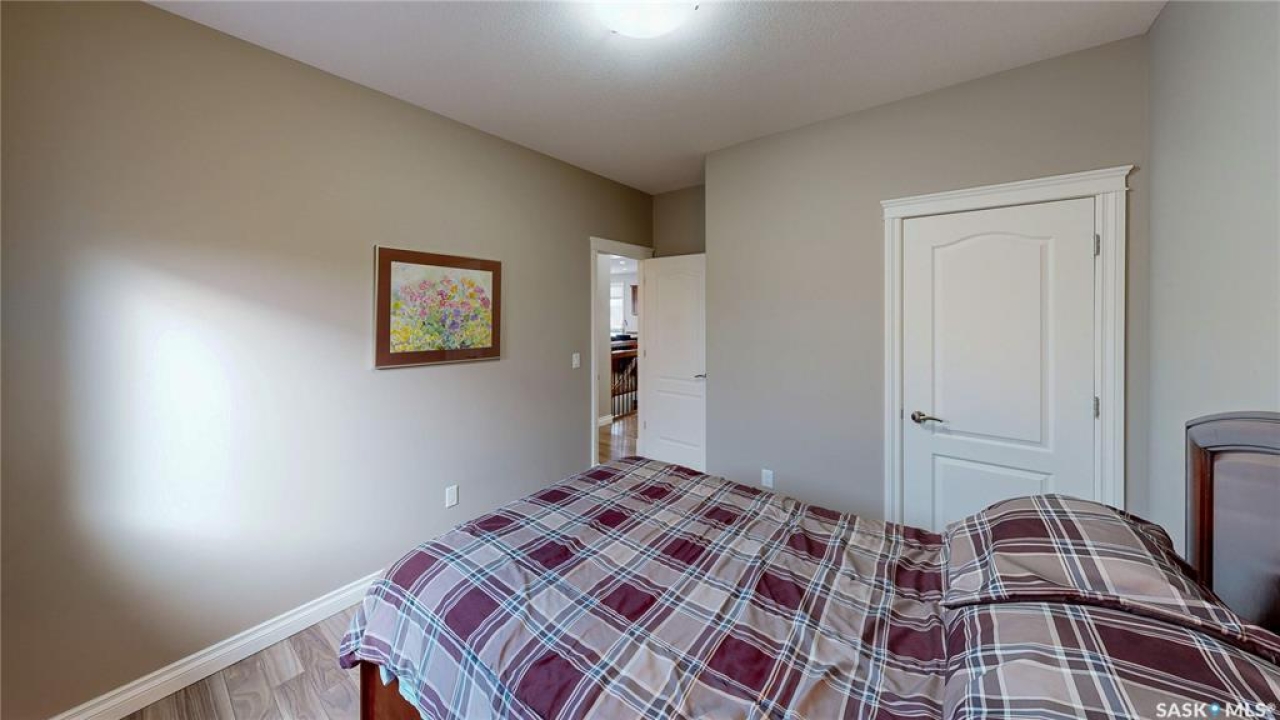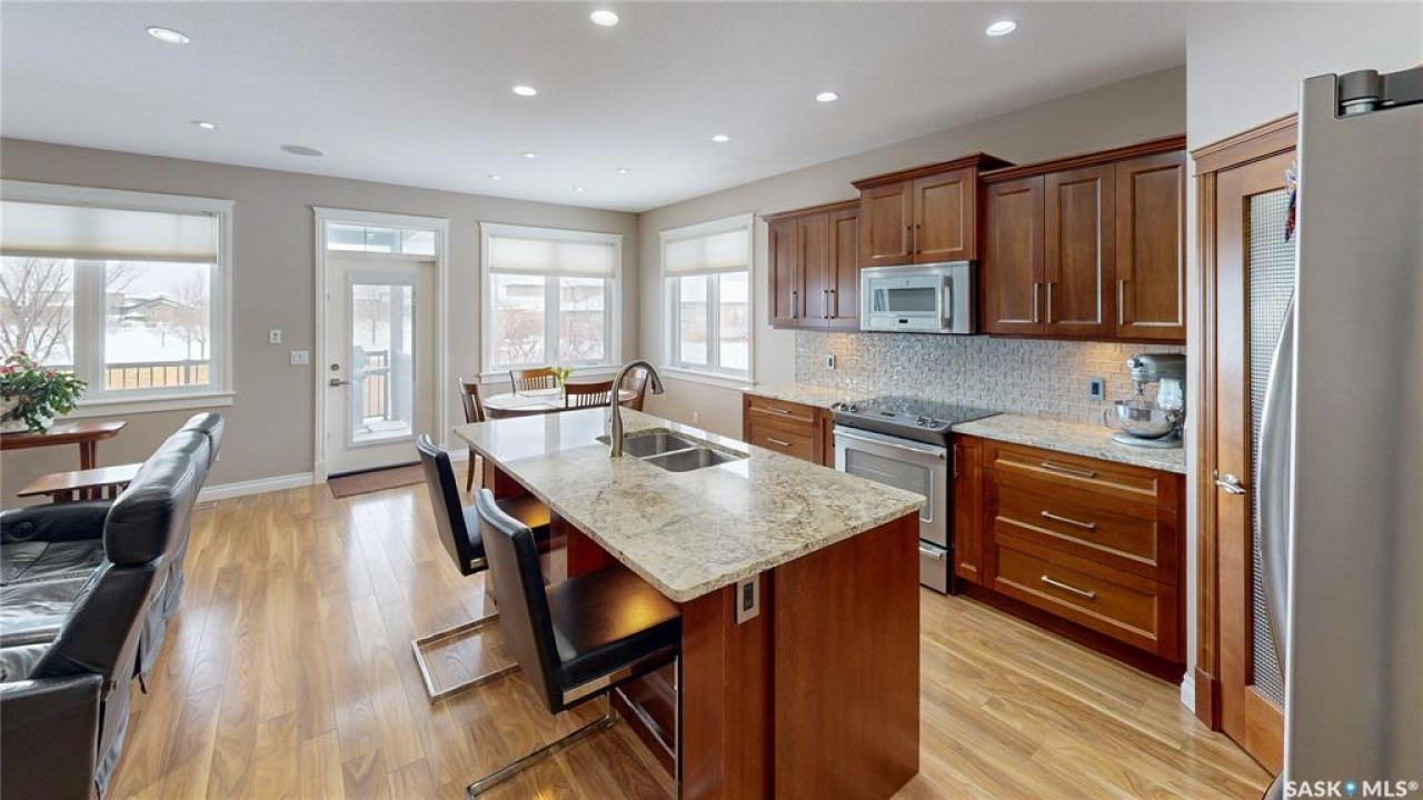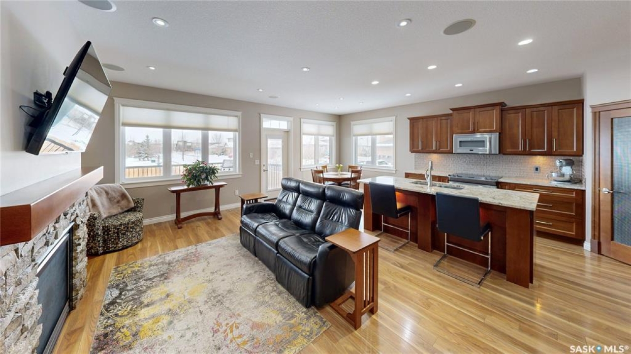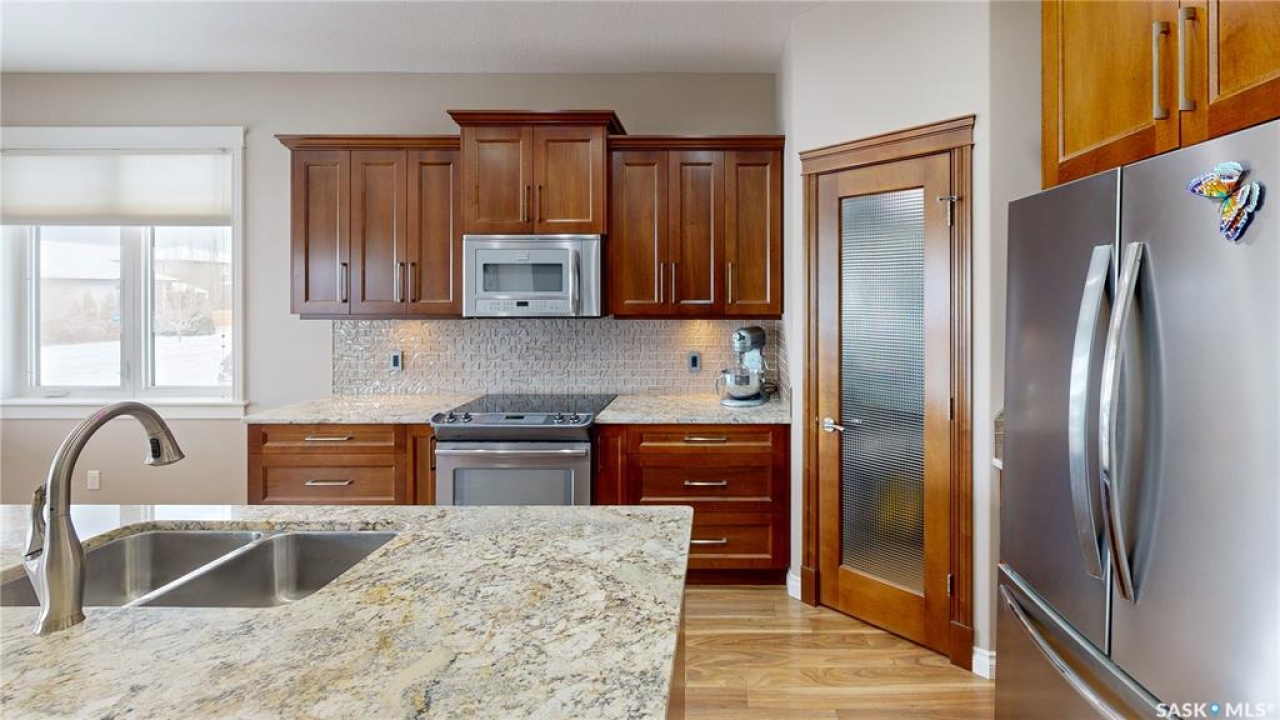 This 1,381 sq ft bungalow is ideally positioned on a quiet, low-traffic bay with a park directly behind—something the current owners have especially appreciated as it provides a safe setting for kids to play. The home was custom-built in 2013 by Ripplinger and offers 3 bedrooms and 2 bathrooms on the main level, along with an additional bedroom and bathroom partially developed downstairs. The front yard is professionally landscaped with underground sprinklers. There's a 24 x 26 attached garage which is heated and insulated, featuring 14 ft ceilings (great for anyone considering a car lift), a 220 volt plug-in, and a full drain pit connected to the sewer. The fully fenced backyard is also professionally landscaped and features a stone wall, underground sprinklers, a covered deck, natural gas BBQ hookup, exposed aggregate patio, and an included storage shed. Inside, the living room features laminate flooring and 9 ft ceilings that continue throughout the main level. There are LED pot lights, a built-in speaker system (also connected to the primary bedroom and deck), and a natural gas fireplace. The open layout flows into the dining area and kitchen, complete with soft-close drawers, corner pantry, glass tile backsplash, granite countertops, an island with bar seating, and included stainless steel appliances. The main floor continues with a bedroom, followed by the laundry room with included washer and dryer, another bedroom, and a 4-piece bathroom with ceramic tile heated flooring. The primary suite features a walk-in closet and a 4-piece ensuite, also with ceramic tile heated flooring. Downstairs, the partially finished basement offers excellent potential for future development, including a large rec room, framed bedroom, additional den or storage area, and bathroom. There is also roughed-in plumbing for a future bar area if desired. The mechanical room includes a 200 amp electrical panel, owned water softener, gas water heater and high efficiency furnace.