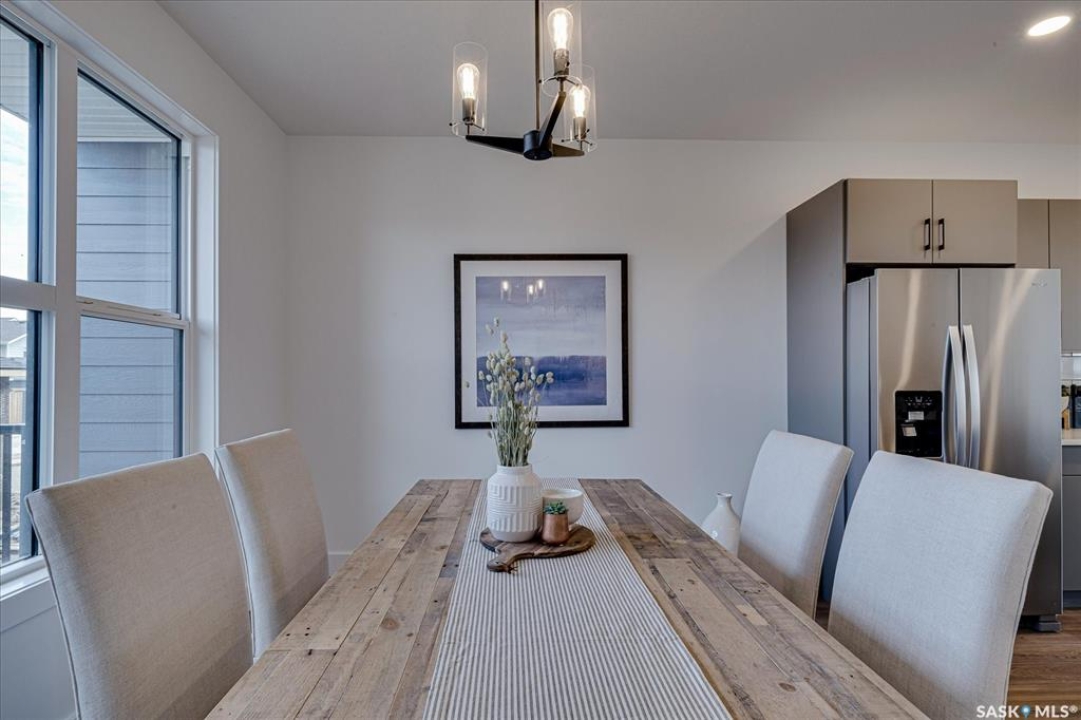 Welcome to Hudson Row 3, Saskatoon's newest townhome project located in The Meadows at Rosewood. This Scandinavian inspired streetscape will create an unmatched timeless curb appeal that is sure to catch people's eye. The 1461 SF open concept interior includes all the premium designer finishes people have come to expect with Arbutus Properties. The main floor includes an efficient layout with large front and back windows that flood the space with natural light and is covered by premium flooring. The centrally located chef's kitchen includes trendy flat panel cabinetry highlighted with matt black hardware, quartz counters, stylish backsplash and a full stainless appliance package. The upper floor includes 3 generously sized bedrooms, 4pc bathroom, a convenient flex space that was designed to cater to a variety of uses and an easy to access laundry closet. Also on the upper floor is the master bedroom that includes a walk-in closet and a private ensuite. The exterior of the home is covered in durable James Hardie composite siding and comes inclusive with private fenced landscaped yards, a rear deck & a double detached garage at the rear. Located near multiple parks, commercial amenities, Costco and within a block from 2 new community schools makes this a must see! "Disclaimer, all cabinets in these units will be flat white , floor tiles will be grey, backsplash is white, AI generated kitchen showing example with Island, but cabinets will be flat panel, picture in listing showing colour patterns! Contact Agent for more information. Garages can not be done until June when frost is all out. Pictures are from our last showhome.