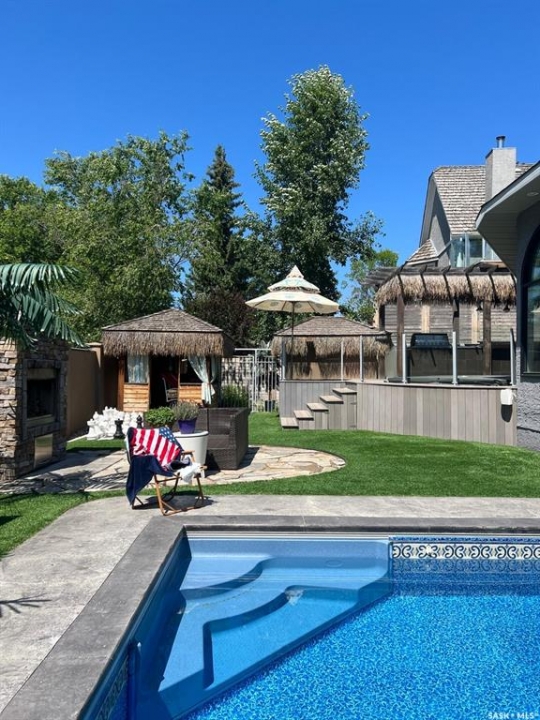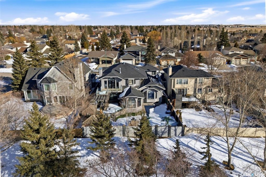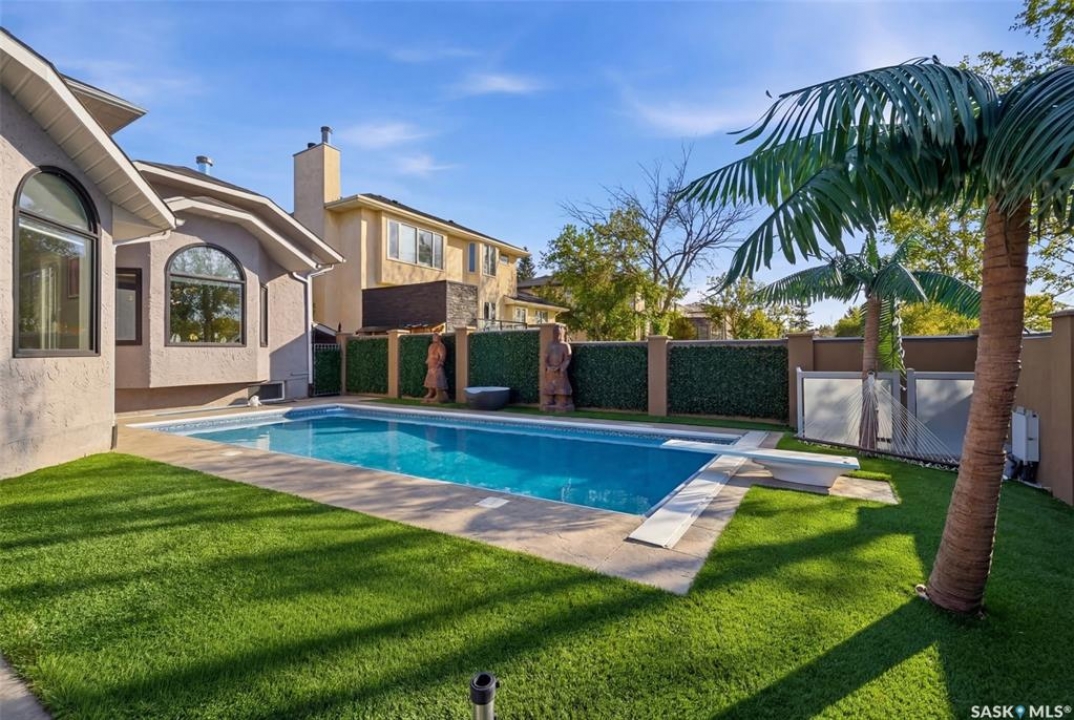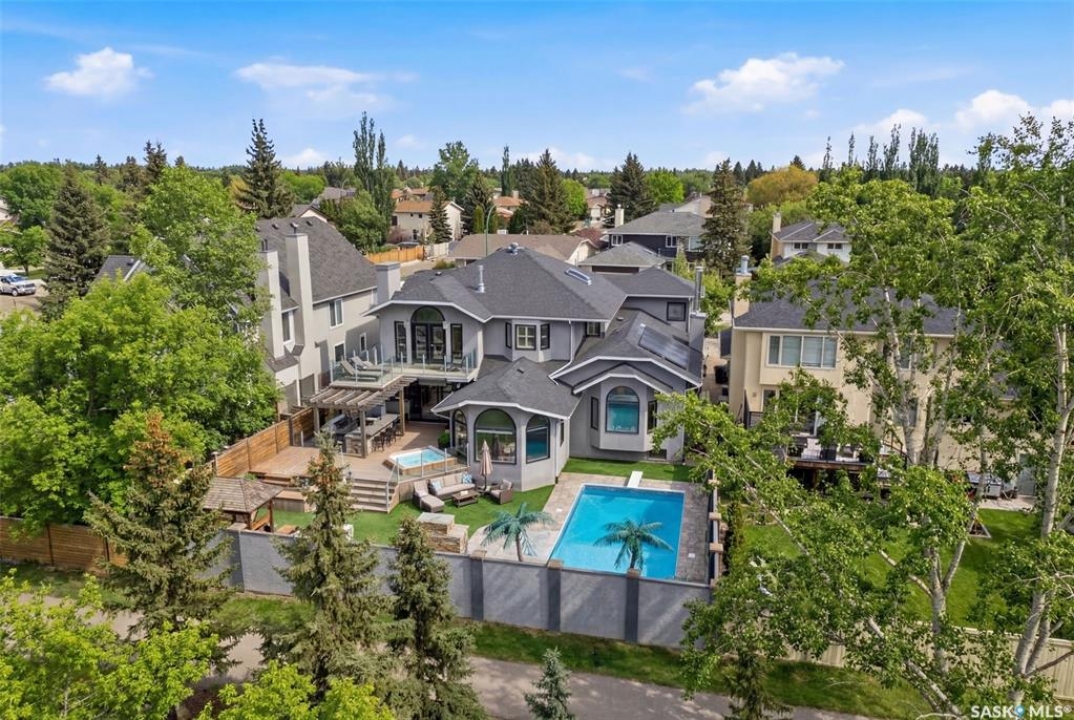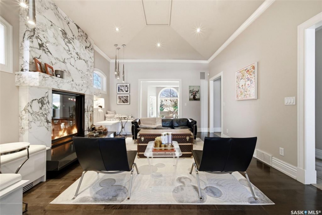 This extraordinary executive residence, masterfully crafted by Sunwest Homes, offers 3,487 sq. ft. of refined living with breathtaking unobstructed views. A striking Tyndall stone façade welcomes you into a grand foyer and elegant living room anchored by a Renaissance Rumford wood-burning fireplace adorned with exquisite Italian marble from Florence. The main level features a sophisticated private office with wet-bar rough-in, a formal dining room highlighted by a dramatic 12-foot reverse tapered ceiling overlooking the resort-style backyard, and a spectacular custom kitchen by Pilandri Bros. showcasing bold Ferrari-red cabinetry and premium appliances including Sub-Zero refrigeration, dual Wolf built-in ovens, a Fisher & Paykel gas range, dual dishwashers, and a built-in Miele espresso system. The inviting family room with gas fireplace opens through impressive Nano doors to a private outdoor sanctuary complete with a fully equipped kitchen, tiki bar, gas BBQ, hot tub, outdoor fireplace, and a sparkling salt-water in-ground pool (approx. 16×32) has waterfall features and with potential to reinstall elegant laminar jets, heated by natural gas. Additional conveniences include main floor laundry, a practical boot room, and direct access to a heated 24×23 garage with a dog wash station. The 2 floor has 4-bedrooms including a luxurious primary retreat with a private deck overlooking the manicured yard, park, and environmental reserve, along with a spa-inspired ensuite featuring a deep soaker tub, steam shower, and recently replaced Grohe toilet and faucets.The fully finished lower level enhances the home with a private theatre room, expansive craft studio, fifth bedroom, full bath, fitness room with ballet bar, relaxing infrared sauna, and ample storage. Completing this remarkable residence is a whole-home audio/visual system and a reliable standby generator by Cummins—an exceptional and rare offering designed for luxurious living and unforgettable entertaining.