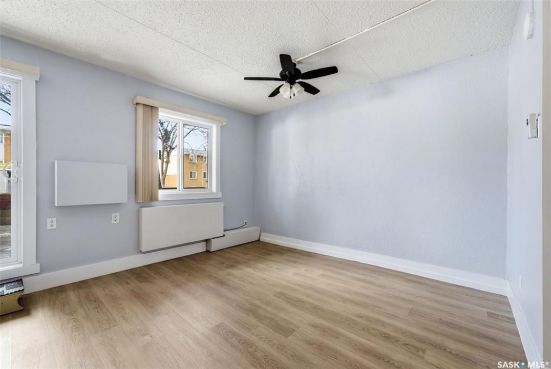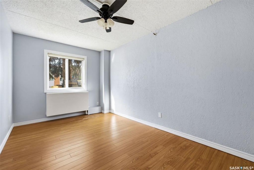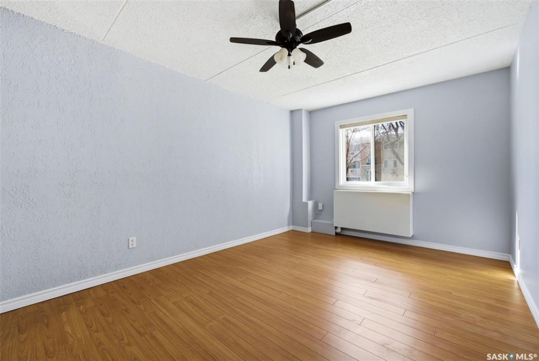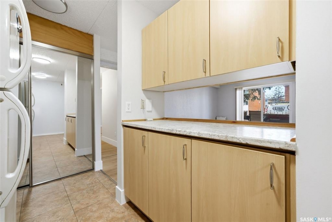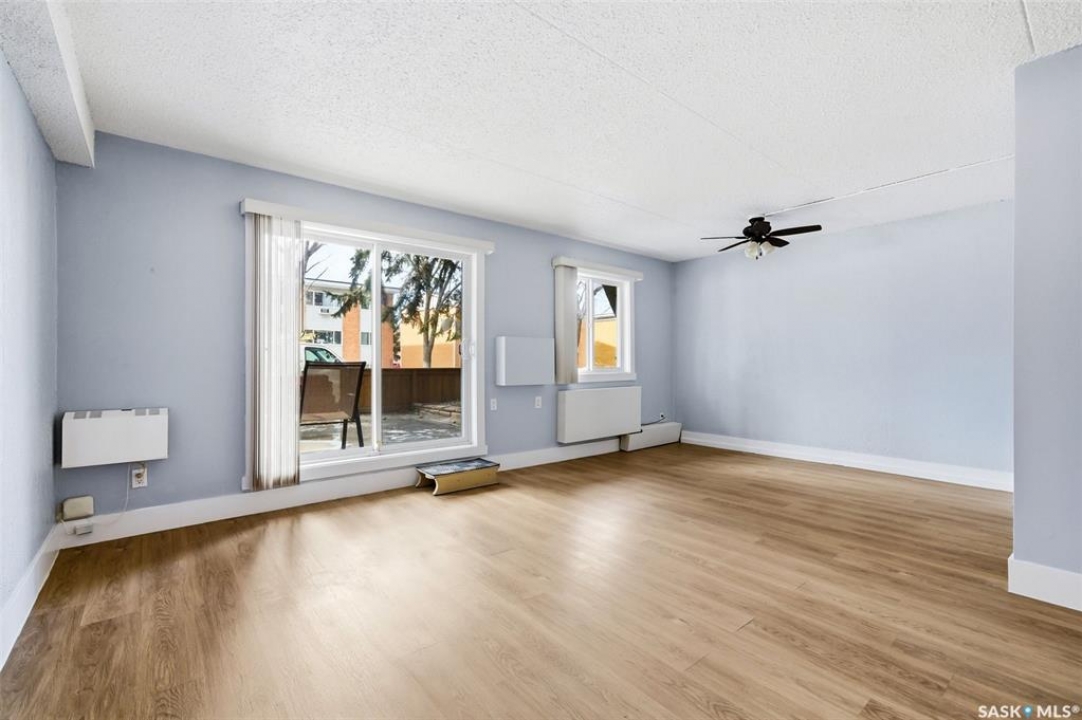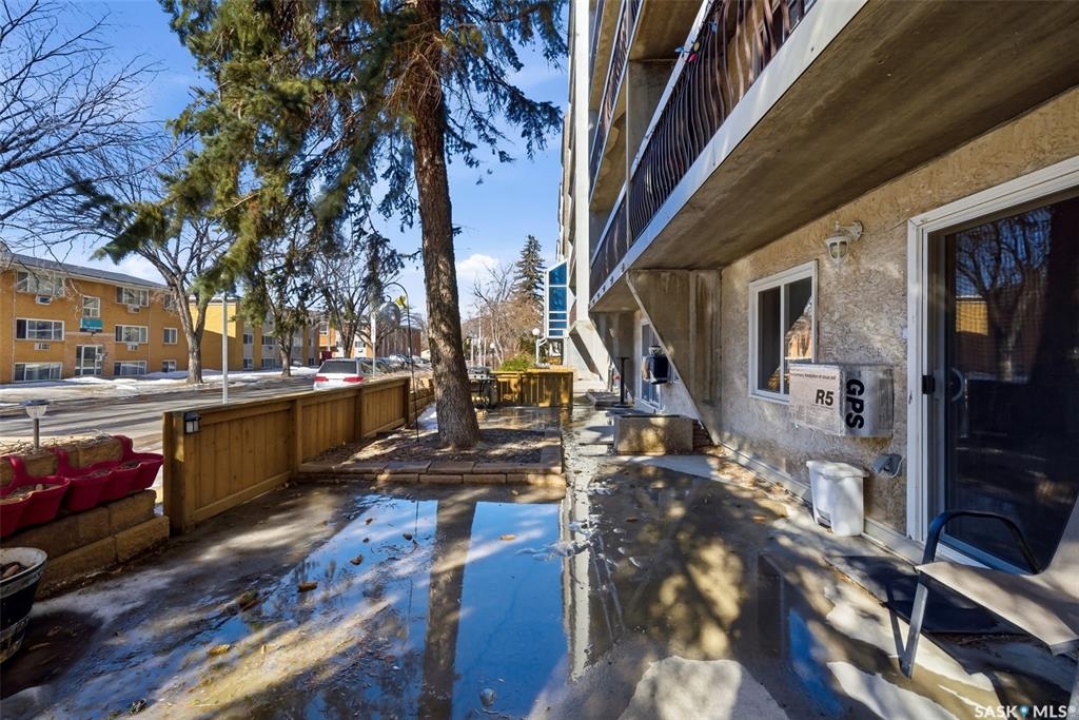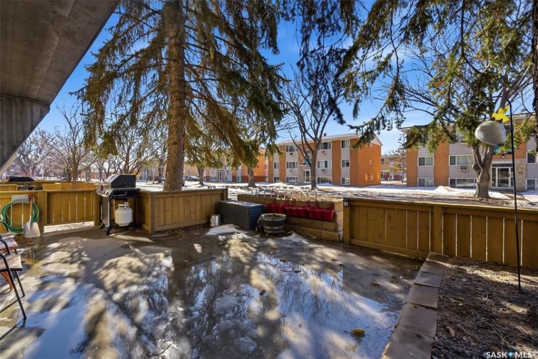 Welcome to this well-maintained 2 bedroom, 1 bathroom main floor condo in The Atrium, a popular South Regina building known for its convenient location and great amenities. Situated within walking distance to south Regina amenities and on a transit route, this location offers easy access to everything you need. Residents also enjoy access to an amenities room, elevator, exercise area, recreation centre, shared laundry, and visitor parking, with heat and water included in the condo fees. This main floor unit offers the convenience of in suite laundry and a private terrace. Upon entry, you're greeted by a spacious foyer with a large coat closet for added storage. The kitchen was fully updated in approximately 2012 and features modern cabinetry, updated countertops, and a stylish backsplash. Living room, formal dining area, and hallway showcase newer flooring with upgraded 6-inch baseboards, and the unit has been freshly repainted in 2025, creating a clean and inviting feel throughout. Laminate flooring in both bedrooms was replaced in 2013, and each bedroom includes a ceiling fan for added comfort. The primary bedroom offers a walk-through closet with direct access to the 4-piece bathroom. The bathroom has seen recent updates in 2024, including a new vanity, toilet, medicine cabinet, and lighting. Additional highlights include in-suite stackable laundry with included storage shelving, custom Hunter Douglas blinds in the bedroom, and a wall unit air conditioner with remote control. Enjoy outdoor living on the fenced patio, complete with recently replaced sliding doors, planters, and a BBQ (included). One electrified parking stall (#70) is also included, and the unit benefits from lower condo fees as a main floor unit. A fantastic opportunity for comfortable, low-maintenance living in a sought-after south Regina location!