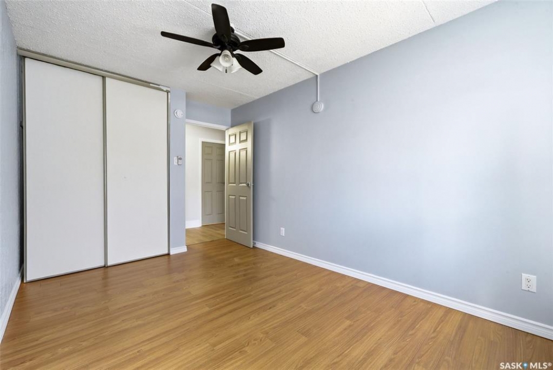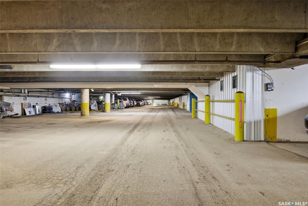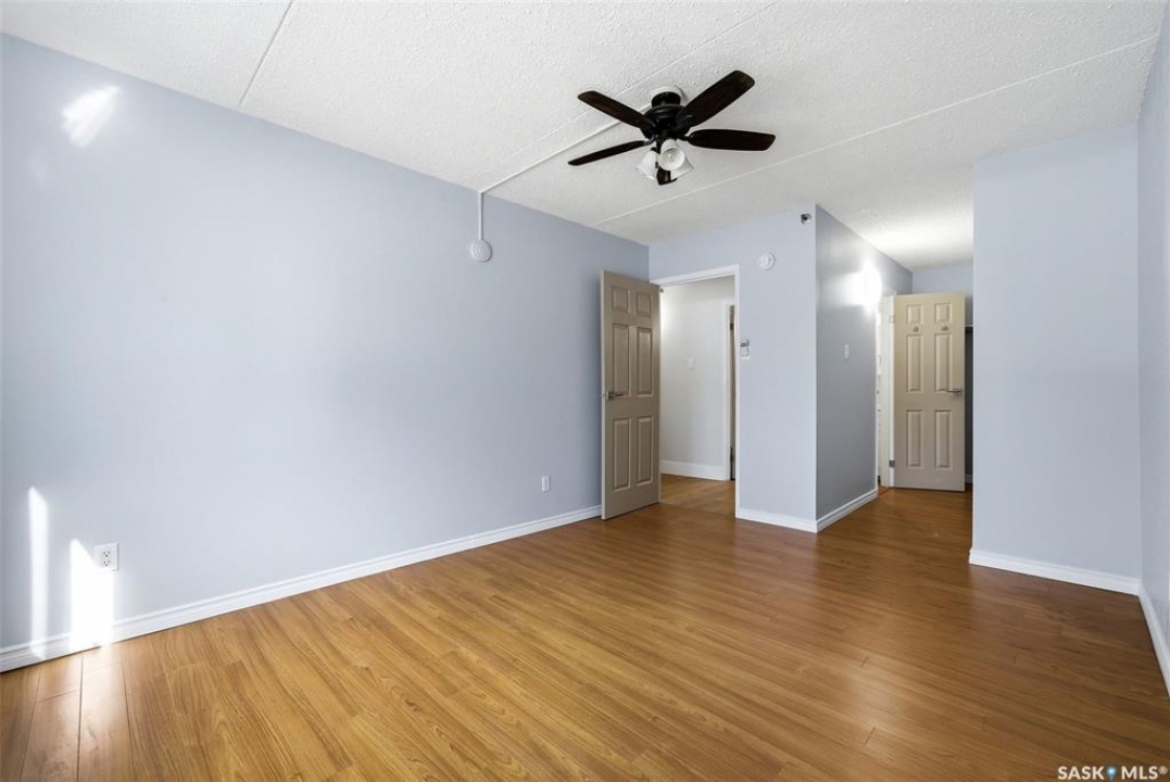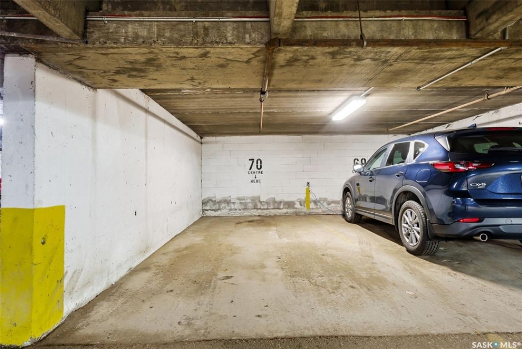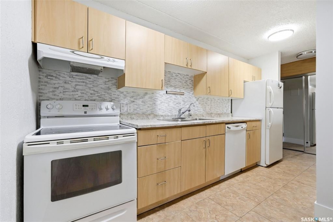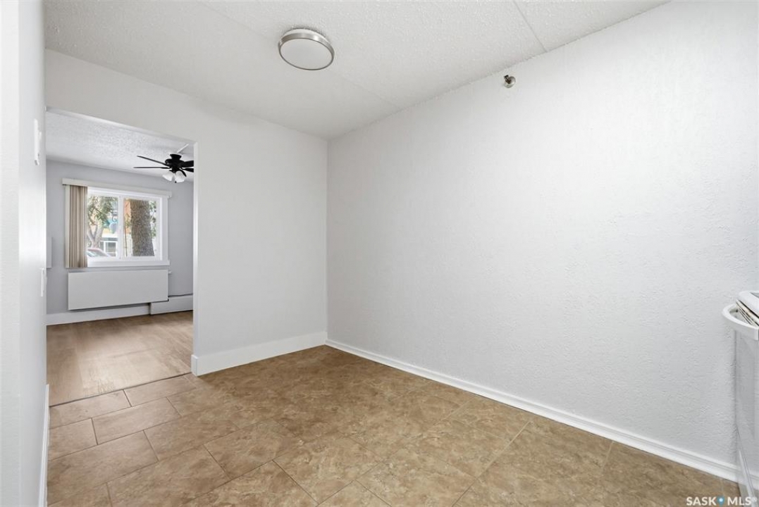 Welcome to this well-maintained 2 bedroom, 1 bathroom main floor condo in The Atrium, a popular South Regina building known for its convenient location and great amenities. Situated within walking distance to south Regina amenities and on a transit route, this location offers easy access to everything you need. Residents also enjoy access to an amenities room, elevator, exercise area, recreation centre, shared laundry, and visitor parking, with heat and water included in the condo fees. This main floor unit offers the convenience of in suite laundry and a private terrace. Upon entry, you're greeted by a spacious foyer with a large coat closet for added storage. The kitchen was fully updated in approximately 2012 and features modern cabinetry, updated countertops, and a stylish backsplash. Living room, formal dining area, and hallway showcase newer flooring with upgraded 6-inch baseboards, and the unit has been freshly repainted in 2025, creating a clean and inviting feel throughout. Laminate flooring in both bedrooms was replaced in 2013, and each bedroom includes a ceiling fan for added comfort. The primary bedroom offers a walk-through closet with direct access to the 4-piece bathroom. The bathroom has seen recent updates in 2024, including a new vanity, toilet, medicine cabinet, and lighting. Additional highlights include in-suite stackable laundry with included storage shelving, custom Hunter Douglas blinds in the bedroom, and a wall unit air conditioner with remote control. Enjoy outdoor living on the fenced patio, complete with recently replaced sliding doors, planters, and a BBQ (included). One electrified parking stall (#70) is also included, and the unit benefits from lower condo fees as a main floor unit. A fantastic opportunity for comfortable, low-maintenance living in a sought-after south Regina location!