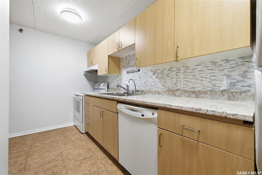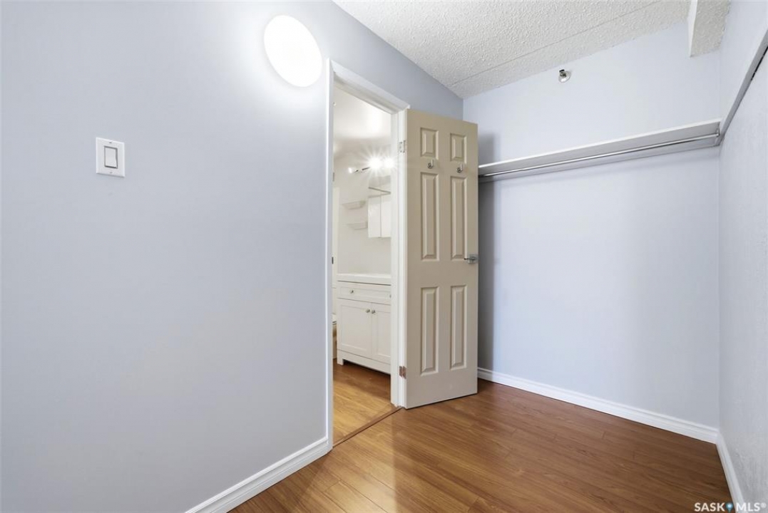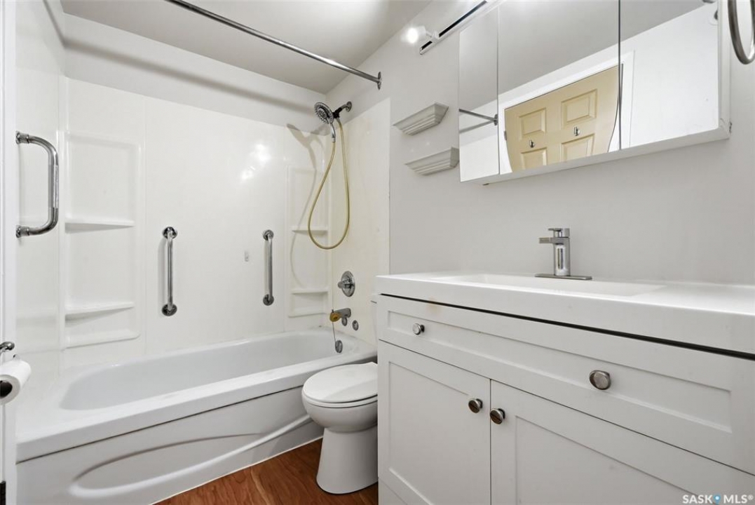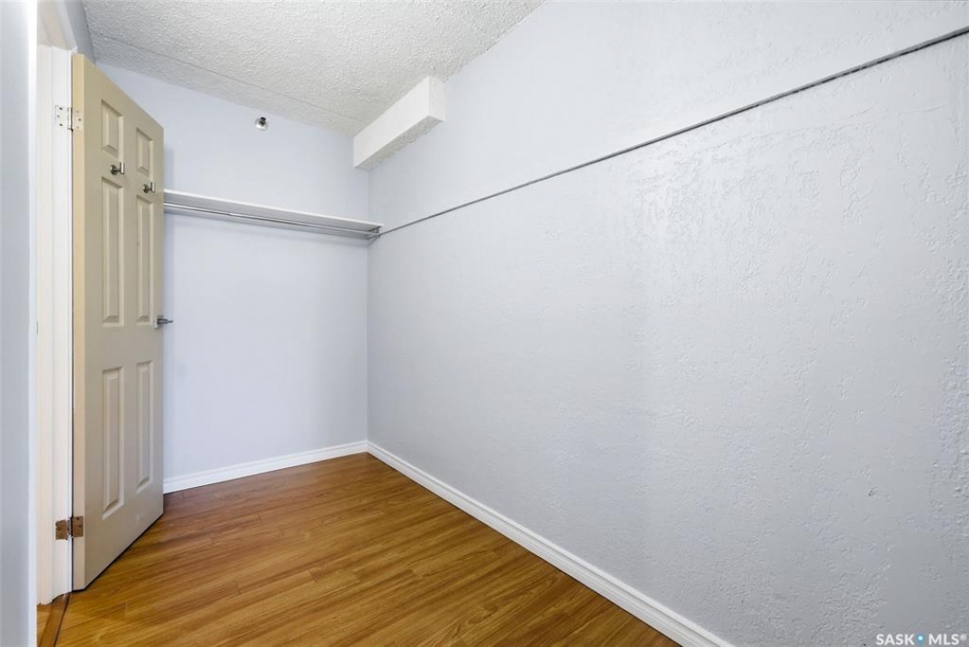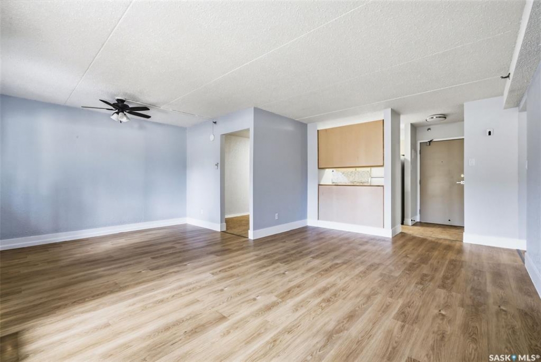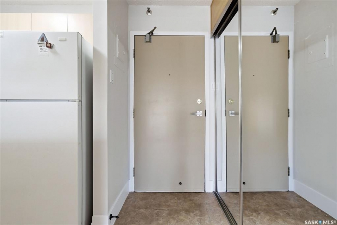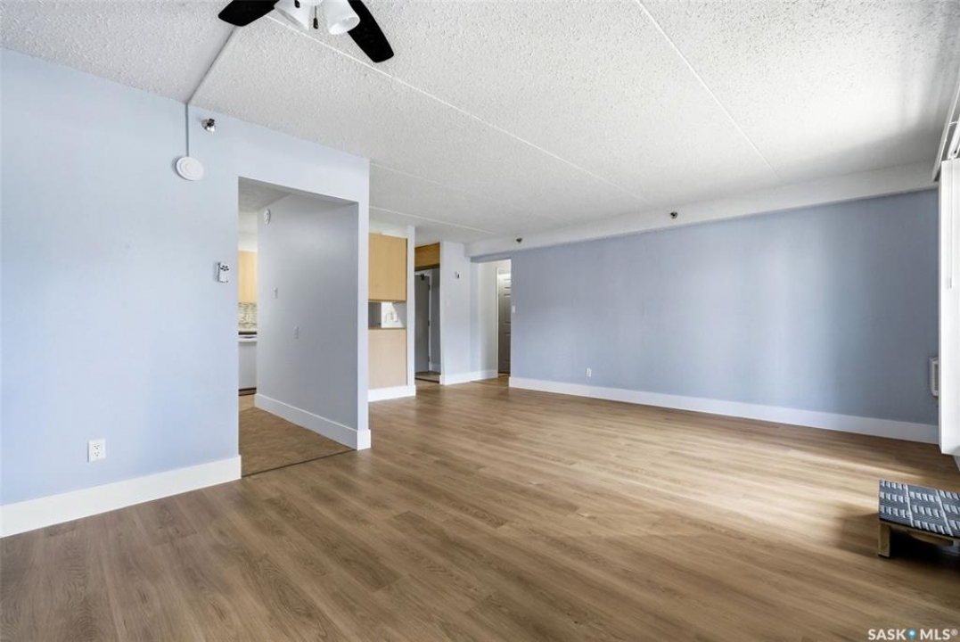 Welcome to this well-maintained 2 bedroom, 1 bathroom main floor condo in The Atrium, a popular South Regina building known for its convenient location and great amenities. Situated within walking distance to south Regina amenities and on a transit route, this location offers easy access to everything you need. Residents also enjoy access to an amenities room, elevator, exercise area, recreation centre, shared laundry, and visitor parking, with heat and water included in the condo fees. This main floor unit offers the convenience of in suite laundry and a private terrace. Upon entry, you're greeted by a spacious foyer with a large coat closet for added storage. The kitchen was fully updated in approximately 2012 and features modern cabinetry, updated countertops, and a stylish backsplash. Living room, formal dining area, and hallway showcase newer flooring with upgraded 6-inch baseboards, and the unit has been freshly repainted in 2025, creating a clean and inviting feel throughout. Laminate flooring in both bedrooms was replaced in 2013, and each bedroom includes a ceiling fan for added comfort. The primary bedroom offers a walk-through closet with direct access to the 4-piece bathroom. The bathroom has seen recent updates in 2024, including a new vanity, toilet, medicine cabinet, and lighting. Additional highlights include in-suite stackable laundry with included storage shelving, custom Hunter Douglas blinds in the bedroom, and a wall unit air conditioner with remote control. Enjoy outdoor living on the fenced patio, complete with recently replaced sliding doors, planters, and a BBQ (included). One electrified parking stall (#70) is also included, and the unit benefits from lower condo fees as a main floor unit. A fantastic opportunity for comfortable, low-maintenance living in a sought-after south Regina location!