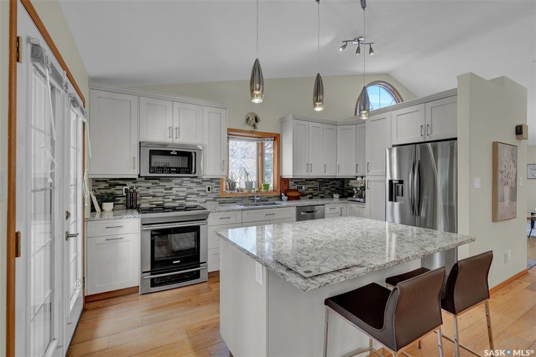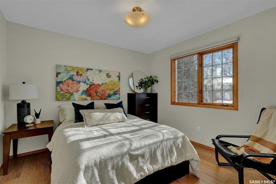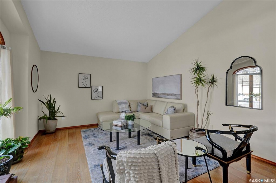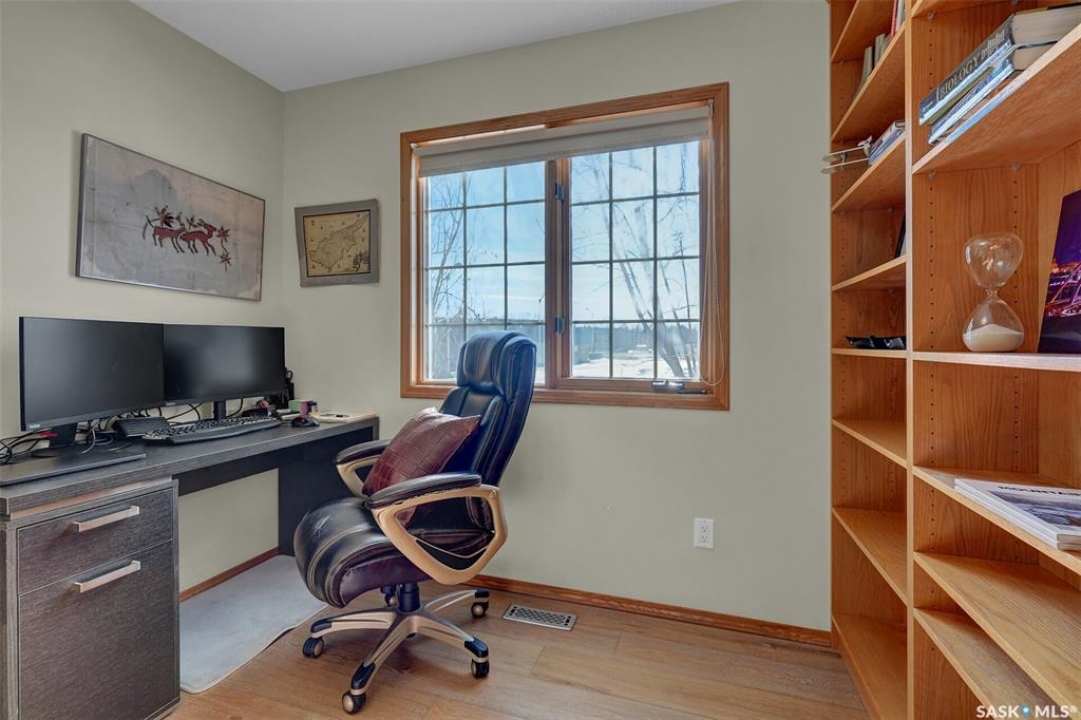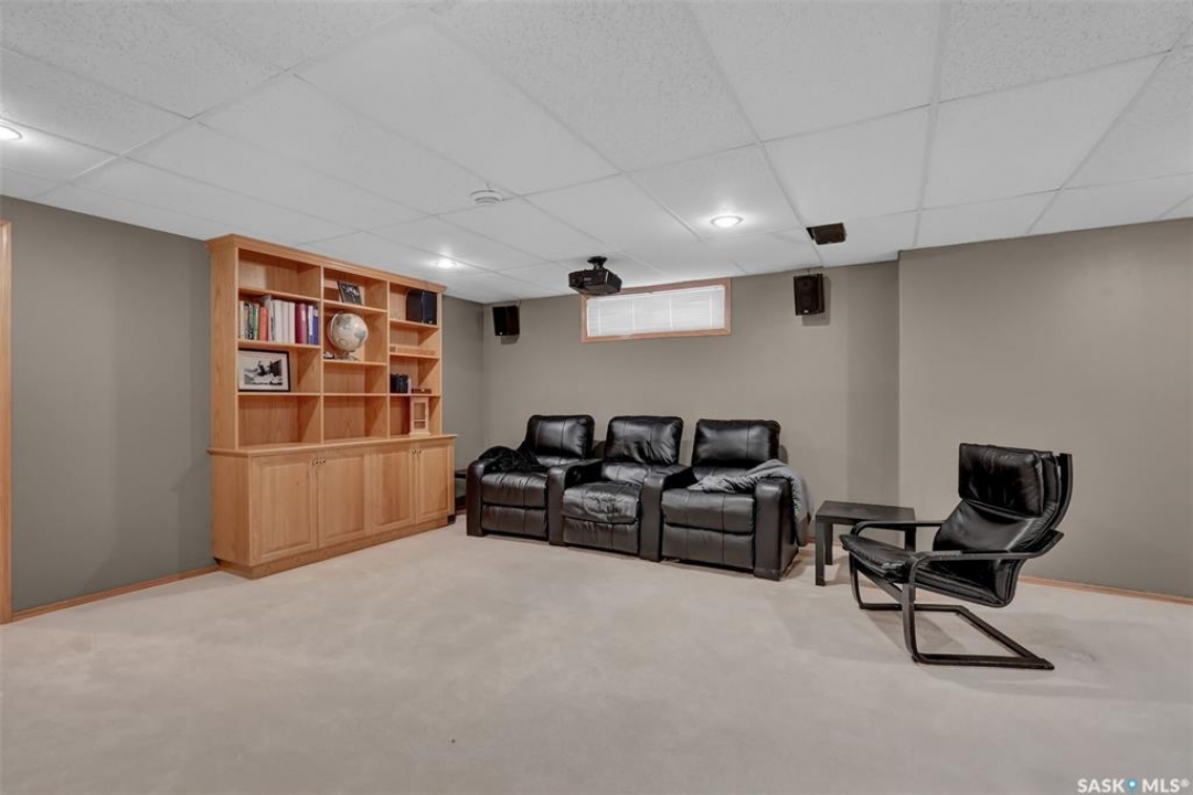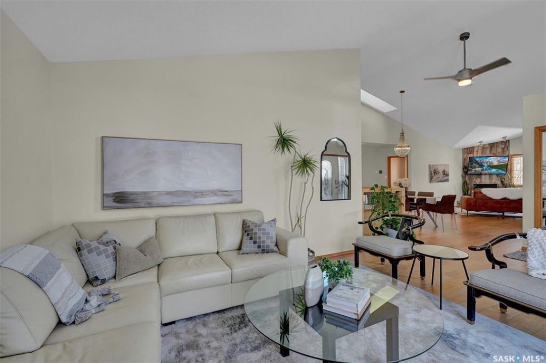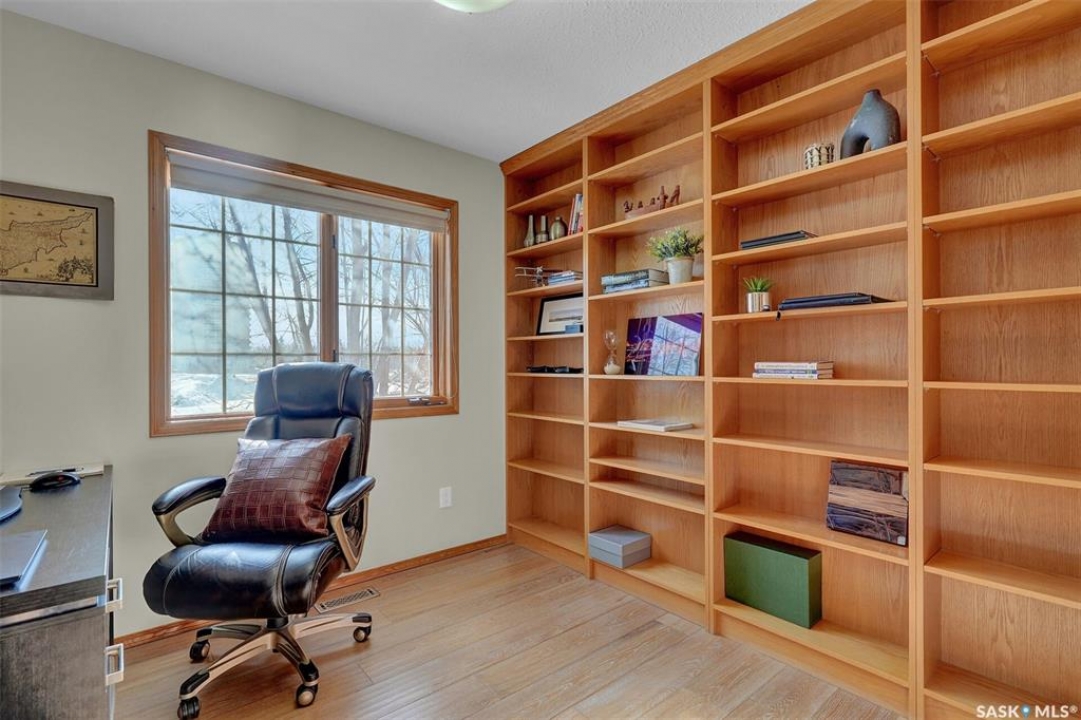 Welcome to sophisticated executive living in the prestigious gated community of Lakeshore Court. This timeless contemporary 3 bedroom plus office bungalow has been completely redesigned to offer a luxurious open concept layout with impressive vaulted ceilings and premium engineered oak hardwood flooring throughout the main level. The bright front living room welcomes you with a large picture window that fills the space with natural light. The beautifully designed kitchen is both stylish and functional, featuring maple cabinetry with soft-close drawers and cabinets, a large island with additional storage, stainless steel appliances, tiled backsplash, and Cambria quartz countertops. The elegant dining area is ideal for entertaining, highlighted by a skylight and stunning Swarovski crystal chandelier. The inviting family room offers a warm atmosphere with a fireplace adorned in classic Italian tile. The spacious primary suite is a private retreat with a wall-to-wall ergonomic closet system and a spa-inspired 5-piece ensuite featuring dual sinks, Cambria quartz countertops, heated tile floors, heated towel rack, a Kohler VibrAcoustic soaking tub, and a large 10mm glass tiled shower. A second bedroom, dedicated office with built-in bookshelves, and a conveniently located 4-piece bathroom complete the main level. The laundry room offers tiled flooring, abundant cabinetry, and direct access to the double attached garage. The fully developed basement is perfect for entertaining with a large recreation room currently set up as a home theatre with projector, built-in cabinetry, and bar area. This level also features a third bedroom, 3-piece bathroom, cedar storage room, and a large utility/storage area with HRV system, newer high-efficiency furnace, humidifier, air conditioner, steel beam construction, and web trusses. This exceptional home is located in one of the city's most exclusive communities and ready for new owners to call it home.