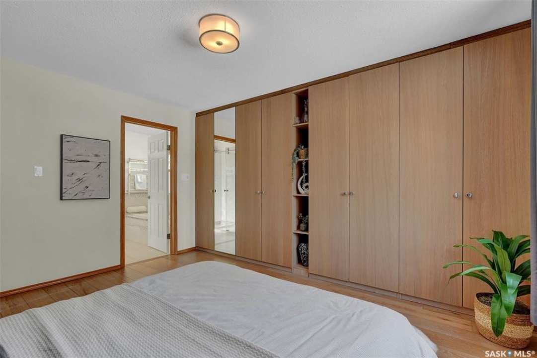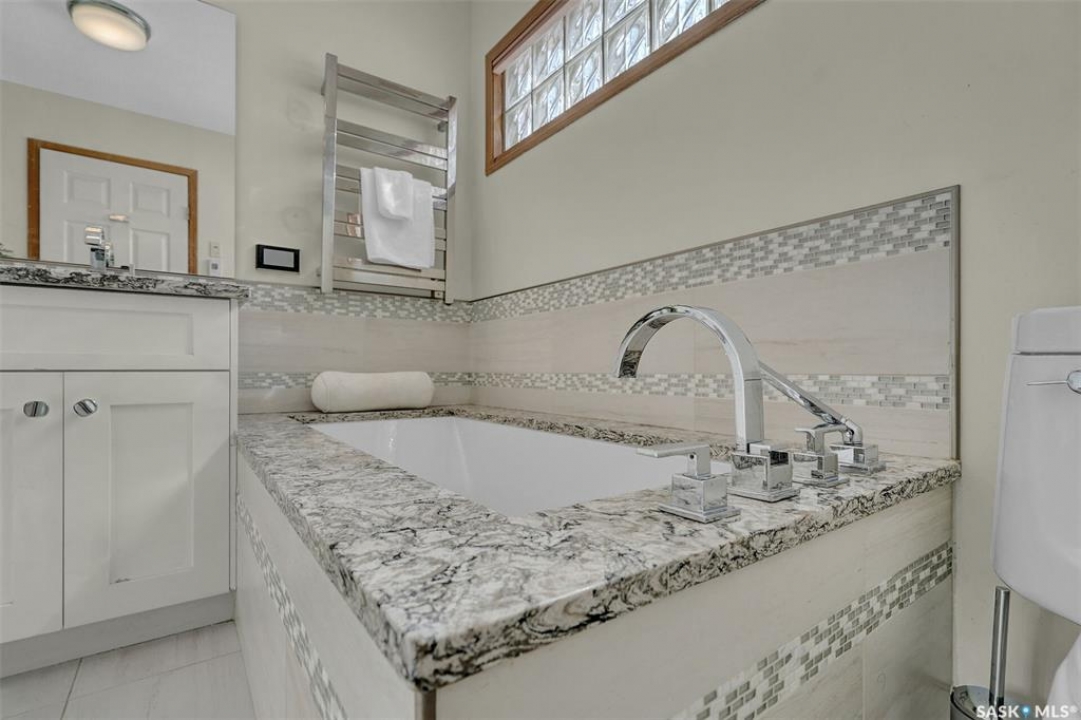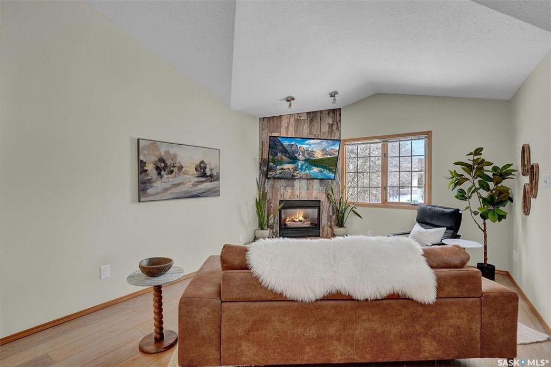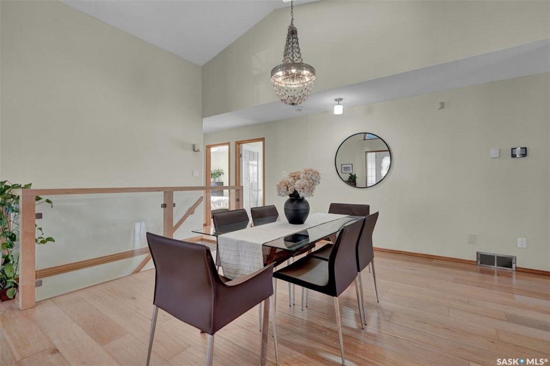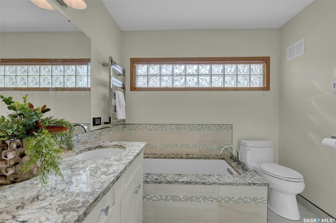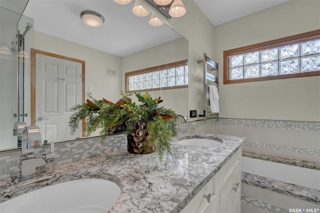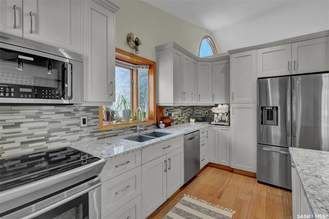 Welcome to sophisticated executive living in the prestigious gated community of Lakeshore Court. This timeless contemporary 3 bedroom plus office bungalow has been completely redesigned to offer a luxurious open concept layout with impressive vaulted ceilings and premium engineered oak hardwood flooring throughout the main level. The bright front living room welcomes you with a large picture window that fills the space with natural light. The beautifully designed kitchen is both stylish and functional, featuring maple cabinetry with soft-close drawers and cabinets, a large island with additional storage, stainless steel appliances, tiled backsplash, and Cambria quartz countertops. The elegant dining area is ideal for entertaining, highlighted by a skylight and stunning Swarovski crystal chandelier. The inviting family room offers a warm atmosphere with a fireplace adorned in classic Italian tile. The spacious primary suite is a private retreat with a wall-to-wall ergonomic closet system and a spa-inspired 5-piece ensuite featuring dual sinks, Cambria quartz countertops, heated tile floors, heated towel rack, a Kohler VibrAcoustic soaking tub, and a large 10mm glass tiled shower. A second bedroom, dedicated office with built-in bookshelves, and a conveniently located 4-piece bathroom complete the main level. The laundry room offers tiled flooring, abundant cabinetry, and direct access to the double attached garage. The fully developed basement is perfect for entertaining with a large recreation room currently set up as a home theatre with projector, built-in cabinetry, and bar area. This level also features a third bedroom, 3-piece bathroom, cedar storage room, and a large utility/storage area with HRV system, newer high-efficiency furnace, humidifier, air conditioner, steel beam construction, and web trusses. This exceptional home is located in one of the city's most exclusive communities and ready for new owners to call it home.