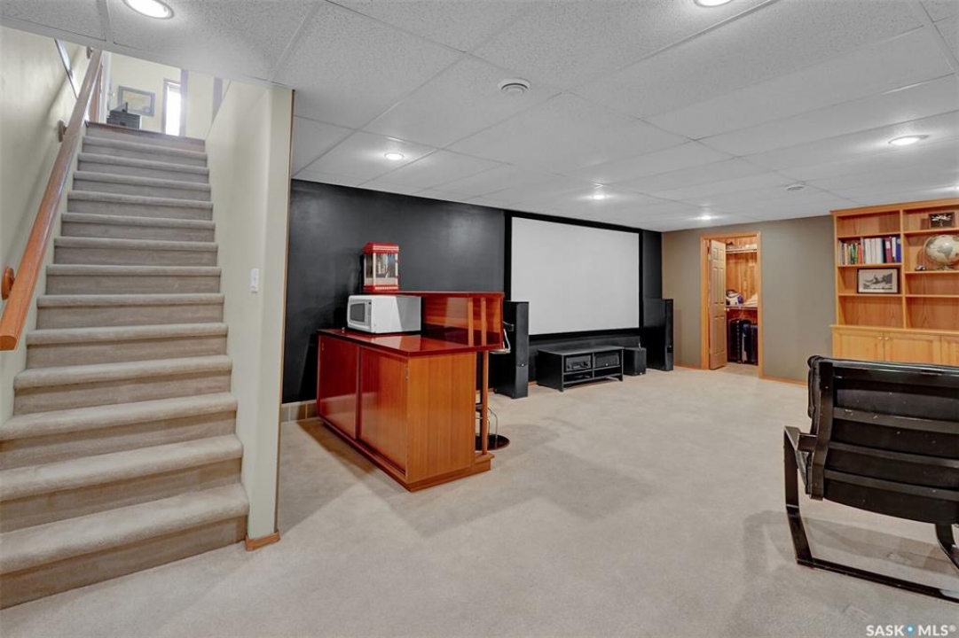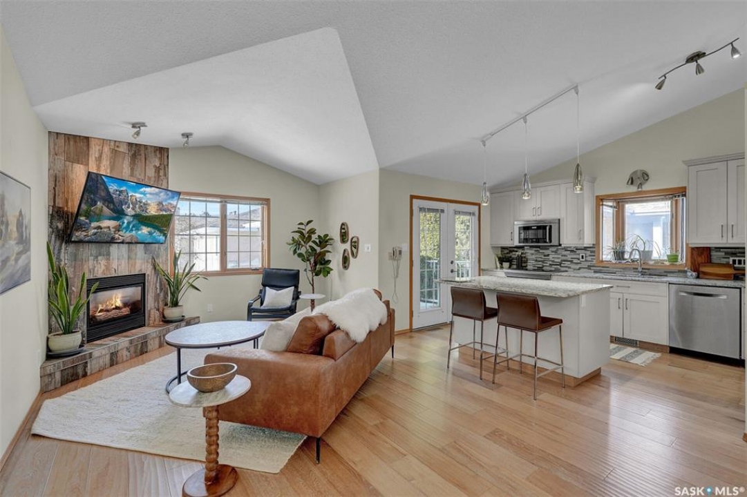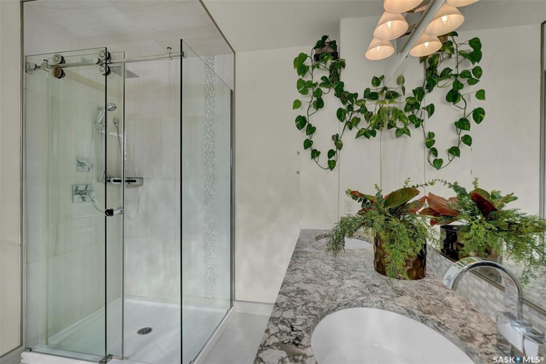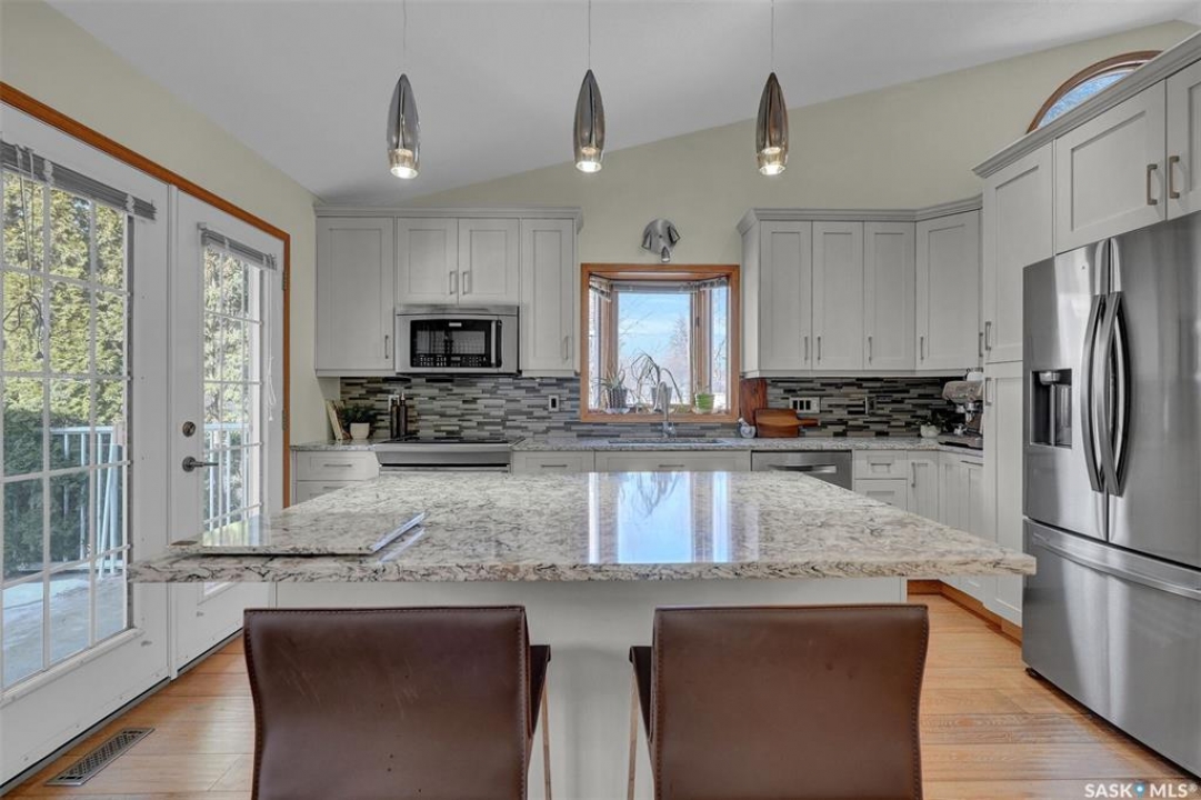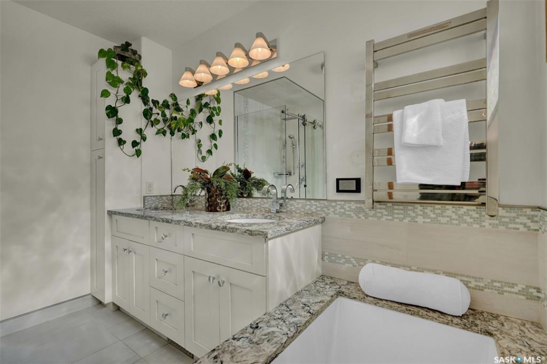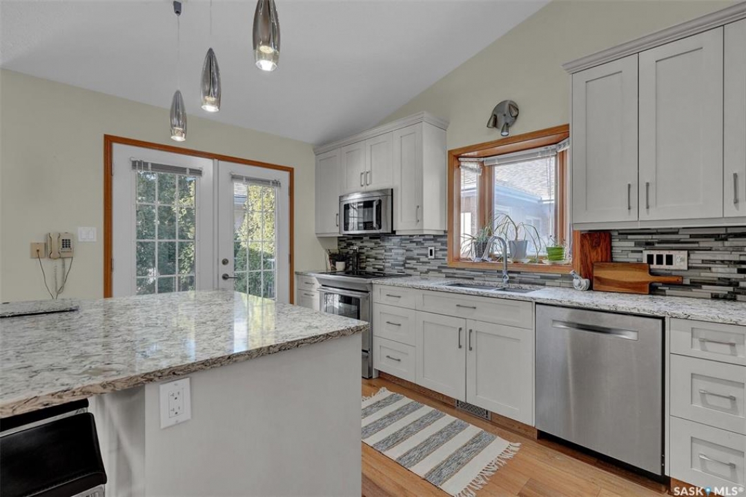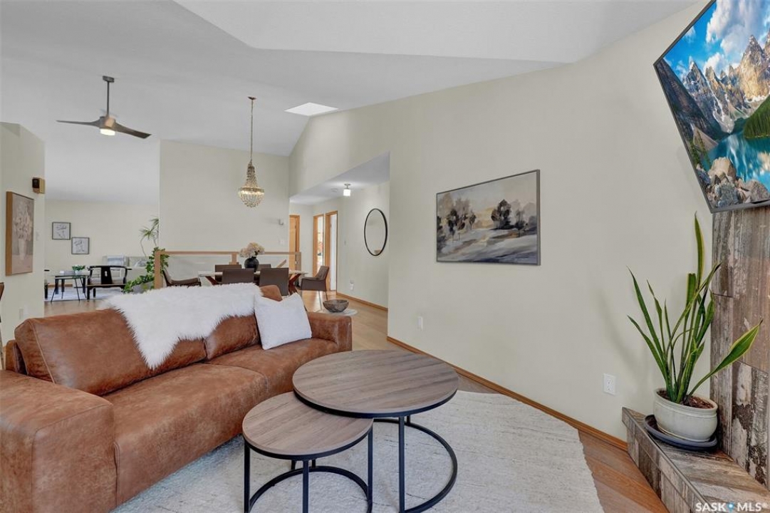 Welcome to sophisticated executive living in the prestigious gated community of Lakeshore Court. This timeless contemporary 3 bedroom plus office bungalow has been completely redesigned to offer a luxurious open concept layout with impressive vaulted ceilings and premium engineered oak hardwood flooring throughout the main level. The bright front living room welcomes you with a large picture window that fills the space with natural light. The beautifully designed kitchen is both stylish and functional, featuring maple cabinetry with soft-close drawers and cabinets, a large island with additional storage, stainless steel appliances, tiled backsplash, and Cambria quartz countertops. The elegant dining area is ideal for entertaining, highlighted by a skylight and stunning Swarovski crystal chandelier. The inviting family room offers a warm atmosphere with a fireplace adorned in classic Italian tile. The spacious primary suite is a private retreat with a wall-to-wall ergonomic closet system and a spa-inspired 5-piece ensuite featuring dual sinks, Cambria quartz countertops, heated tile floors, heated towel rack, a Kohler VibrAcoustic soaking tub, and a large 10mm glass tiled shower. A second bedroom, dedicated office with built-in bookshelves, and a conveniently located 4-piece bathroom complete the main level. The laundry room offers tiled flooring, abundant cabinetry, and direct access to the double attached garage. The fully developed basement is perfect for entertaining with a large recreation room currently set up as a home theatre with projector, built-in cabinetry, and bar area. This level also features a third bedroom, 3-piece bathroom, cedar storage room, and a large utility/storage area with HRV system, newer high-efficiency furnace, humidifier, air conditioner, steel beam construction, and web trusses. This exceptional home is located in one of the city's most exclusive communities and ready for new owners to call it home.