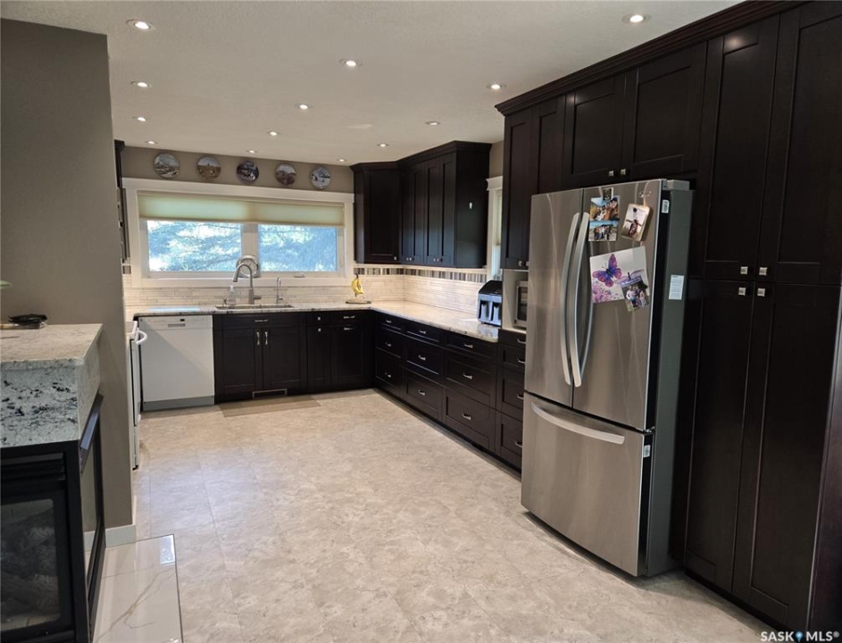 Welcome to your dream home! This expansive property offers unparalleled elegance and modern comfort, situated on a large fully fenced yard that ensures privacy to your own park-like backyard. The house itself is a well thought out design and craftsmanship, featuring high-end finishes that exude luxury. From the moment you walk in you see the quality finishes from the flooring which flows into the kitchen with separation of a three sided fireplace that not only serves to heat but gives great ambiance. The lavish kitchen is equipped with custom kitchen cupboards, polished off with granite counters and tiled backsplash, perfect for culinary enthusiasts and entertainers! This well built home was brought into another era with its facelift, changing the layout to be more functional along with the 12x19 addition of the sun room in 2020. This home is designed to be enjoyed year-round, featuring large windows that flood the space with natural light and views of the yard. The main floor also has 2 bedrooms along with the primary suite which has a walk-in closet along in the ensuite soon to be completed. The lower level has two more bedrooms along with ample room to run around, play games or relaxing with a movie. The car enthusiast will be delighted by the massive garage(32x25), providing ample space for toys, tinkering or for multiple vehicles and additional storage, which is accessible from the basement. The outdoor area is equally impressive, with a vast yard that offers endless possibilities for gardening, recreation, or simply enjoying the outdoors in your own private oasis. Don't miss the opportunity to own this extraordinary property, where luxury meets comfort in a truly remarkable setting. We have a video tour available!