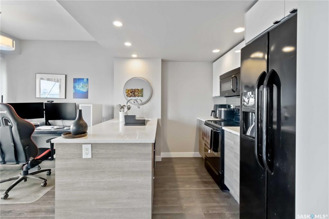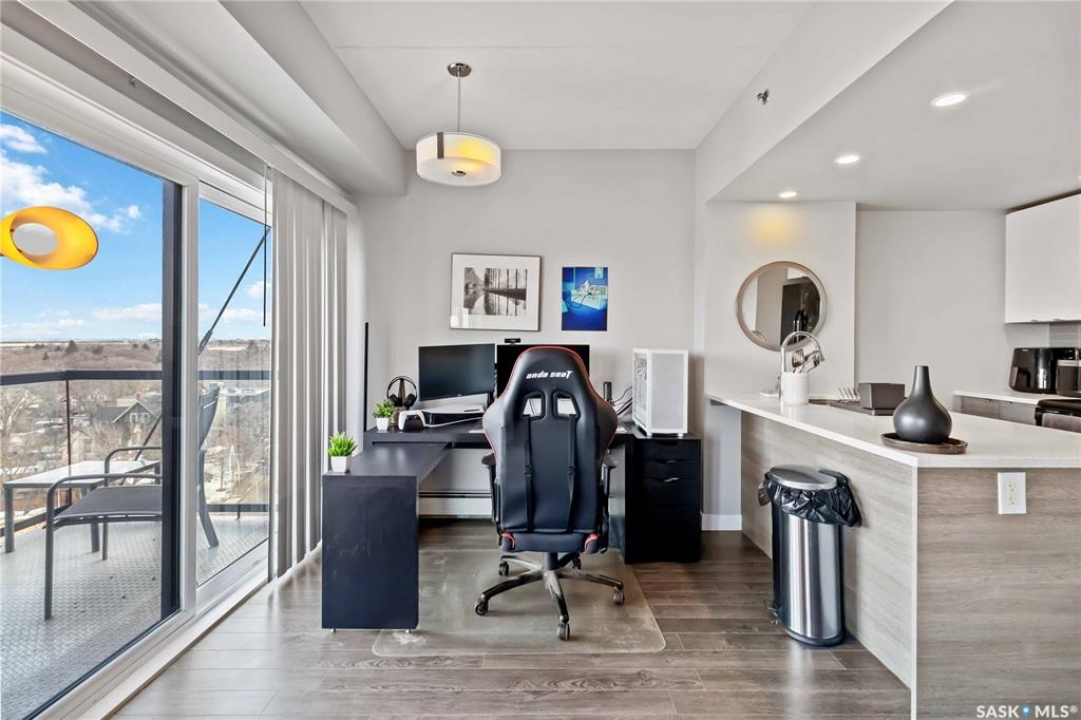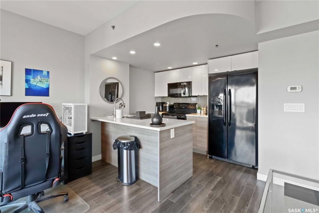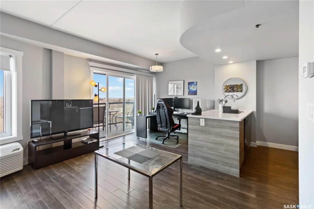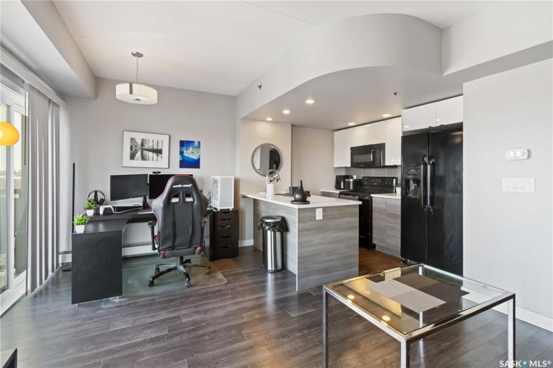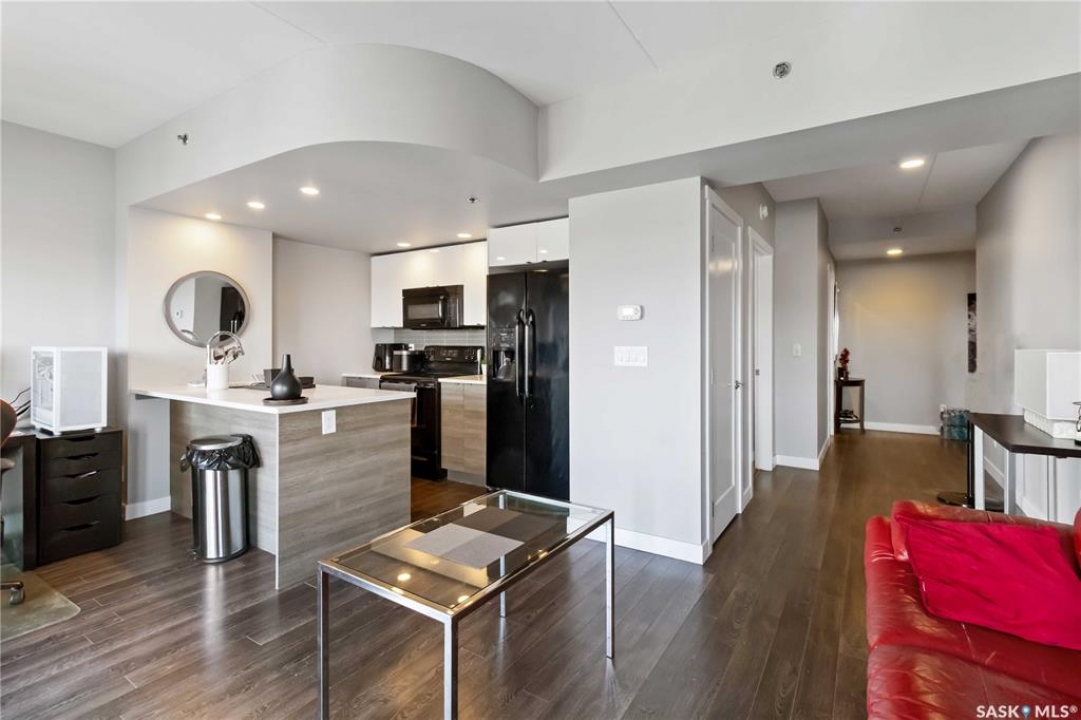 HIGH FLOOR CITY VIEWS, CITY LIVING, CORNER UNIT! Welcome to 550 4th Ave #801 a 601 sqft apartment located in downtown Saskatoon - originally built by North Prarie Developments. This primely located apartment features one bedroom and one bathroom. This unit features natural views of Saskatoon while also being located on the 8th floor with no neighbours located above. The living room and kitchen layout are hard to come by in this building with a spacious island and corner kitchen layout with the kitchen featuring quartz countertops, tile backsplash, and high-end finishes throughout. This unit benefits from plenty of natural sunlight during the day and beautiful sunset views. Featuring one underground parking space, park your car worry-free in downtown Saskatoon! Given its proximity to Royal University Hospital, Saskatoon City Hospital, the University of Saskatchewan, and Jim Pattison's Children's Hospital, this location is ideal for nearby commuters. In the summer time, take advantage of your proximity to Meewasin Trails, Condo Amenities like a rooftop BBQ space, and your proximity to local coffee shops and restaurants! This building was constructed using concrete - while also featuring modern design. Furniture can be negotiated! This unit is extremely unique featuring sunlight, being a corner unit, high floor, with a peninsula island, and spectacular location! Book your showing today!