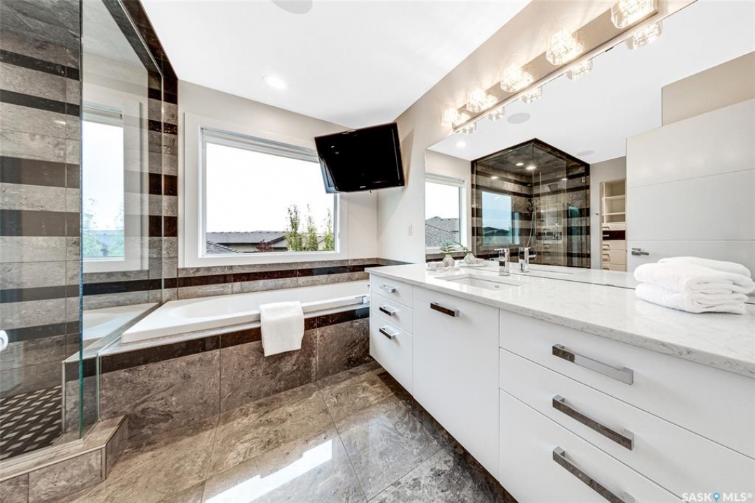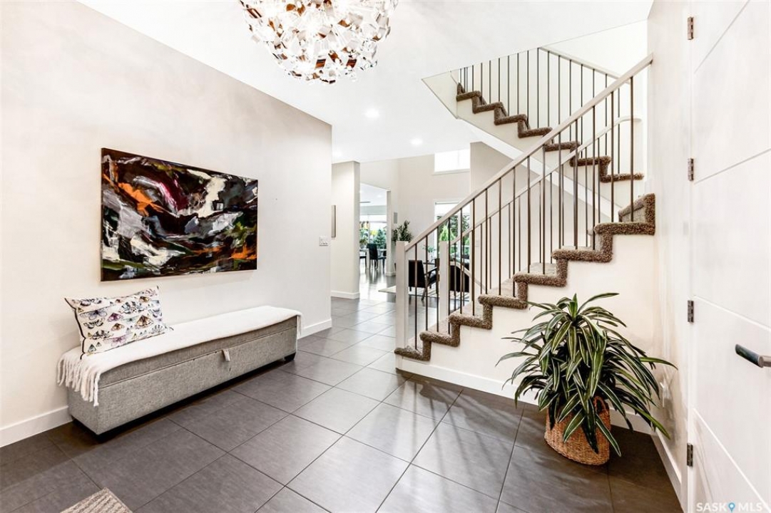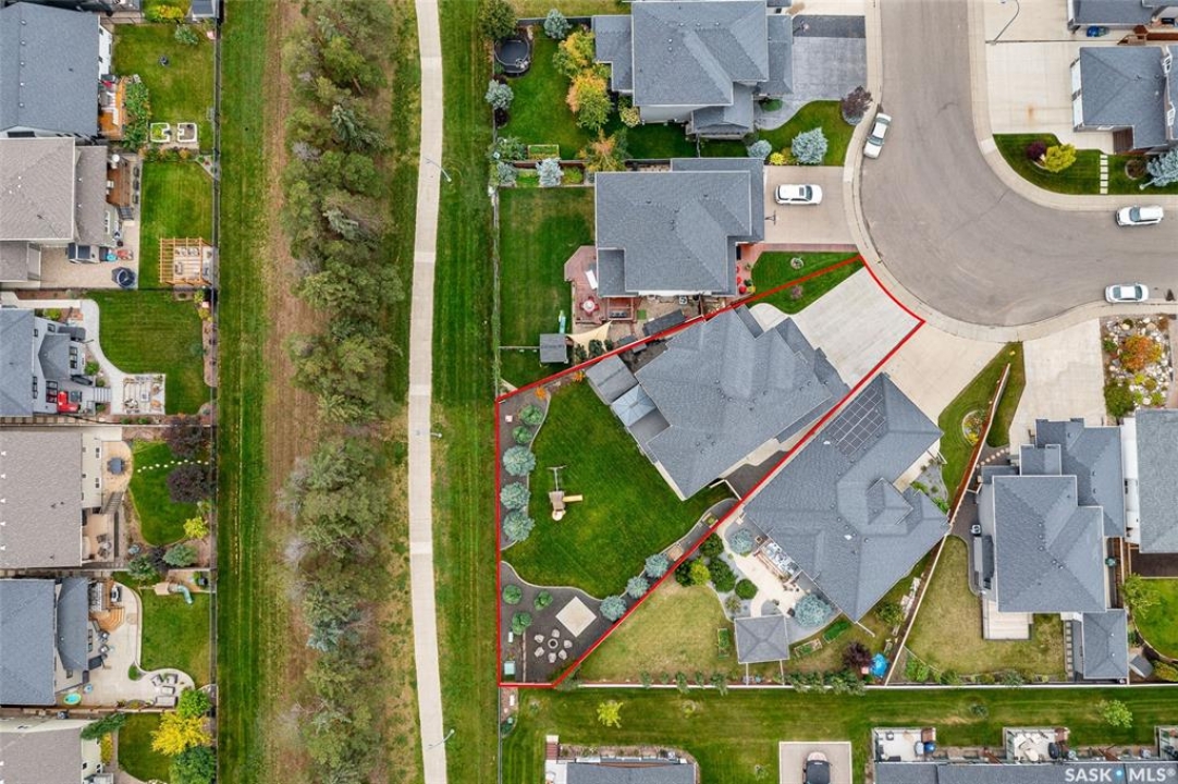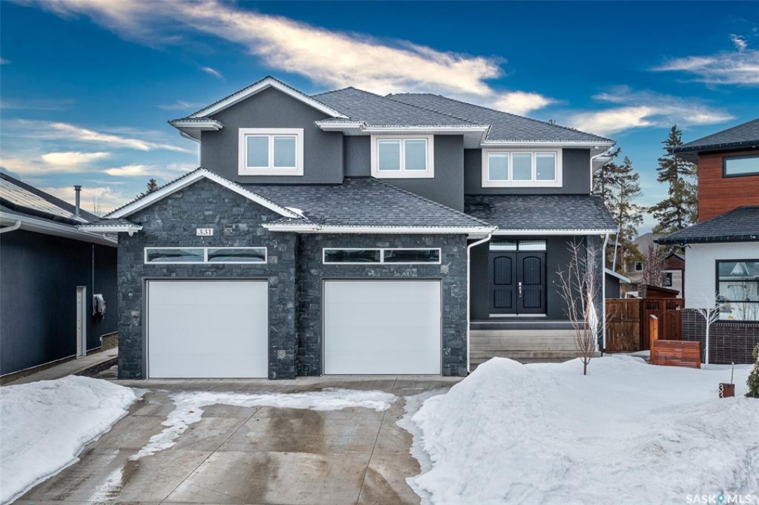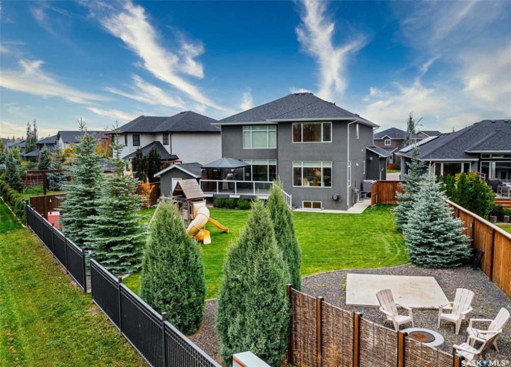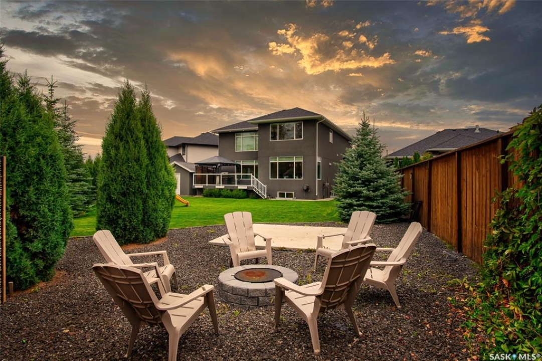 Tucked away on one of Evergreen's most desirable crescents, this exceptional two-storey home blends luxury, function, and timeless elegance on a massive pie-shaped lot backing the walking trails lined with mature Scots pine trees. From the striking curb appeal to the timeless finishes and extensive list of custom upgrades, every detail has been thoughtfully designed. Inside, a grand foyer leads into a living room with soaring ceilings and expansive windows that fill the space with natural light. At the heart of the home, the gourmet kitchen showcases Redl custom cabinetry, built-in Miele dual ovens with induction cooktop, quartz countertops, tile backsplash, and a large island with additional seating, seamlessly connected to the dining area overlooking the private backyard. The main floor also offers a dedicated office, a 2-piece bath, and a mudroom with direct access to the oversized heated staggered bay garage ( 28' x 22'/26') with 220v plug and hot/cold water taps. Upstairs, four spacious bedrooms await, including a luxurious primary suite with a custom walk-in closet and a spa-inspired ensuite featuring a jetted tub and steam shower—the perfect retreat after a long day. A full bathroom and convenient second-floor laundry complete this level. The fully developed basement adds versatility with a large family room and games area, a fifth bedroom, 4-piece bath, storage, mechanical room, and a future wet bar nook. Notable extras include central AC, HRV, HEPA air filter, “hide-a-hose” central vac, Control4 audio with built-in speakers throughout, and more. Outside, the expansive backyard offers endless potential for entertaining, a future pool, or simply enjoying the serenity of your private outdoor escape. Ideally situated near the Forestry Farm and zoo, an array of amenities, school bus pick up, elementary and high schools, this rare property offers the perfect balance of comfort and lifestyle in one of Saskatoon's most coveted neighbourhoods.