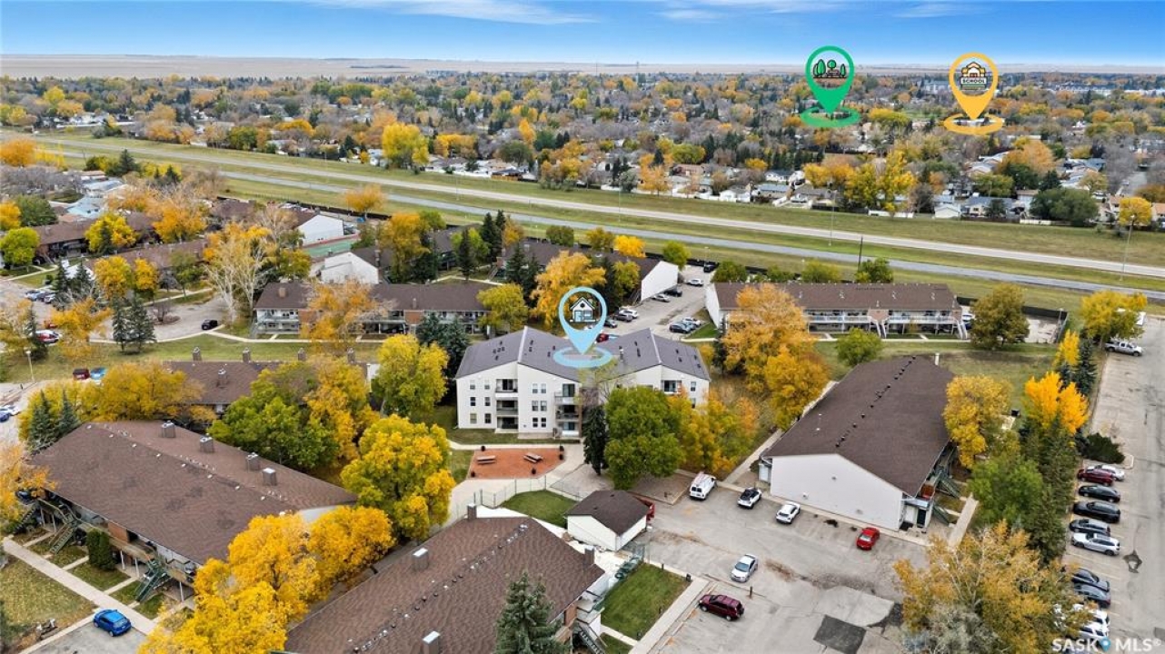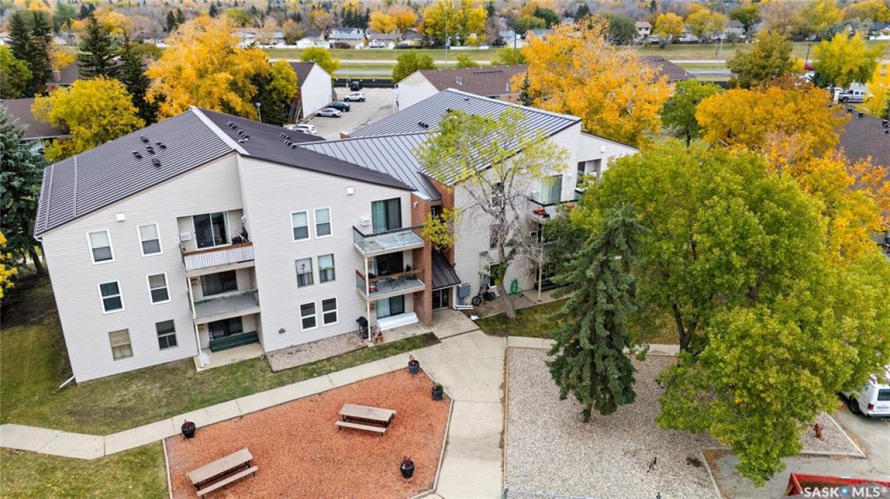 Searching for your first home or a solid investment opportunity? This well-kept, clean 1 bedroom, 1 bathroom corner-unit condo offers comfort, convenience, and excellent value. The bright open-concept living and dining area provides an inviting space to relax, with patio doors framing a pleasant view and allowing plenty of natural light. The galley-style kitchen is both practical and efficient, offering ample cupboard and counter space to make everyday cooking easy. Adjacent to the kitchen, the breakfast nook can easily double as a compact home office or workspace. The bathroom has been updated with a refreshed BathFitter tub surround. A generous in-suite storage room provides secure and convenient space for items such as a small deep freeze, bicycle, luggage, or seasonal tires. Step outside onto your private balcony to enjoy tranquil views of the landscaped greenspace—perfect for morning coffee or unwinding at the end of the day. Flooring throughout the main living areas was updated three years ago. The unit includes one electrified parking stall (stall #54) and is pet-friendly with restrictions. Monthly condo fees of $375.09 cover heat, water, exterior maintenance, building insurance, and contributions to the reserve fund, offering a low-stress lifestyle or easy rental management. A common laundry room is located on the main floor. Medford Mews is ideally situated close to Normanview Shopping Centre, public transit, a gym, grocery stores, restaurants, and Galaxy Cinema—everything you need just steps away. Whether you're ready to move out of the rental market or expand your real estate portfolio with a low-maintenance property, this condo truly delivers. Previously rented for $1,100 per month.
