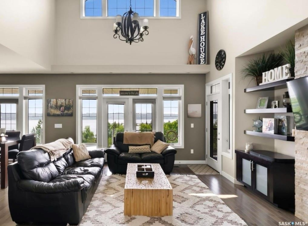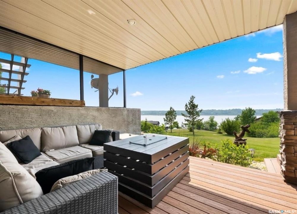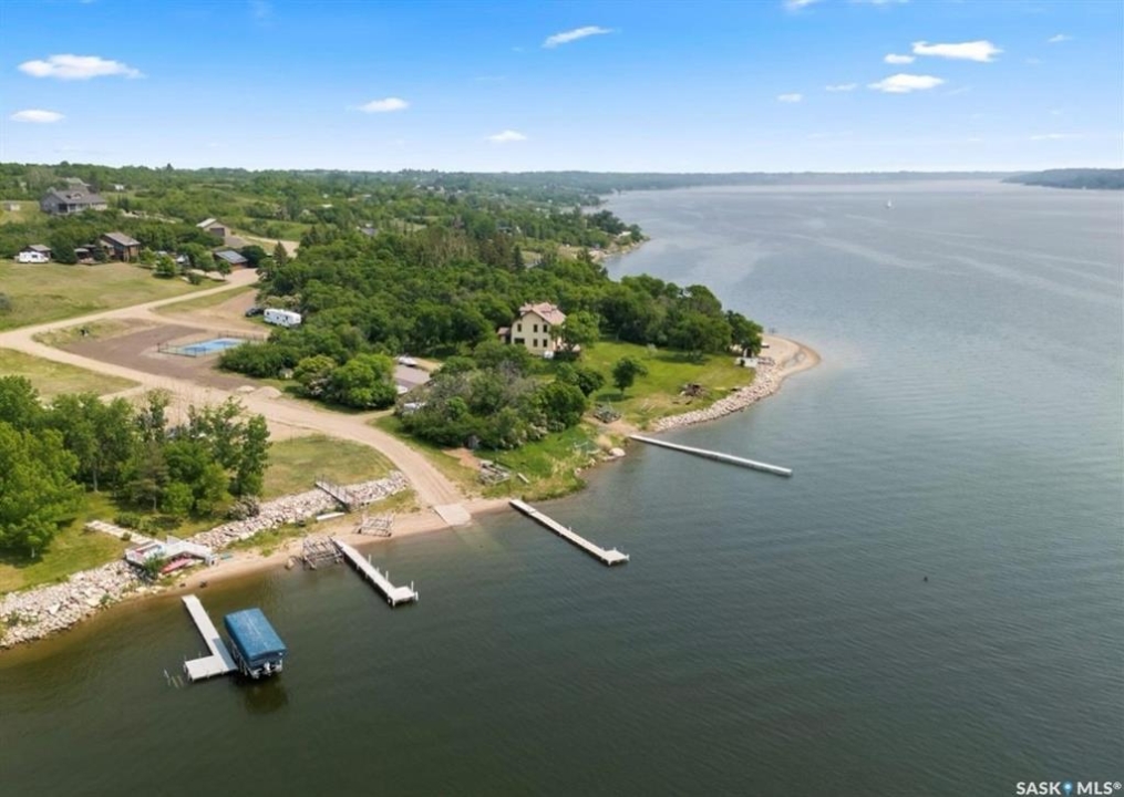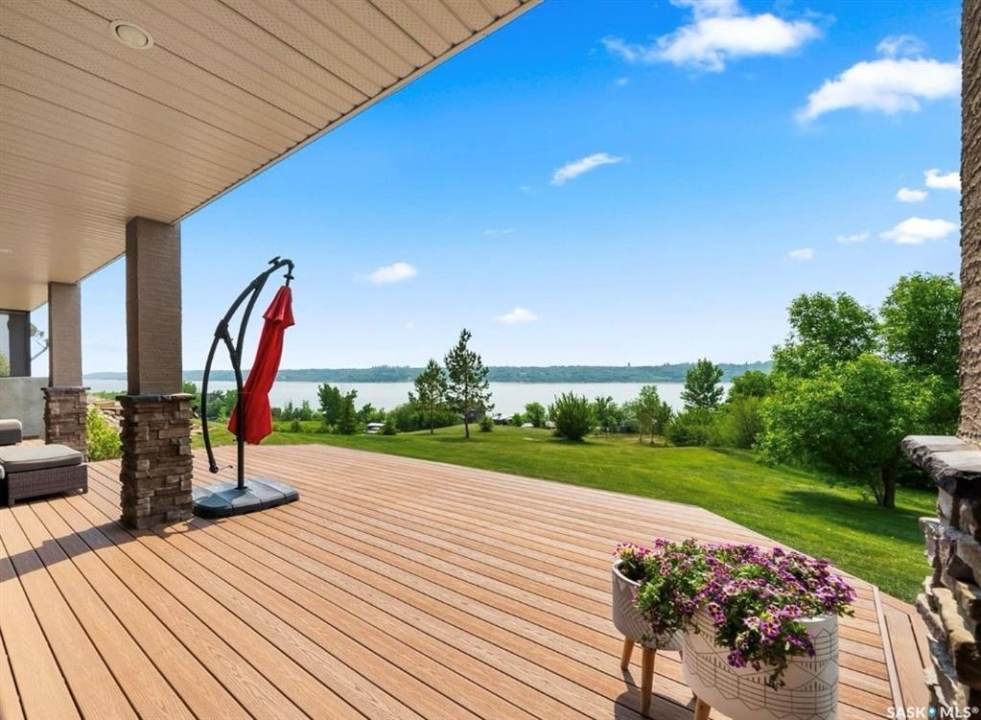 If stunning lake views and serene Saskatchewan skies are your vibe, you just stumbled onto a little slice of paradise you'll never want to leave. Situated on 1.26 acres in the friendly lake community of Shore Acres just 40 minutes outside of Regina, this amazing walkout bungalow is ready for new owners to make memories. Built by Varsity homes, the unique "california king" floor plan offers an open concept with 2 bedrooms on the main floor and a deck with access from both spanning nearly the entire length of the house. Trust me when I say - you've probably got the best view of anyone, from anywhere in this house. A cozy living area with gas fireplace accented with stack stone flows effortlessly into the dining area featuring access to the deck, and an eat-up island. Carrying on into the kitchen, enjoy an abundance of cabinetry, granite countertops, and stainless steel appliances. The primary room features built in shelving, a walk in closet, a 4pc ensuite with tile shower and soaker tub (another incredible view from here) and access to a screened in private deck. The other wing of the home features the second bedroom, main 4pc bathroom, and direct entry access to the 24x24 heated garage with epoxy flooring & mezzanine storage. Natural light dances throughout this home, and is especially bright in the upstairs loft. Flooded with windows, this space overlooks the main living room below, and is the perfect space for an office, art studio, or home schooling room. The basement is every man's dream - a wet bar with beer/wine fridge, room for a pool table, an expansive rec room with an entertainment unit fit for a king. Add on a 4pc bathroom, 2 additional super spacious bedrooms, and access to the yard, and this walkout basement simply feels like an extension of the main floor. There is a second driveway leading to the 24 x 34 heated shop, featuring 10 ft. doors front & back and a floor drain. This is truly a property you have to see and experience for yourself!
