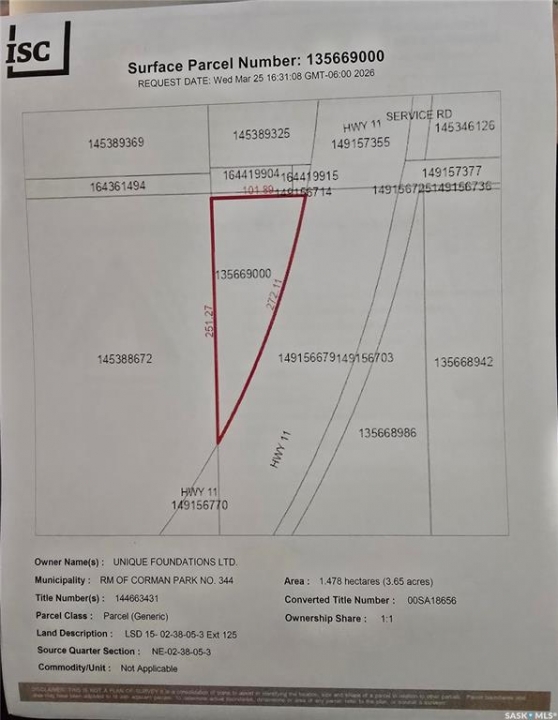 Minutes form Saskatoon. Residential Zoned DCR1. Over 890 feet (272 M) of Highway frontage. 3.6 ACRES West of or beside the "SASKATOON SHINES" Sign. Access through Clark's Crossing Road. Services located in ditch or on 'Clarks Crossing Road (TWP RD 381).' Great investment opportunity. From Hwy 11 go West on Corman Park Road for 1 km then South/Left on RGE RD 3052 for 1.5 km then East/Left on Clarks Crossing Rd (TWP RD 381) for 1 km (to end). Property on Right.