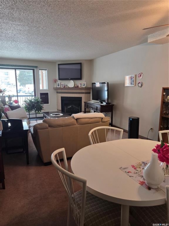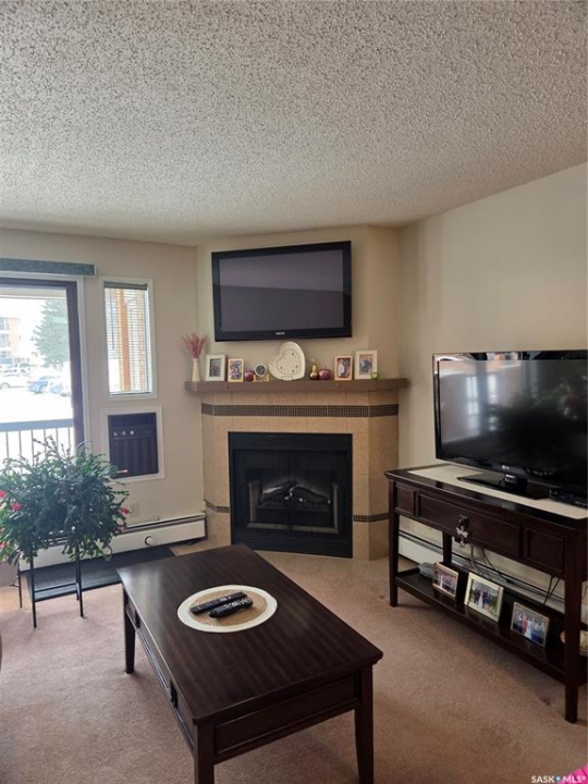 Welcome to this neat and tidy one bedroom main floor unit in a very well maintained complex. Bright and comfortable floor plan with patio doors off living room leading to a cozy south east facing balcony with extra storage area, spacious bedroom with walk in closet, ensuite laundry/storage room, surface parking stall and an amenities room right in the building. Conviently located with all amenities, and bus routes close by and a quick commute to the U of S campus (perfect for students!), city centre, river paths and Meewasin Trail. TV above the fireplace is included. Dogs are not allowed but cats are allowed with board approval. Check out the neighbourhood at https://lawsonheights.ca