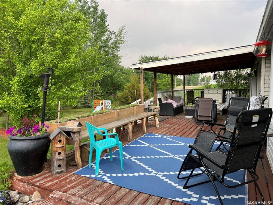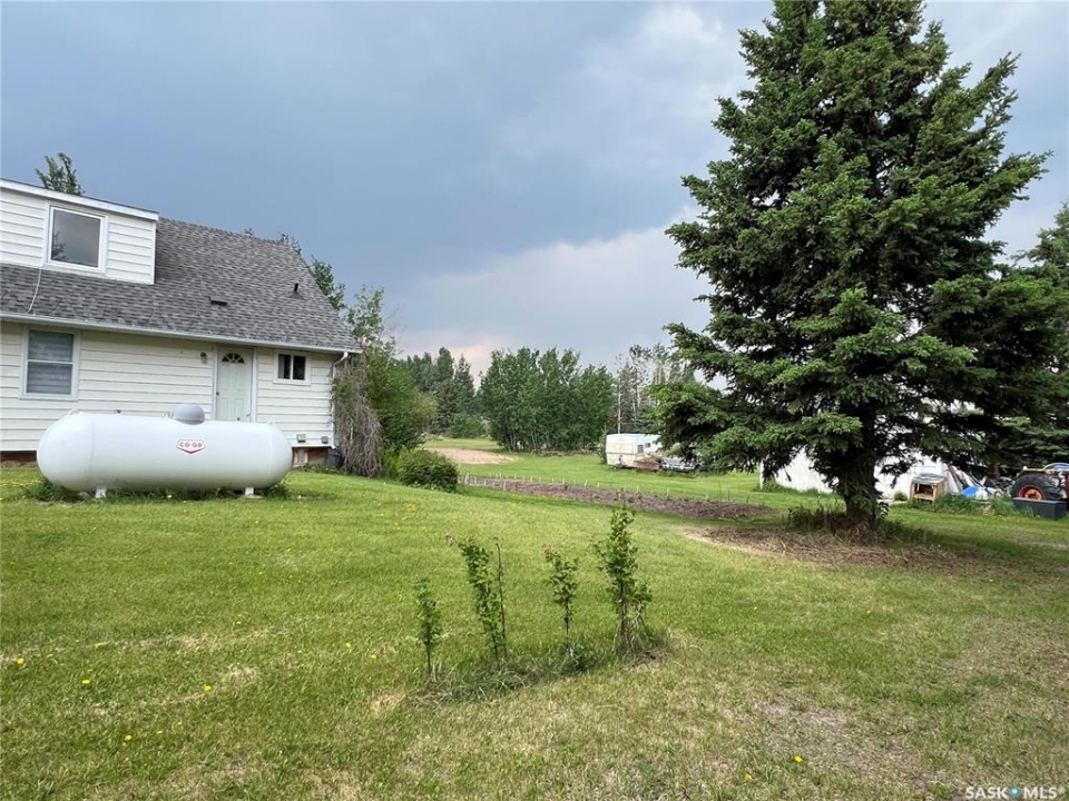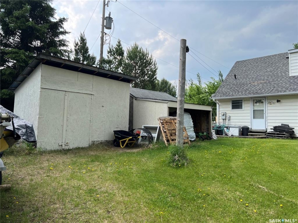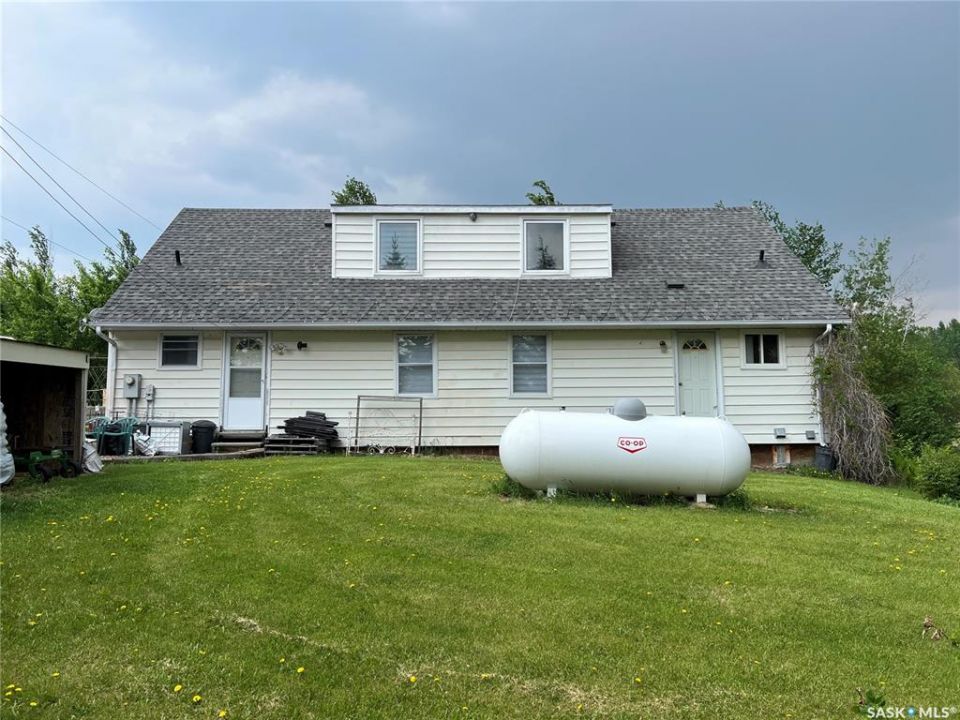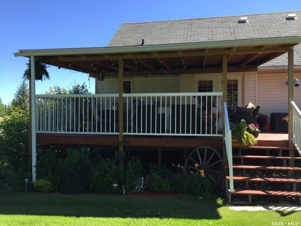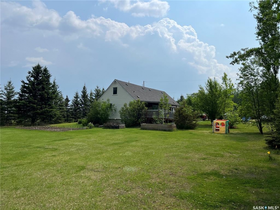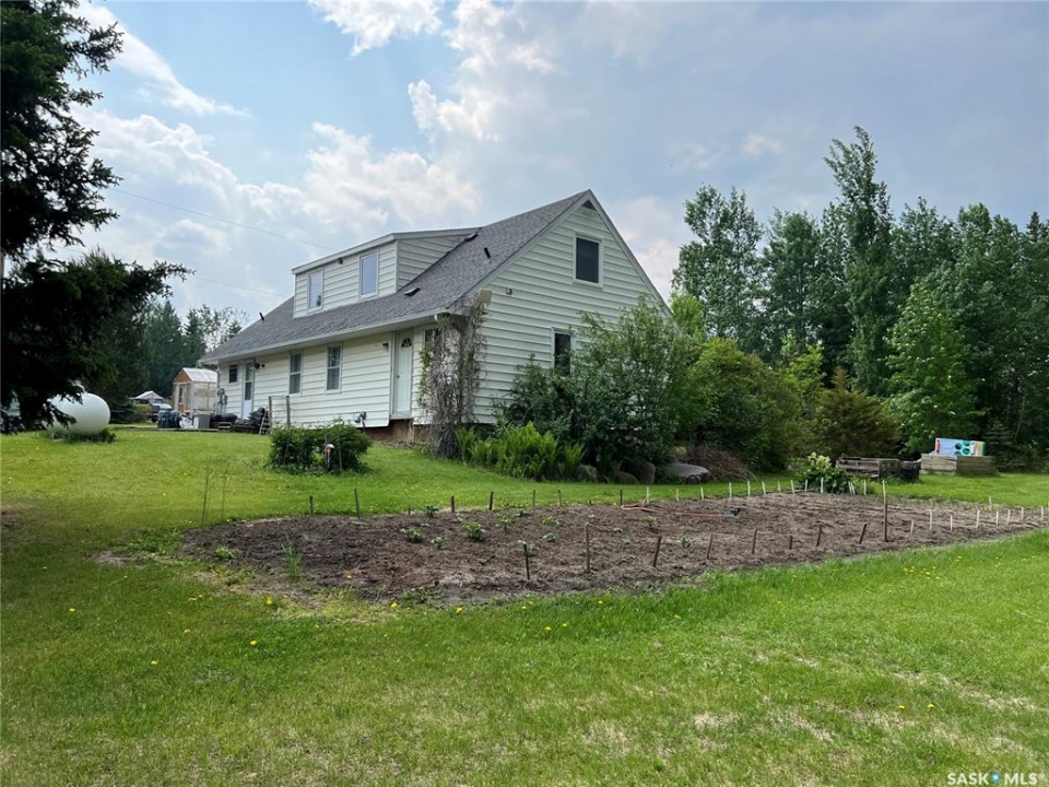 Pride in ownership really shows in this property. This beautiful 5 bedroom home is located in the quiet community of Dorintosh, 5 minutes from the Meadow Lake Provincial Park, giving you access to beautiful lakes, fishing, hiking, quading, swimming, boating, cross country skiing, snowmobiling and mini golf. Main level features kitchen, dining room with access to covered deck, living room with new pellet stove in 2024, primary bedroom with walk in closet, 2 bathrooms and main floor laundry. 2nd level consists of 4 nice sized bedrooms with original hardwood flooring. House was moved onto a 4ft crawl space in 2009 and totally updated at that time. Energy efficiency program was done in 2009 which included new insulation and new Hi-eff furnace. All new windows except primary bedroom and one bathroom. New shingles in 2019, washer & dryer 2024 and 3pc bathroom was updated in 2023. New flooring & light fixtures in kitchen and some fresh paint throughout. Yard is beautifully landscaped with garden area, raised beds, perennial flowers, raspberries, 2 apple trees, asparagus & rhubarb. Outbuildings include a C-Can shop with attached storage shed, two 8x10 storage sheds and a fenced dog run. The property is comprised of two lots which gives you lots of space for RV parking and lake toys! This property is a must see!!