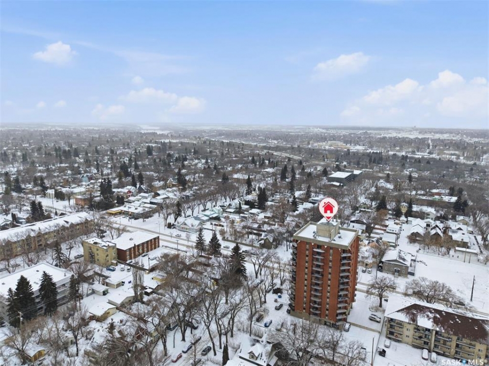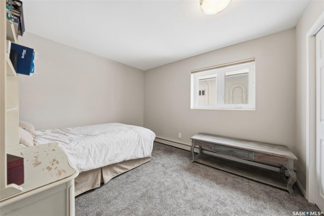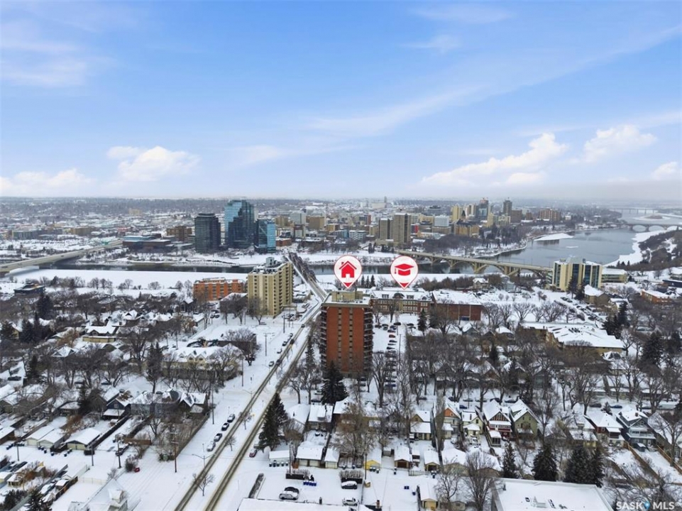 Amazing location on this fully renovated 2-bedroom, 2-bathroom condo in the heart of Nutana! This move-in-ready unit boasts two private balconies and two parking stalls for convenience and outdoor space. This unit has been updated in meticulous detail, including upgraded vinyl flooring and carpet throughout, refreshed lighting, trim, paint, baseboards, and doors. The kitchen has been completely redone with white cabinetry, a modern backsplash, upgraded countertops, and stainless steel appliances. The kitchen flows seamlessly into the dining area and living area. The large living room flows to the east facing deck, perfect for relaxing or entertaining. The primary bedroom is generously sized and includes double closets and a 4-piece en-suite, and its own private deck, while the secondary bedroom is also spacious and adjacent to the full main bathroom. A large laundry and storage room provide practical space for everyday living. Upgraded windows, doors, and blinds enhance the bright, open feel of the home, while a newer wall-mounted air conditioning unit keeps the space comfortable year-round. Residents enjoy building amenities such as a meeting room, gym, and sauna. The quiet, concrete building offers both privacy and durability. This building features recently replaced elevators and a redone entry and foyer. Ideally located just steps from the South Saskatchewan River, this condo is also close to restaurants, local shops, and the University of Saskatchewan. Perfect for those seeking a stylish, turn-key home in a vibrant, convenient neighborhood, this fully renovated Nutana condo is ready for you to move in and enjoy. Don't miss this opportunity to own a modern, updated condo in one of Saskatoon's most desirable areas!