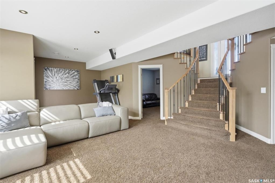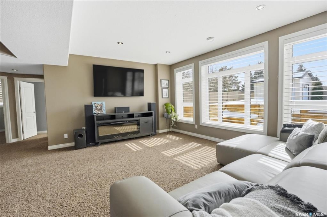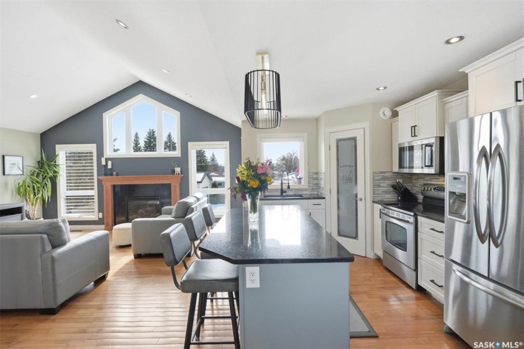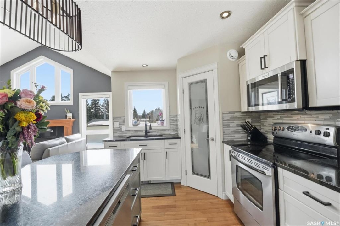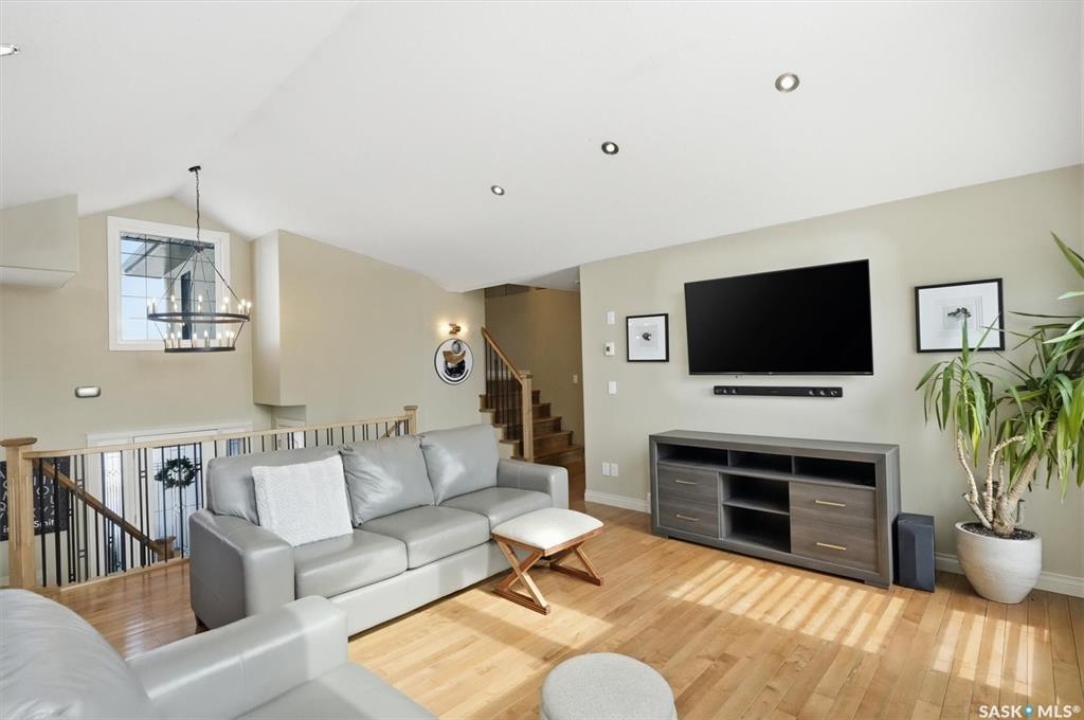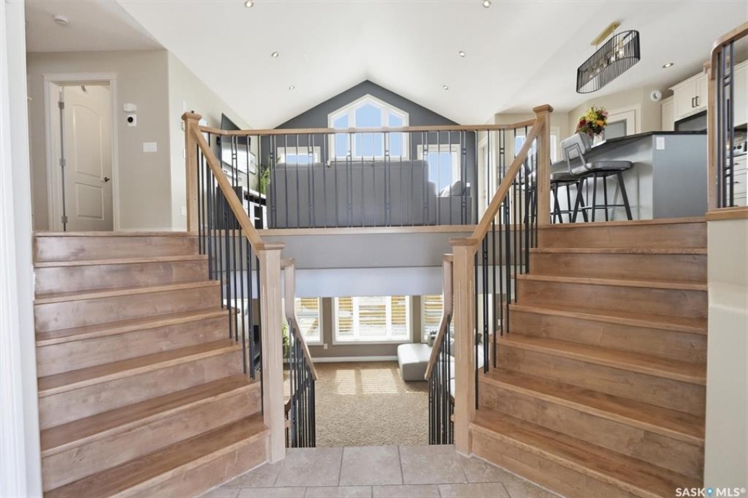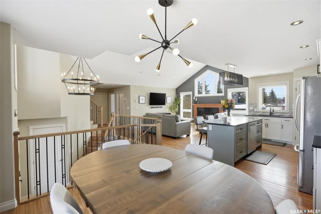 Absolutely stunning home in the vibrant and growing community of Dalmeny, just 12 minutes from Saskatoon. Tucked away on a quiet street, this beautifully designed modified bi-level walkout offers a perfect blend of style, space, and functionality for family living. Boasting five bedrooms plus a den and three full bathrooms, there's room for everyone. The private primary retreat, featuring vaulted ceilings, is thoughtfully positioned above the garage, while two additional bedrooms are conveniently located on the main floor. The bright, open-concept living area is warm and inviting, highlighted by a cozy gas fireplace, rich hardwood flooring, ceramic tile, and a well-appointed kitchen complete with maple cabinetry and sleek black granite countertops. A spacious mudroom off the double attached garage with in-floor heat adds everyday convenience. The fully developed, walk-out basement extends the living space with a bright family room, gym area, two more bedrooms, a den, a full bathroom, plush carpeting, ceramic tile, and the added comfort of in-floor heating. Quality craftsmanship is evident throughout, with features such as triple-pane windows, a tankless water heater, high-efficiency furnace, central air conditioning, central vacuum, and underground sprinklers. Step outside to a beautifully landscaped backyard designed for entertaining, featuring a sunken patio, RV parking, a firepit area, and a deck off the kitchen with a natural gas hookup. Completing the property is a triple driveway and a 16' x 16' detached garage with back alley access. This exceptional home truly has it all.
