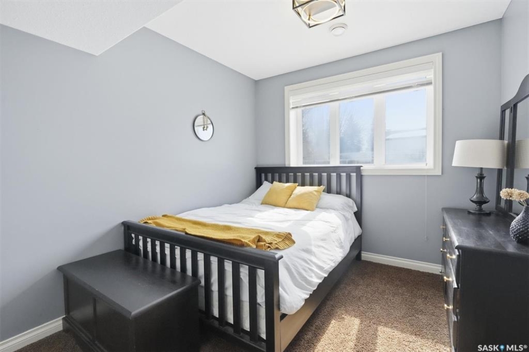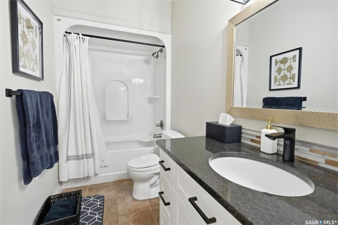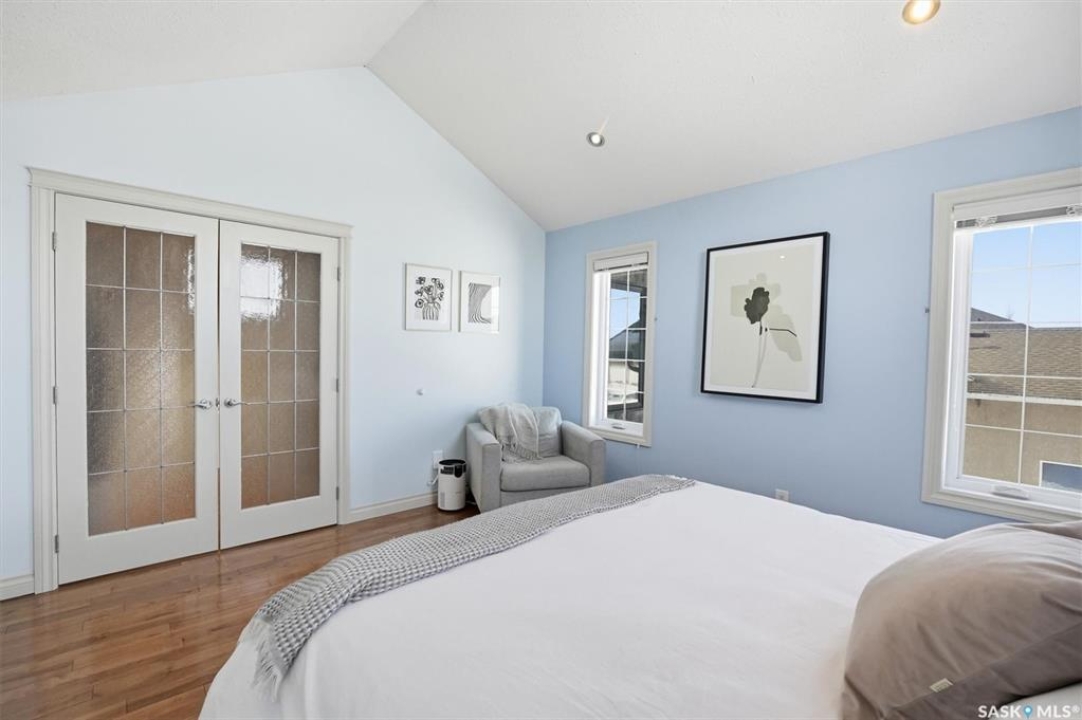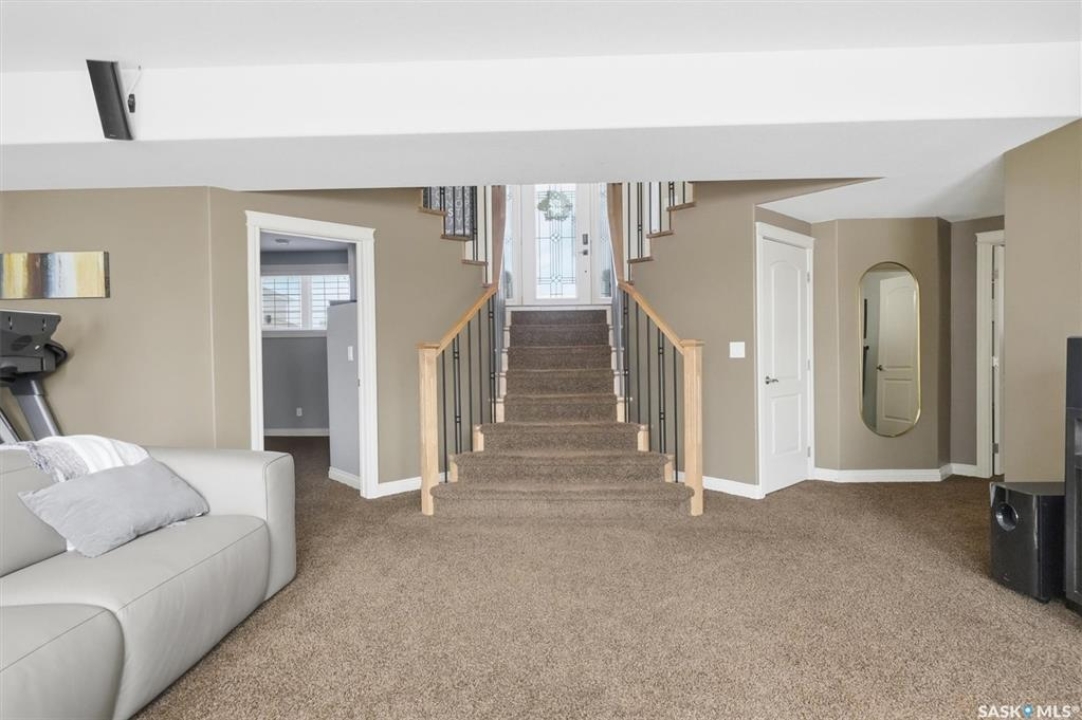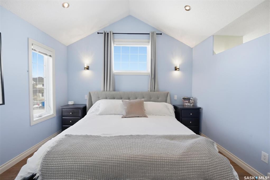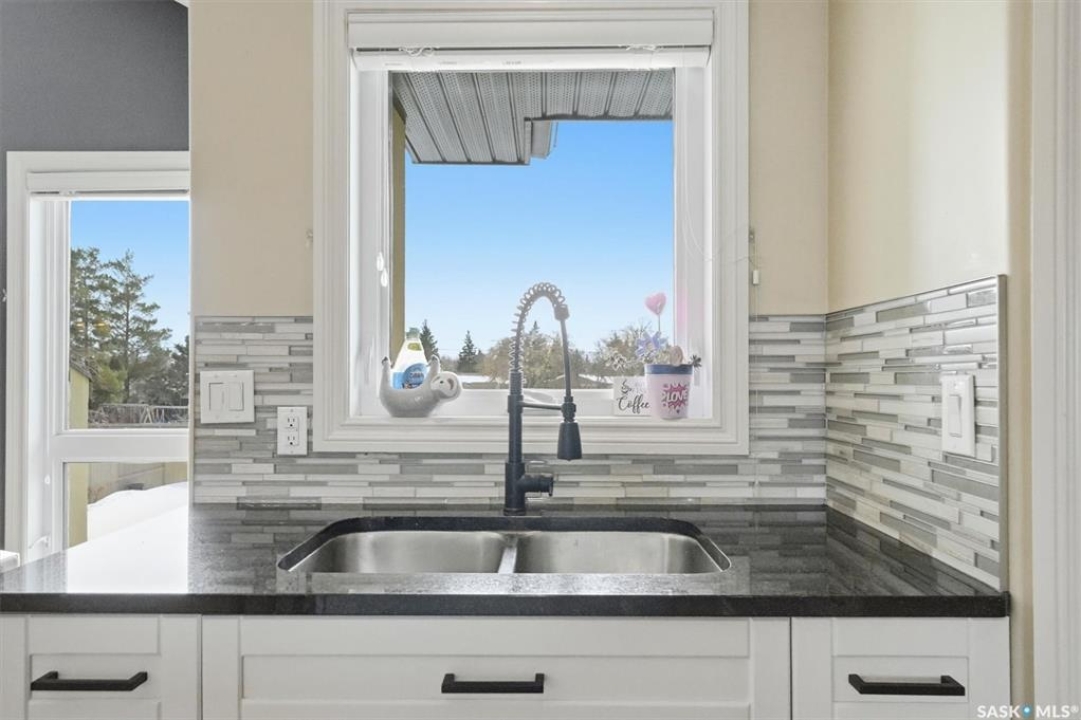 Absolutely stunning home in the vibrant and growing community of Dalmeny, just 12 minutes from Saskatoon. Tucked away on a quiet street, this beautifully designed modified bi-level walkout offers a perfect blend of style, space, and functionality for family living. Boasting five bedrooms plus a den and three full bathrooms, there's room for everyone. The private primary retreat, featuring vaulted ceilings, is thoughtfully positioned above the garage, while two additional bedrooms are conveniently located on the main floor. The bright, open-concept living area is warm and inviting, highlighted by a cozy gas fireplace, rich hardwood flooring, ceramic tile, and a well-appointed kitchen complete with maple cabinetry and sleek black granite countertops. A spacious mudroom off the double attached garage with in-floor heat adds everyday convenience. The fully developed, walk-out basement extends the living space with a bright family room, gym area, two more bedrooms, a den, a full bathroom, plush carpeting, ceramic tile, and the added comfort of in-floor heating. Quality craftsmanship is evident throughout, with features such as triple-pane windows, a tankless water heater, high-efficiency furnace, central air conditioning, central vacuum, and underground sprinklers. Step outside to a beautifully landscaped backyard designed for entertaining, featuring a sunken patio, RV parking, a firepit area, and a deck off the kitchen with a natural gas hookup. Completing the property is a triple driveway and a 16' x 16' detached garage with back alley access. This exceptional home truly has it all.