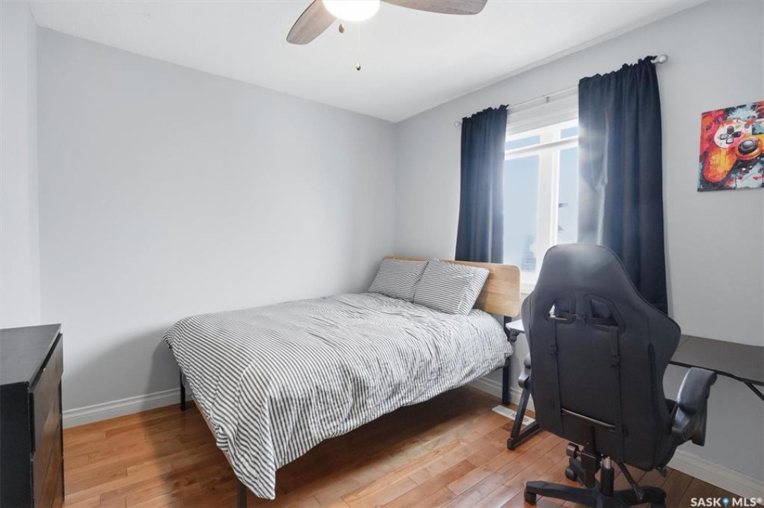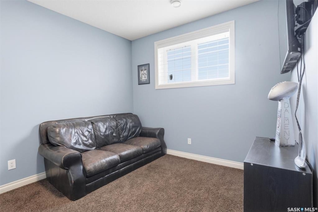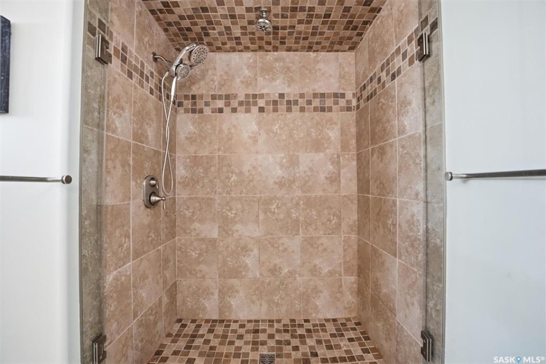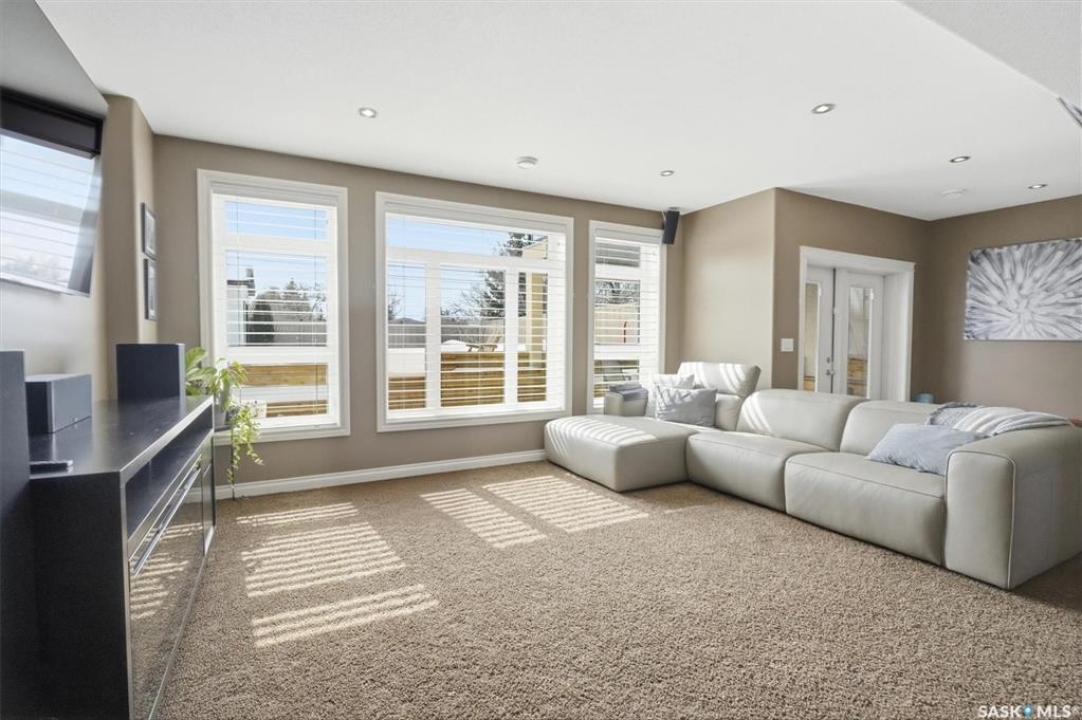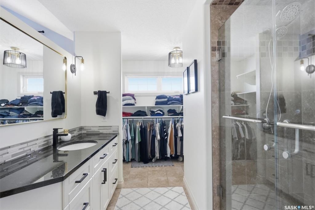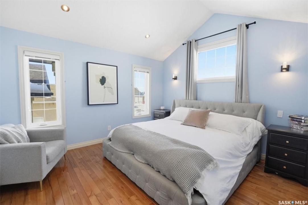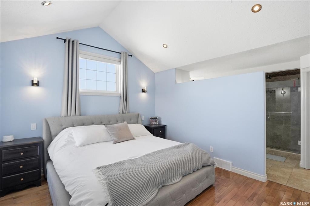 Absolutely stunning home in the vibrant and growing community of Dalmeny, just 12 minutes from Saskatoon. Tucked away on a quiet street, this beautifully designed modified bi-level walkout offers a perfect blend of style, space, and functionality for family living. Boasting five bedrooms plus a den and three full bathrooms, there's room for everyone. The private primary retreat, featuring vaulted ceilings, is thoughtfully positioned above the garage, while two additional bedrooms are conveniently located on the main floor. The bright, open-concept living area is warm and inviting, highlighted by a cozy gas fireplace, rich hardwood flooring, ceramic tile, and a well-appointed kitchen complete with maple cabinetry and sleek black granite countertops. A spacious mudroom off the double attached garage with in-floor heat adds everyday convenience. The fully developed, walk-out basement extends the living space with a bright family room, gym area, two more bedrooms, a den, a full bathroom, plush carpeting, ceramic tile, and the added comfort of in-floor heating. Quality craftsmanship is evident throughout, with features such as triple-pane windows, a tankless water heater, high-efficiency furnace, central air conditioning, central vacuum, and underground sprinklers. Step outside to a beautifully landscaped backyard designed for entertaining, featuring a sunken patio, RV parking, a firepit area, and a deck off the kitchen with a natural gas hookup. Completing the property is a triple driveway and a 16' x 16' detached garage with back alley access. This exceptional home truly has it all.