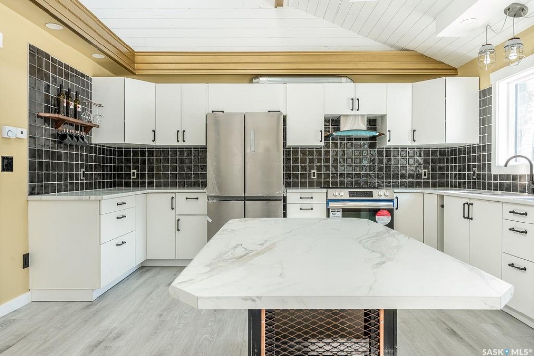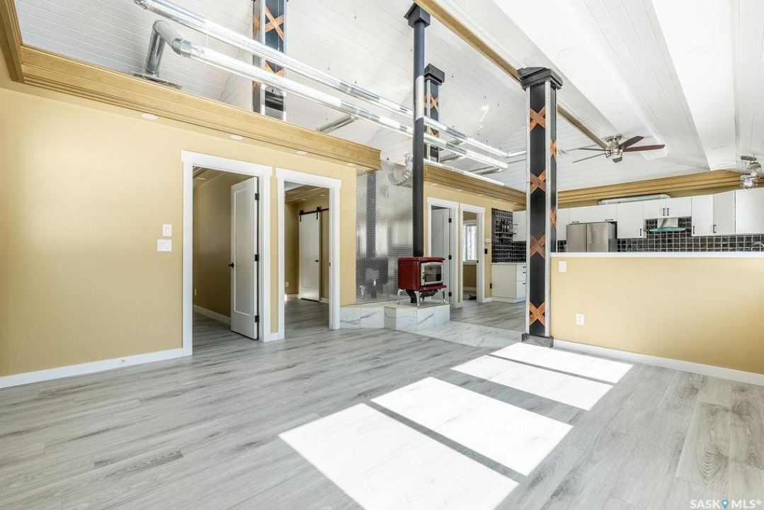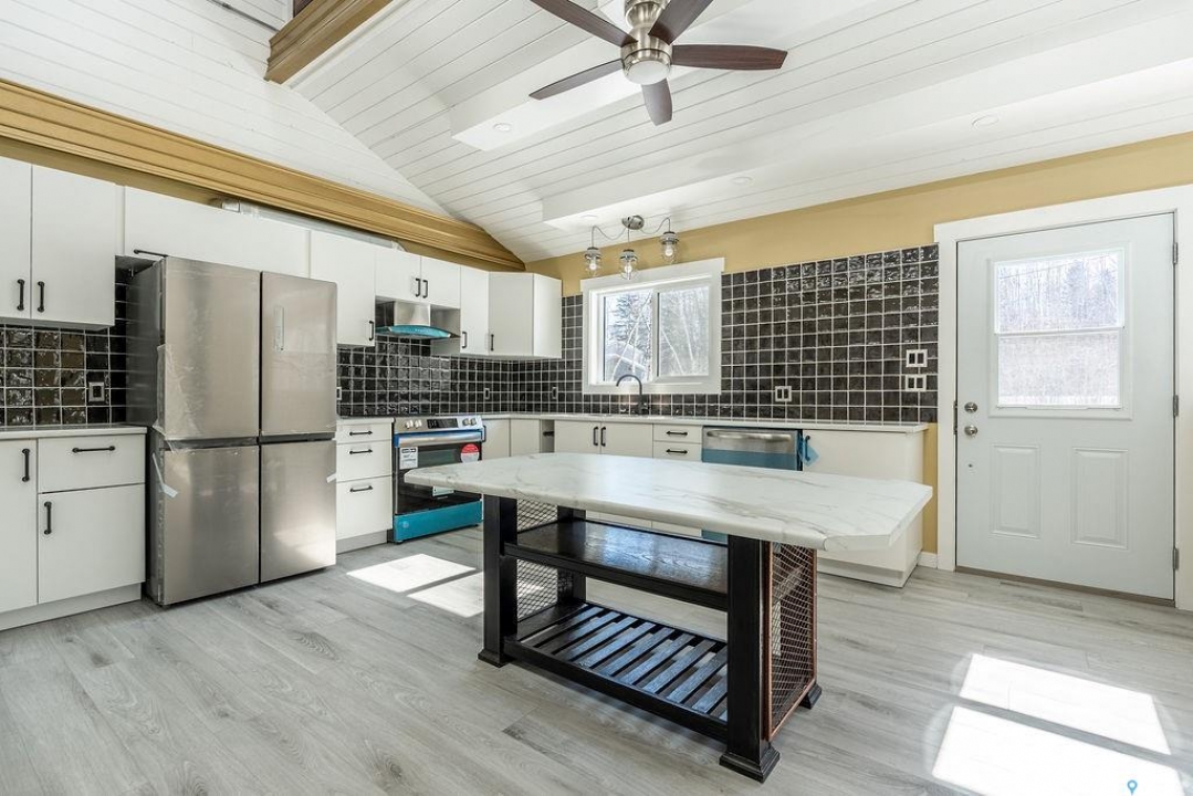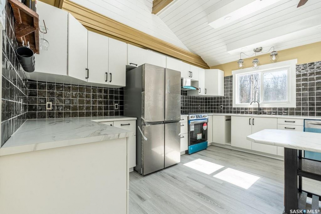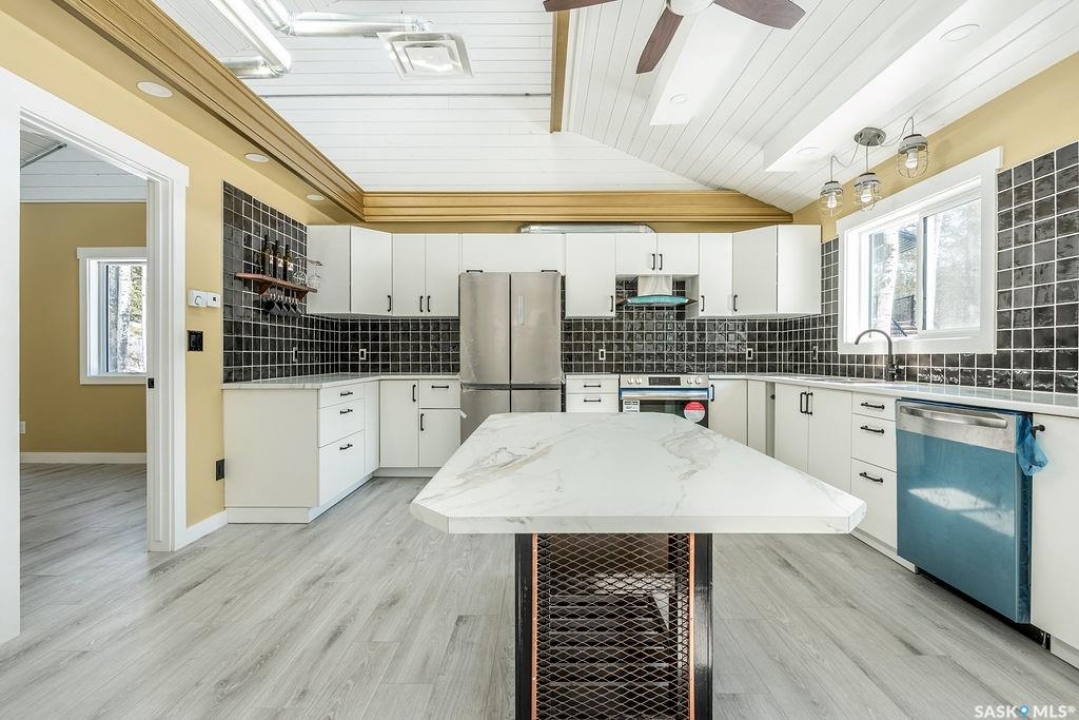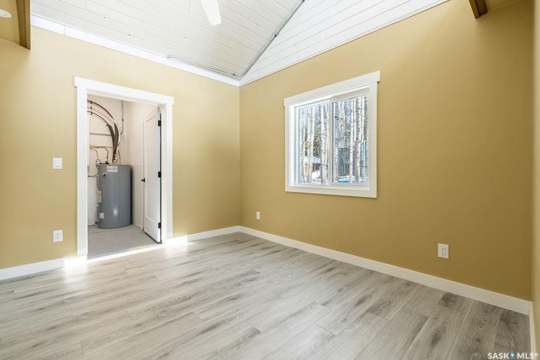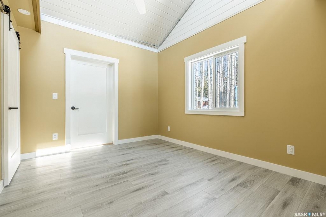 Welcome to 1 May Bay in Pickerel Point at Delaronde Lake — a brand new, never-lived-in cabin that perfectly blends modern industrial style with the peaceful beauty of lake life. This stunning 998 sq. ft. cabin features 3 bedrooms and 1 full bathroom, designed for comfort, style, and easy living. Step inside and you'll immediately notice the impressive 18-ft vaulted ceilings and the abundance of windows that fill the space with natural light. The upper windows are equipped with electric blinds for convenience and comfort. The kitchen is beautifully finished with an eat-up island, brand new stainless steel appliances, and soft-close cabinetry throughout, while extra pot lights have been added across the home to create a bright, welcoming space day or night. Each bedroom includes its own closet with a custom-built barn door complete with coat hooks, adding both character and functionality. The living room features a striking red porcelain wood stove, creating a cozy focal point for cooler evenings. Heated floors run throughout the entire cabin, and vinyl plank flooring makes for durable, low-maintenance living. Custom gold trim accents around the rooms add a unique and stylish finishing touch. The cabin also includes in-home laundry for everyday convenience. Outside, the property offers plenty of space with room to build a future garage, a long gravel driveway perfect for parking RVs and boats, and a gravel patio area ready for outdoor entertaining. The yard is beautifully natural with bush, Saskatoon berry bushes, and newly planted oak trees. Located just a short walk to the water, marina, and boat dock, this property is part of a fantastic lake community and is the perfect place for boating, fishing, relaxing, and making memories year-round.