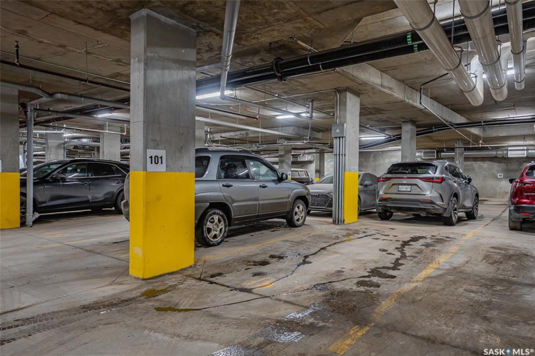 OVERLOOKING THE PARK!!!! SOUTH FACING!!! The best location in THE BANKS!! Amazing opportunity for home ownership or rental. Surrounded by great businesses, shops, cafes, and local markets. Just steps to the river and river landing with it's walking trails. Enjoy this minimalist convenient LIFESTYLE!!! Sheik modern vibe in this 1 bedroom + den unit. Super bright offering well laid out kitchen offering quarts counter tops, stainless steel back splash and a handy computer desk area. Dual sliding door to the multifunctional den could be used for a den, office or guest room. Stacking washer/dryer. Titled heated underground parking stall included. Bonus is the dedicated storage unit. And as an owner, you'll enjoy access to multiple rooftop patios — ideal for relaxing evenings, entertaining friends, or soaking in the city skyline. Don't miss out on this fabulous property!!