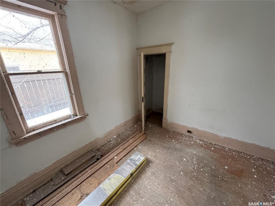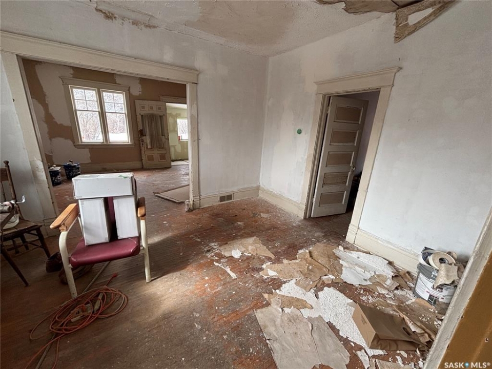 Carpenter's special in Delisle. This character bungalow has some work started but needs a complete renovation to be liveable. 2 bedrooms, 1 bath, main floor laundry. Some hardwood floors visible. Corner lot