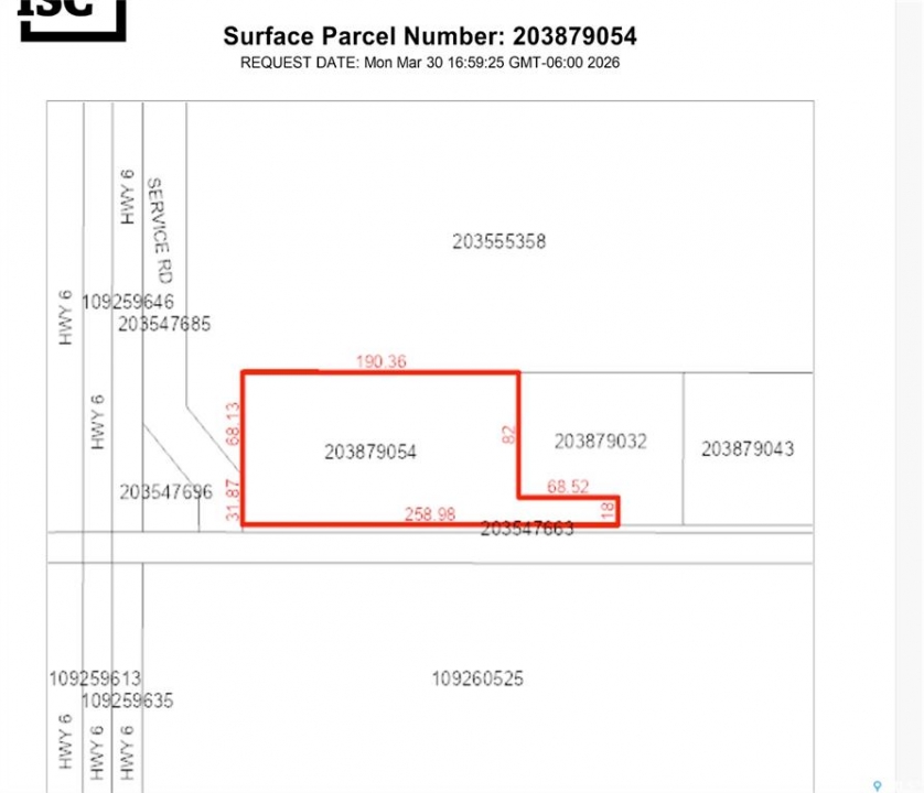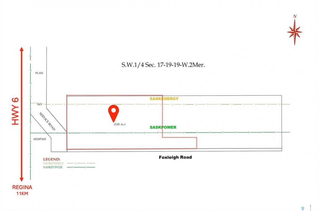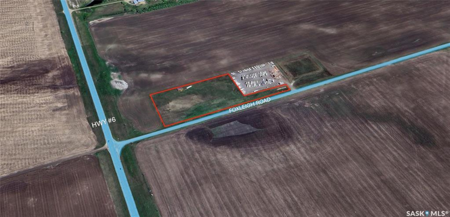 Seize an exceptional opportunity to own 5 acres of highway commercial land just north of Regina on Highway 6 and Foxleigh road, located 11 km (approximately 6 minutes) north of the city limit. Positioned at the northeast corner of Highway 6 and Foxleigh Road and immediately east of a proposed service road, this site offers outstanding visibility and high traffic exposure, ideal for commercial development, a showhome with warehouse/shops, storage expansion, RV sales, or other complementary businesses. On-site utilities include gas and power; water and sewer access via cistern and septic. Adjacent camper storage enhances commercial potential. Zoned HC(Highway Commercial), ready for development.