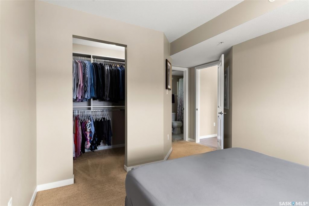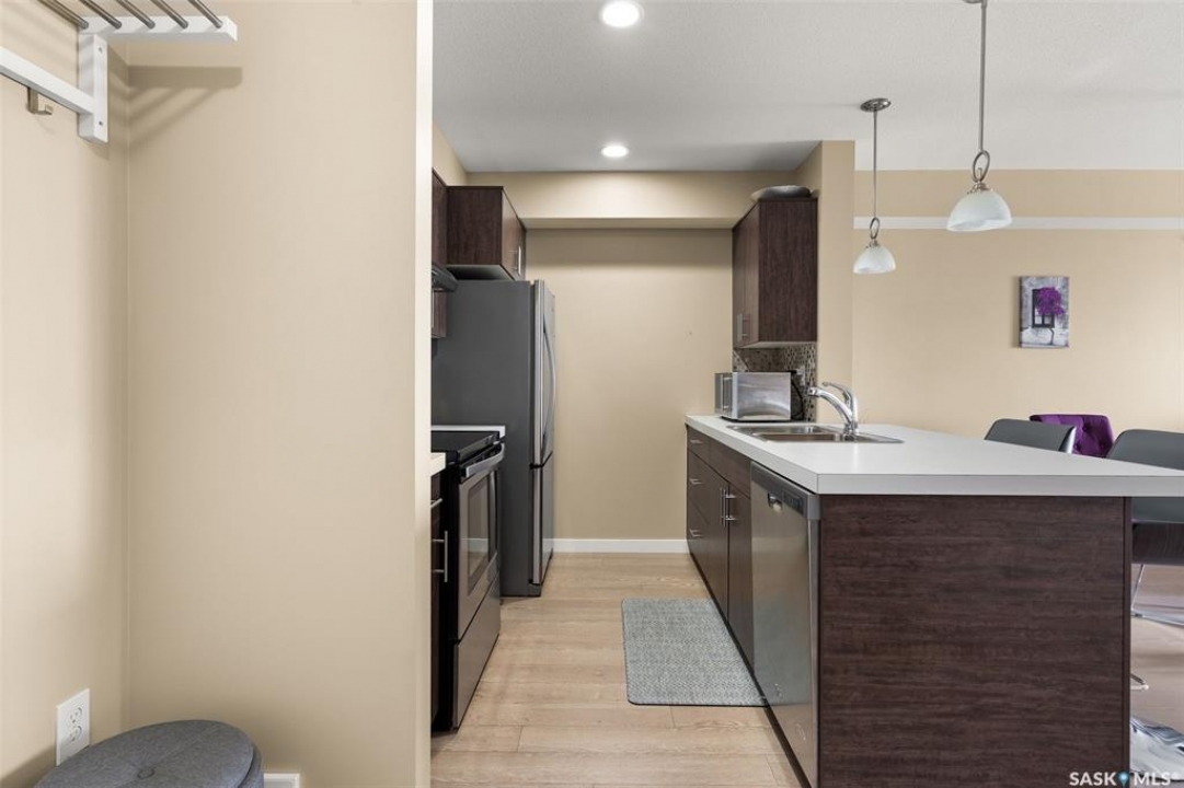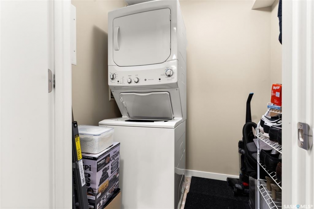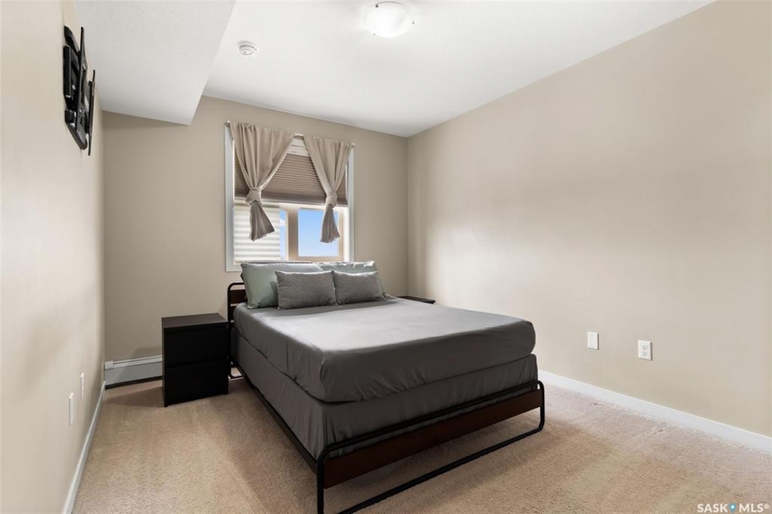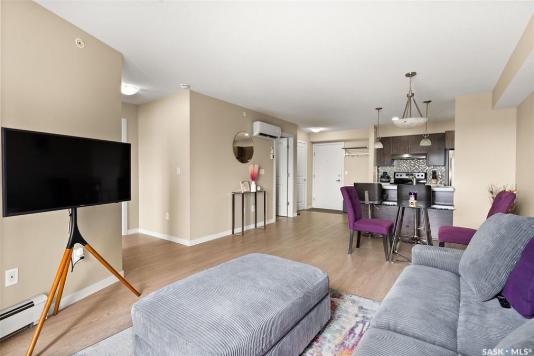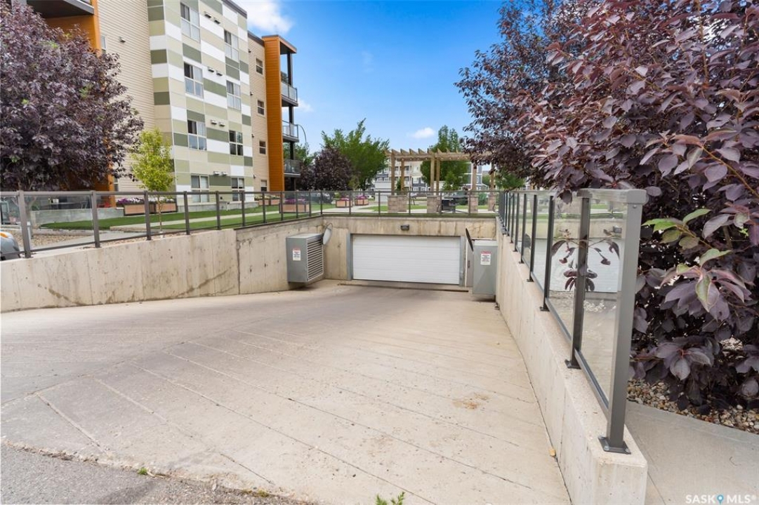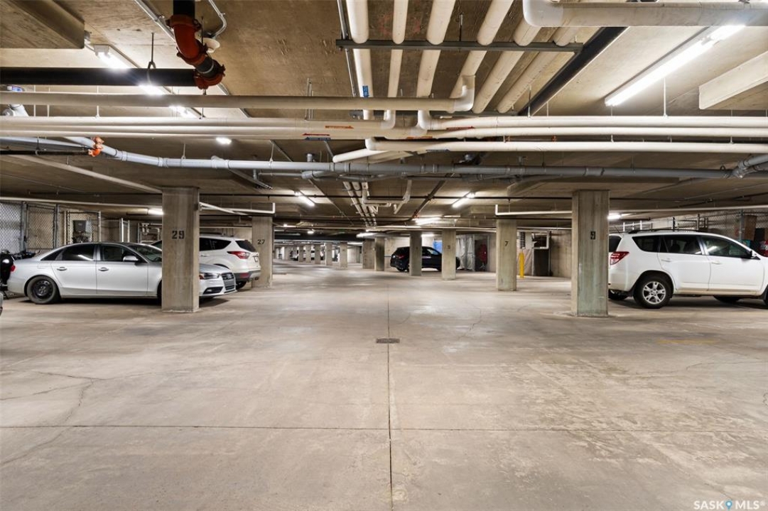 The only footsteps you might hear above you would come from the big man from the North Pole and his 9 reindeer! This top-floor Harbour Landing condo offers 2 bedrooms, 2 bathrooms, heated underground parking, and only one neighbouring unit. One of only a few built with this design, it also features an extra half foot of ceiling height for an even more spacious feel. South-facing exposure fills the open-concept living, dining, and kitchen area with beautiful natural light. Both bedrooms feature custom closets by Simply Stowed Custom Cabinets, and the laundry room provides extra in-suite storage. The Washer and Dryer were replaced in July of 2025, and condo fees include heat, water, and sewer for added everyday value and lower utility bills. Close to schools, daycares, parks, and all Harbour Landing amenities, this home offers comfort, convenience, and excellent value.