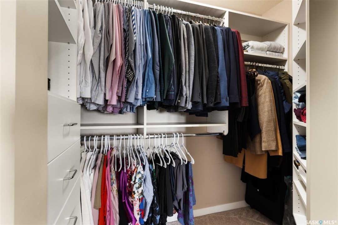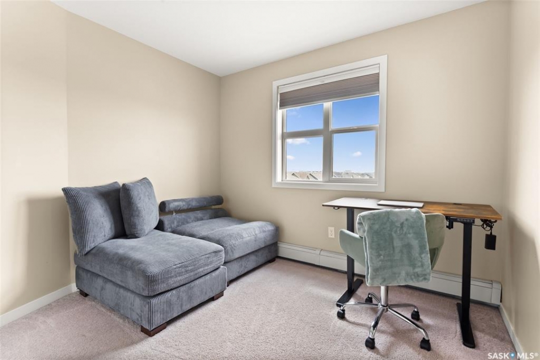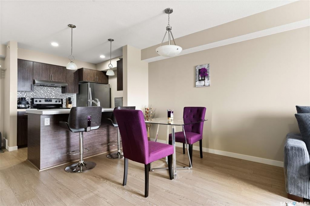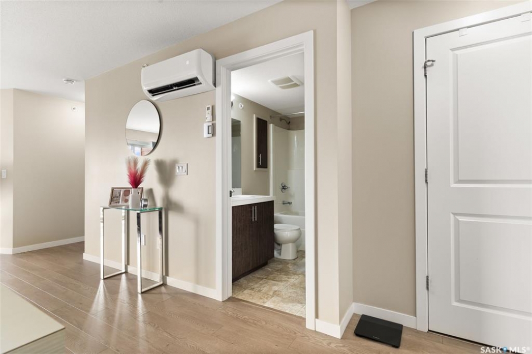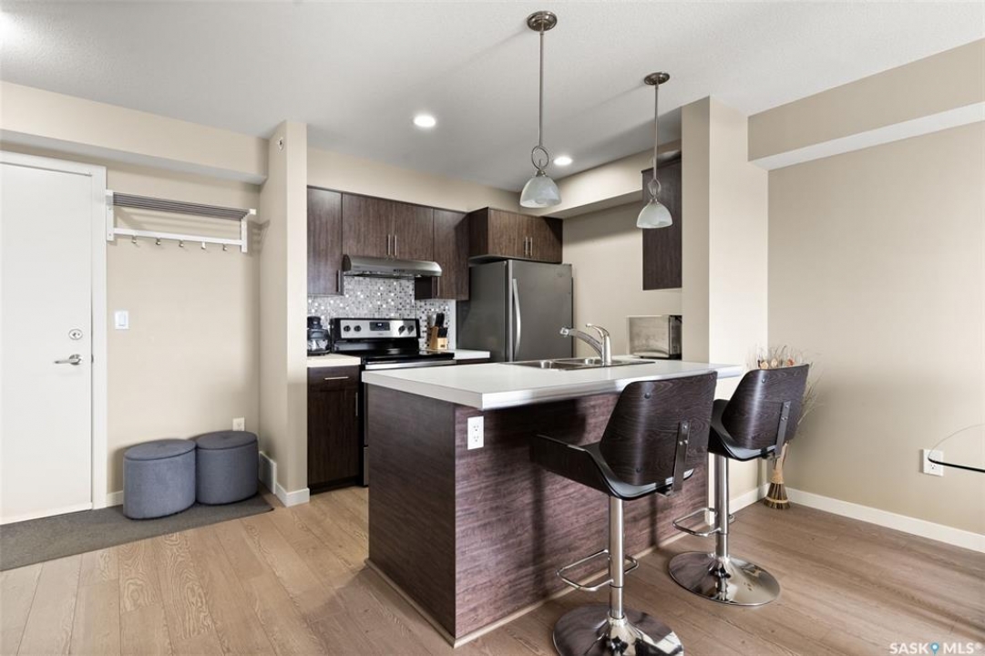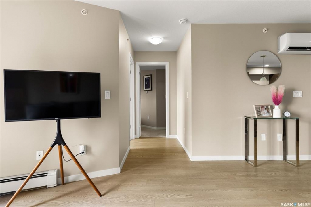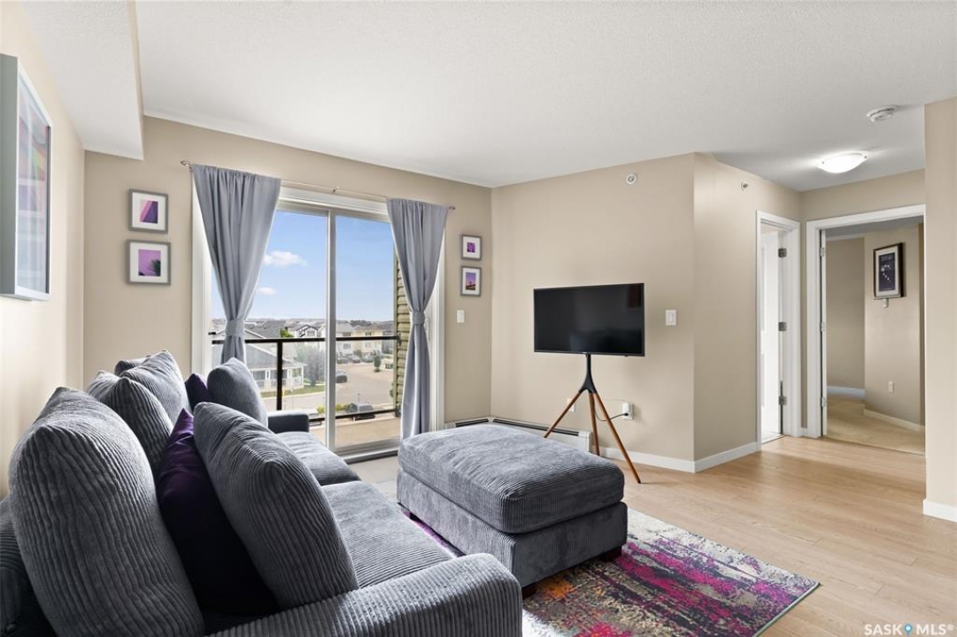 The only footsteps you might hear above you would come from the big man from the North Pole and his 9 reindeer! This top-floor Harbour Landing condo offers 2 bedrooms, 2 bathrooms, heated underground parking, and only one neighbouring unit. One of only a few built with this design, it also features an extra half foot of ceiling height for an even more spacious feel. South-facing exposure fills the open-concept living, dining, and kitchen area with beautiful natural light. Both bedrooms feature custom closets by Simply Stowed Custom Cabinets, and the laundry room provides extra in-suite storage. The Washer and Dryer were replaced in July of 2025, and condo fees include heat, water, and sewer for added everyday value and lower utility bills. Close to schools, daycares, parks, and all Harbour Landing amenities, this home offers comfort, convenience, and excellent value.