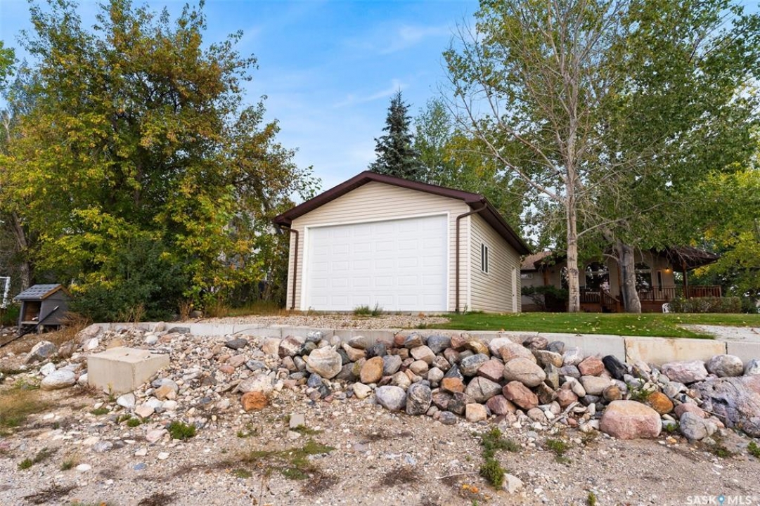Check out this Fabulous waterfront property (144' of sandy beach) with oversize double car garage and an additional boathouse garage at Collingwood Lakeshore Estates just 1 hour North of Regina on Last Mountain lake. There is an ADDITIONAL titled lot across the street for future building or additional parking and storage that is included in the sale. This beautiful fully landscaped yard is so private with mature trees, underground sprinklers and numerous patios totalling just over a 1 acre land. Walking up to this 4 season home you automatically see has so much the property has to offer with a beautiful covered private deck just off the front entry which is absolutely perfect for those morning coffees. The smart design of the house gives you breathtaking west views of the lake. Stepping into the foyer you immediately see the modern entertainers kitchen which overlooks the livingroom and dining room with 14' vaulted ceiling with feature natural gas fireplace all overlooking west views of the lake the lake with oversize windows. The fabulous kitchen with granite countertops has a large breakfast island and comes complete with stove, fridge, built in dishwasher and microwave hood fan. The dining area is conveniently set off to the front and side of the great room with direct exit to another covered deck. The large primary bedroom has a convenient 3 piece ensuite. There are 2 additional bedrooms, 4 piece bath and a laundry /storage room that completes the home. The detached drive thru boat house garage is perfect for all of your toys. The detached double car main garage is also heated. This home is an absolute gem and is such a pleasure to show. For a virtual walkthru please click on link or view https://unbranded.youriguide.com/194_gordon_drive_collingwood_sk/