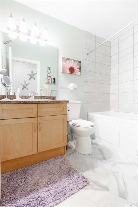Beautiful 2 bedroom, 2 four piece bathroom, updated condo located in the desirable, quiet, mature residential neighborhood of Gardiner Heights. This upper end unit is nicely maintained and move in ready, it offers privacy, natural light, neutral colors and modern updates. The living area offers both definition of space as well as an open concept, it features a bright living room with a large window and cozy fireplace, perfect for relaxing evenings. Eat in kitchen with Maple cabinets. Both bedrooms are 11' x 12' 6" with walk in closets and there own 4 piece bathrooms with soaker tubs. This unit also offers the convenience of in-suite laundry with extra storage. Ecoline Windows installed in 2025. Main door features a phantom screen door leading to your large private deck that faces west, plus there's an additional outside storage room at the south side of the deck. This complex offers ample green space and a seasonal outdoor swimming pool for residents to enjoy. Condo fees include heat, water and a designated electrified parking stall. Pets are allowed with restrictions. This property is conveniently located in east Regina close to all east end amenities. Lots of street parking right out front of unit.