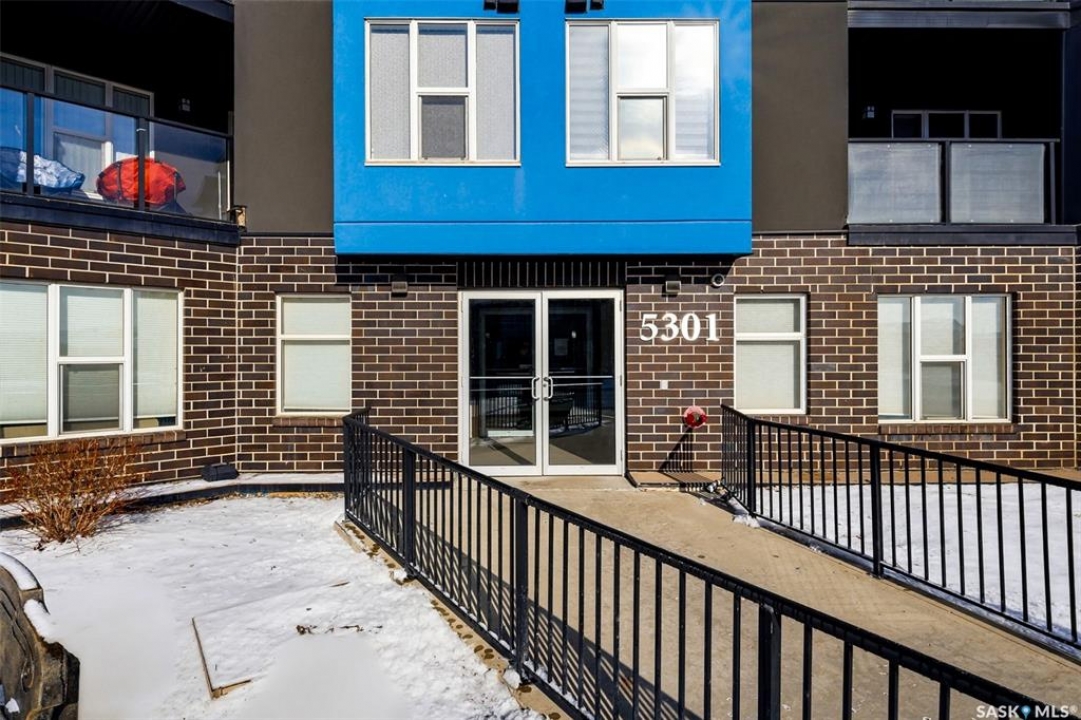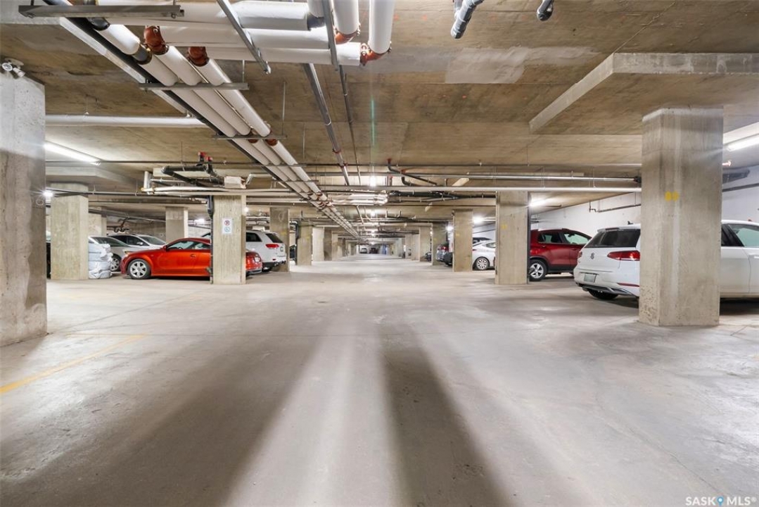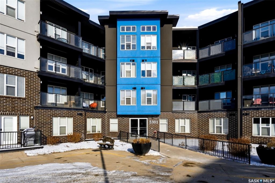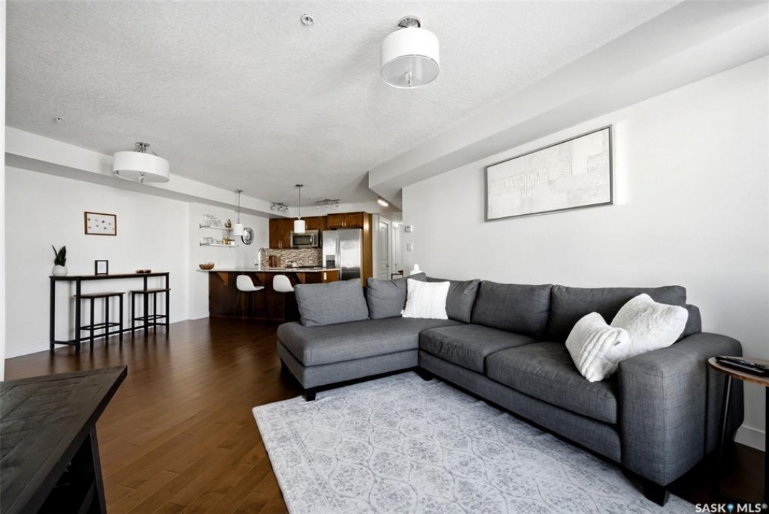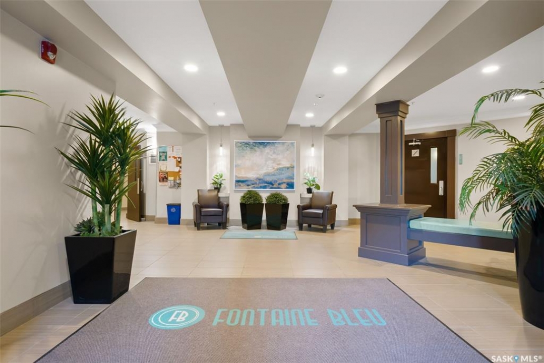 Meticulously maintained and move-in ready, this is one of the more spacious one-bedroom suites Fontaine Bleu has to offer. The open-concept layout flows seamlessly from the kitchen through the dining and living areas, all finished with beautiful hardwood flooring. Complete with high-end finishes the kitchen features maple cabinetry, stone countertops, tile backsplash, matching appliances, and a large island. The bright living room opens onto a generous west-facing balcony with a natural gas BBQ hookup, ideal for enjoying Saskatchewan summers. Down the hall, the comfortable primary bedroom offers ample closet space, complemented by an adjoining four-piece bathroom with tile floor. To top it all off, you'll enjoy the peace of mind of a heated underground parking stall, a dedicated storage locker, and condo fees that cover both heat and water. The building itself offers a fantastic range of amenities including a theatre room, gym, carwash bay, bike storage, and even a dog washing room, everything you need right at home. The perfect option for anyone seeking low-maintenance living in South Regina.