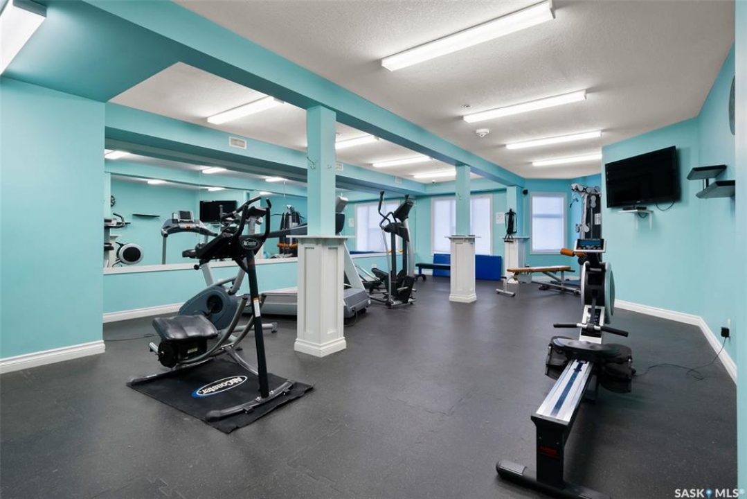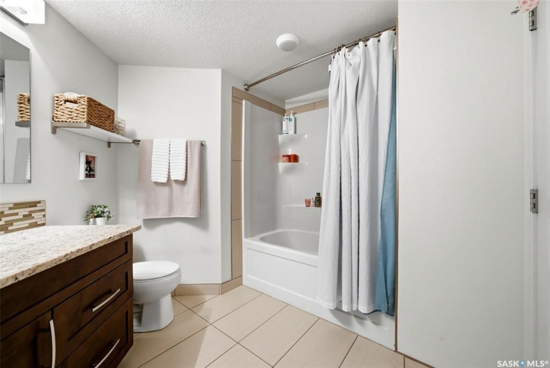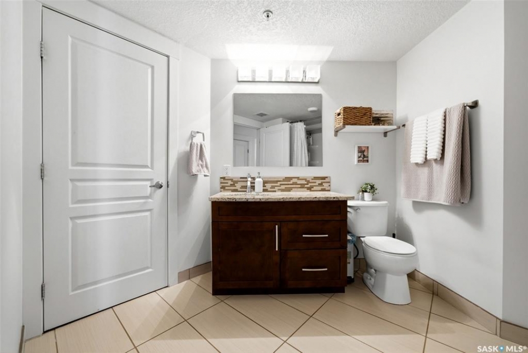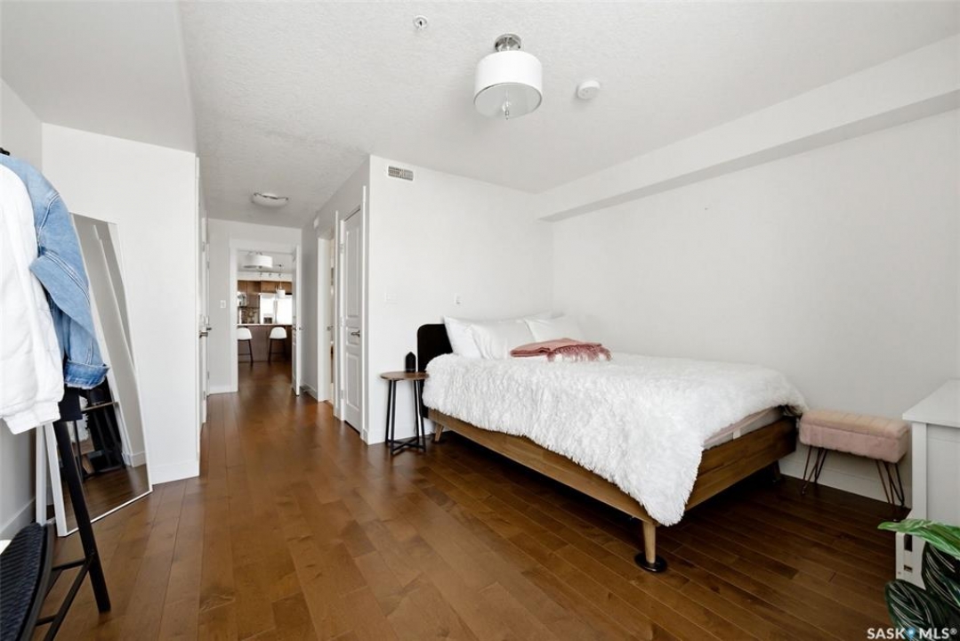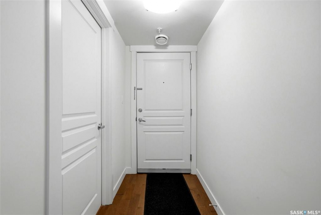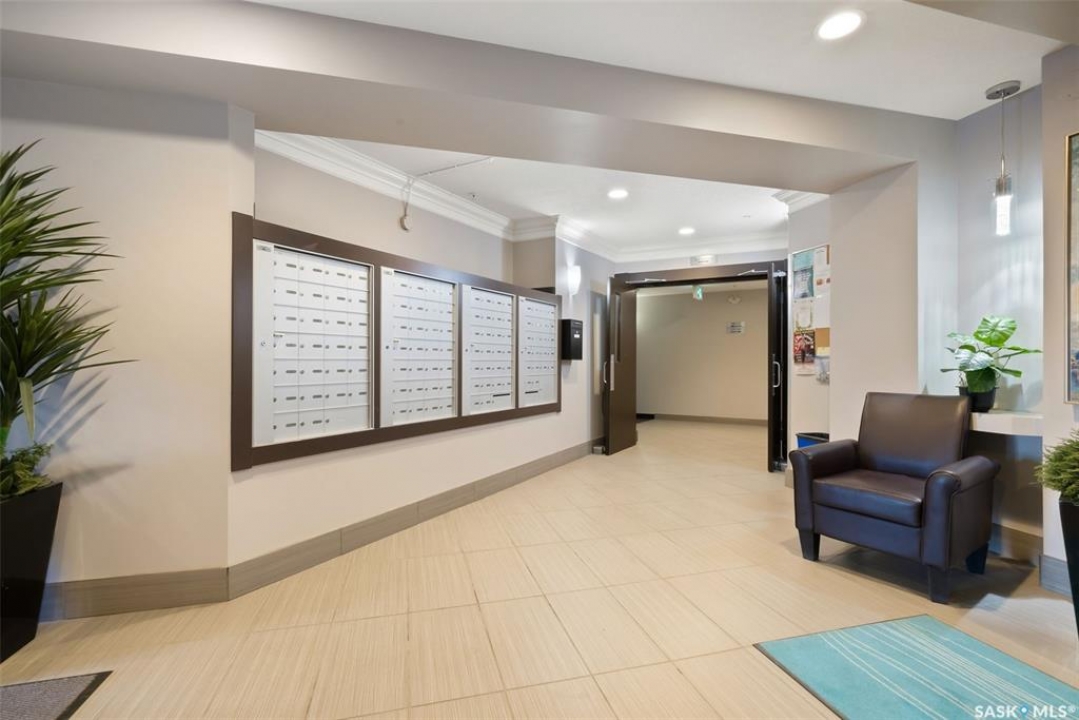 Meticulously maintained and move-in ready, this is one of the more spacious one-bedroom suites Fontaine Bleu has to offer. The open-concept layout flows seamlessly from the kitchen through the dining and living areas, all finished with beautiful hardwood flooring. Complete with high-end finishes the kitchen features maple cabinetry, stone countertops, tile backsplash, matching appliances, and a large island. The bright living room opens onto a generous west-facing balcony with a natural gas BBQ hookup, ideal for enjoying Saskatchewan summers. Down the hall, the comfortable primary bedroom offers ample closet space, complemented by an adjoining four-piece bathroom with tile floor. To top it all off, you'll enjoy the peace of mind of a heated underground parking stall, a dedicated storage locker, and condo fees that cover both heat and water. The building itself offers a fantastic range of amenities including a theatre room, gym, carwash bay, bike storage, and even a dog washing room, everything you need right at home. The perfect option for anyone seeking low-maintenance living in South Regina.