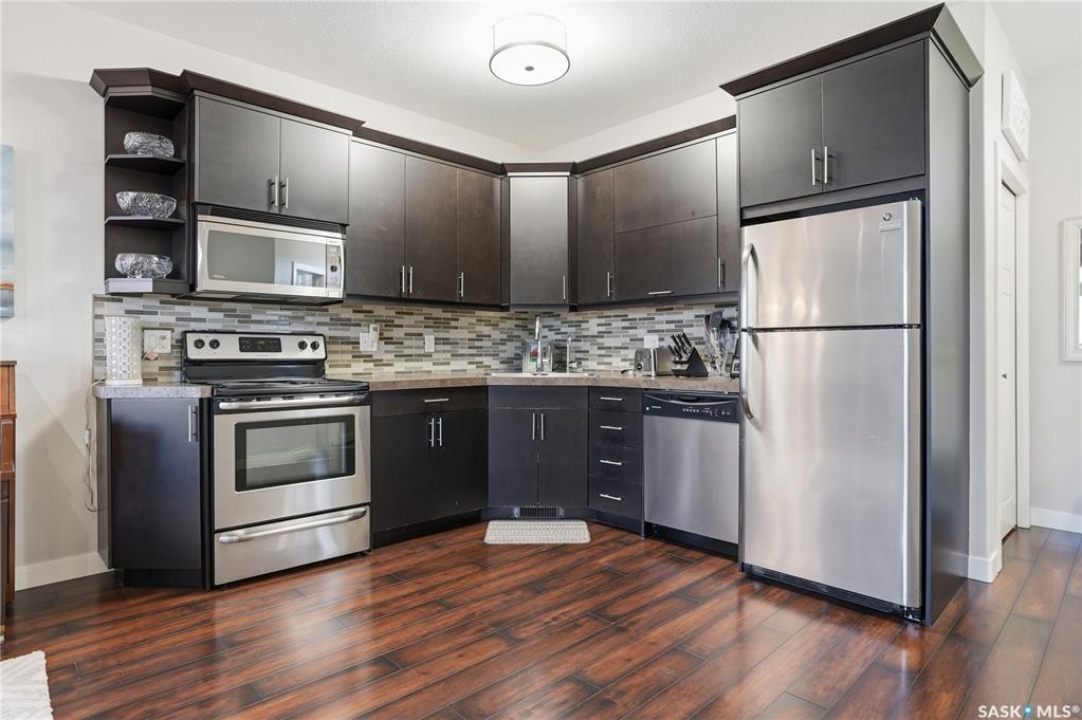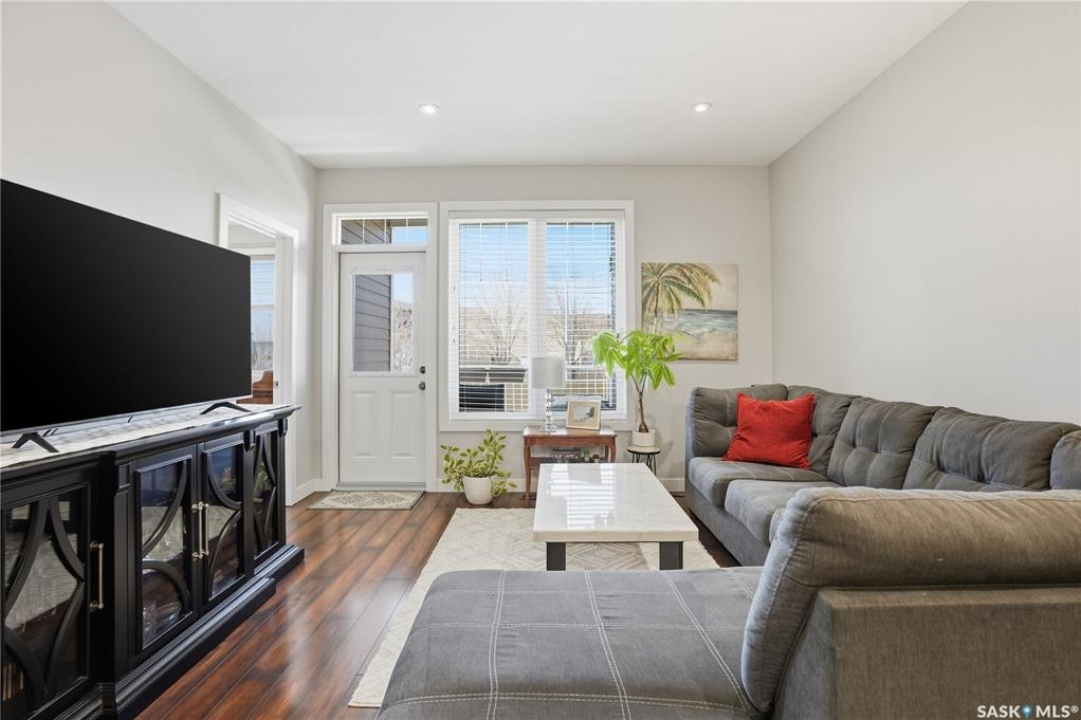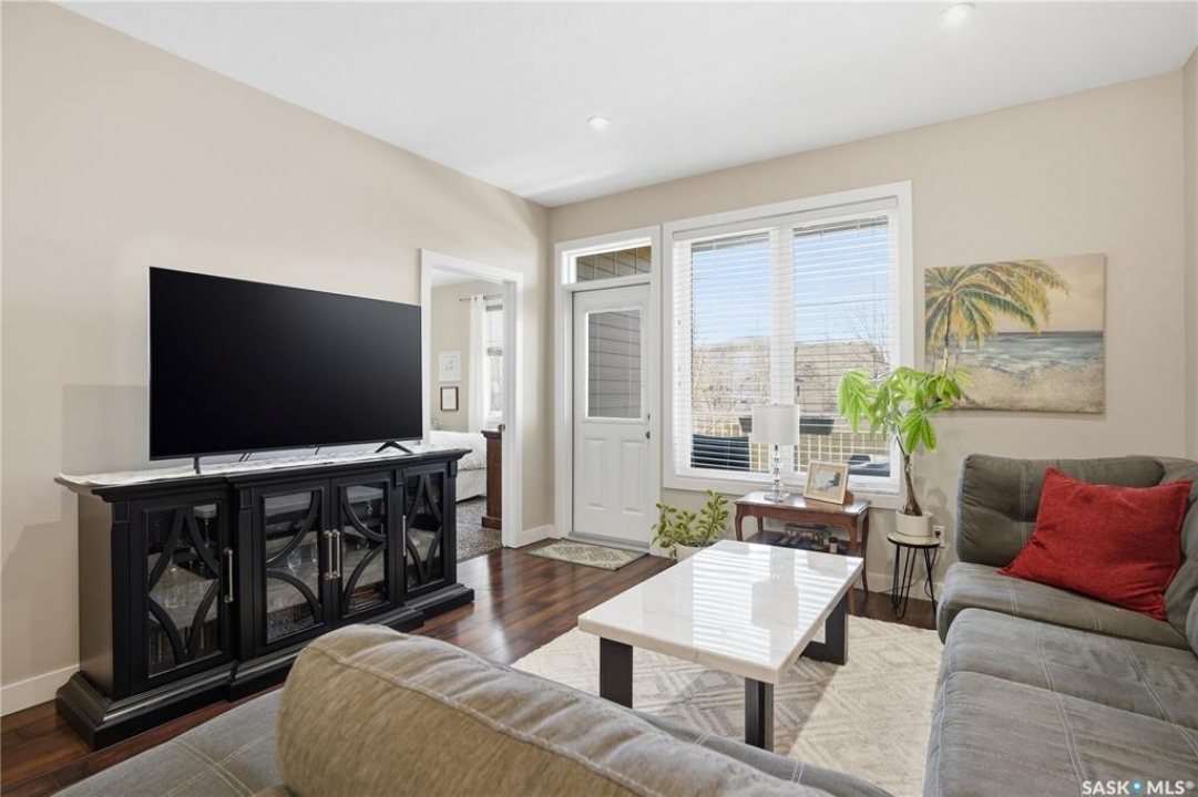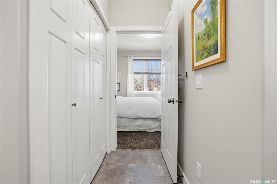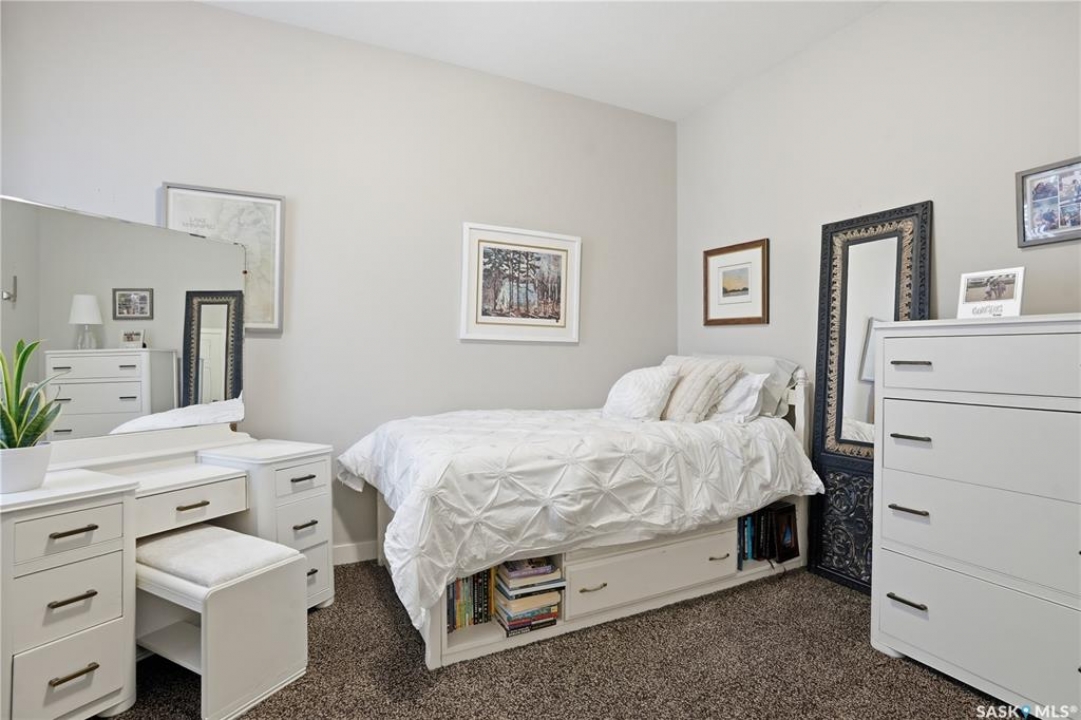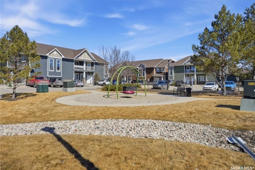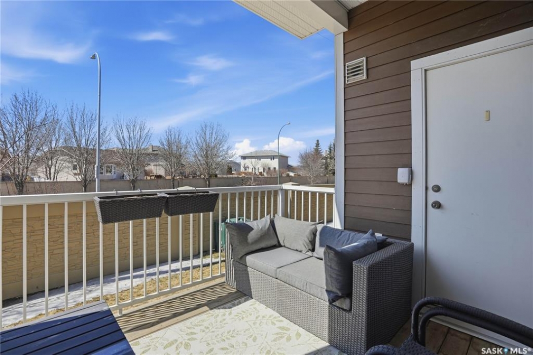 Welcome to this 2 bedroom condo located at 3237 Green Bank Road. This exceptionally clean, practical, with TWO parking spots, move-in-ready 829 sq ft condo offers low-maintenance living in one of Regina's most sought-after east end neighbourhoods, The Greens on Gardiner. Located on the main level with an west/east configuration, this unit features an open-concept layout enhanced by 9' ceilings allowing a natural flow from room to room without restricting walls or different flooring. This condo allows for a smart & seamless weaving of the living spaces. The kitchen offers espresso-stained maple cabinetry, a tile backsplash, & generous space for an island, eat up bar, & dining area (if desired). Along the wall is a closet that is perfect for a pantry. A spacious living room is bright with the afternoon sun & provides access to a cozy deck & no back neighbors. The deck has a utility room with the owned on-demand water heater, furnace, & room for storage. A bonus is the natural gas BBQ hookup. The large primary bedroom easily accommodates a king-size bed, furniture, & is positioned at the back & includes a well-designed, oversized walk-in closet. As well, you'll find the hatch to the FULL concrete crawl space that is clean, dry, & solid - this is great space beneath the entire unit & ideal for extensive storage. A second bedroom at the front is a versatile room that can function as a bedroom, office, yoga room, or studio. The full bathroom has a large vanity, new washer & dryer (Fall '25) & with access from the primary bedroom, it offers great functionality, too! 3237 Green Bank Rd has a fabulous location & is tucked away into the residential area of The Greens neighborhood, the location is super! A huge bonus: 2 titled parking (electrical) stalls, #33 & #42, & visitor parking on both sides of the common area. Walking paths, parks, shopping, restaurants, & schools are all close by. Condo fees are reasonable $215.21/month. This is truly a move in ready condo!