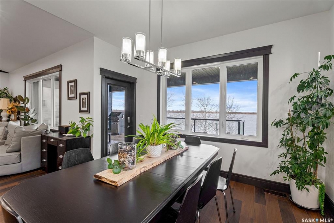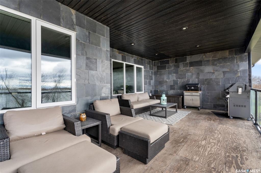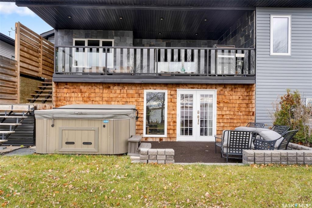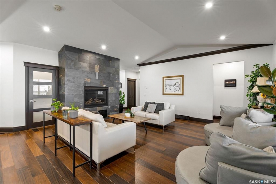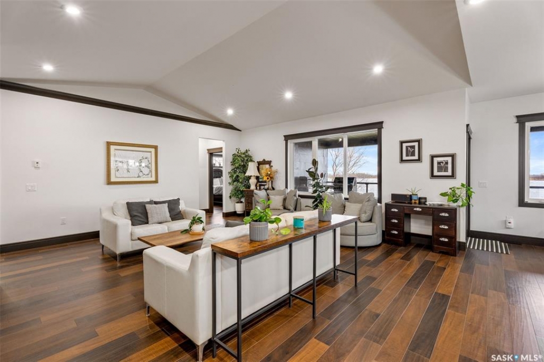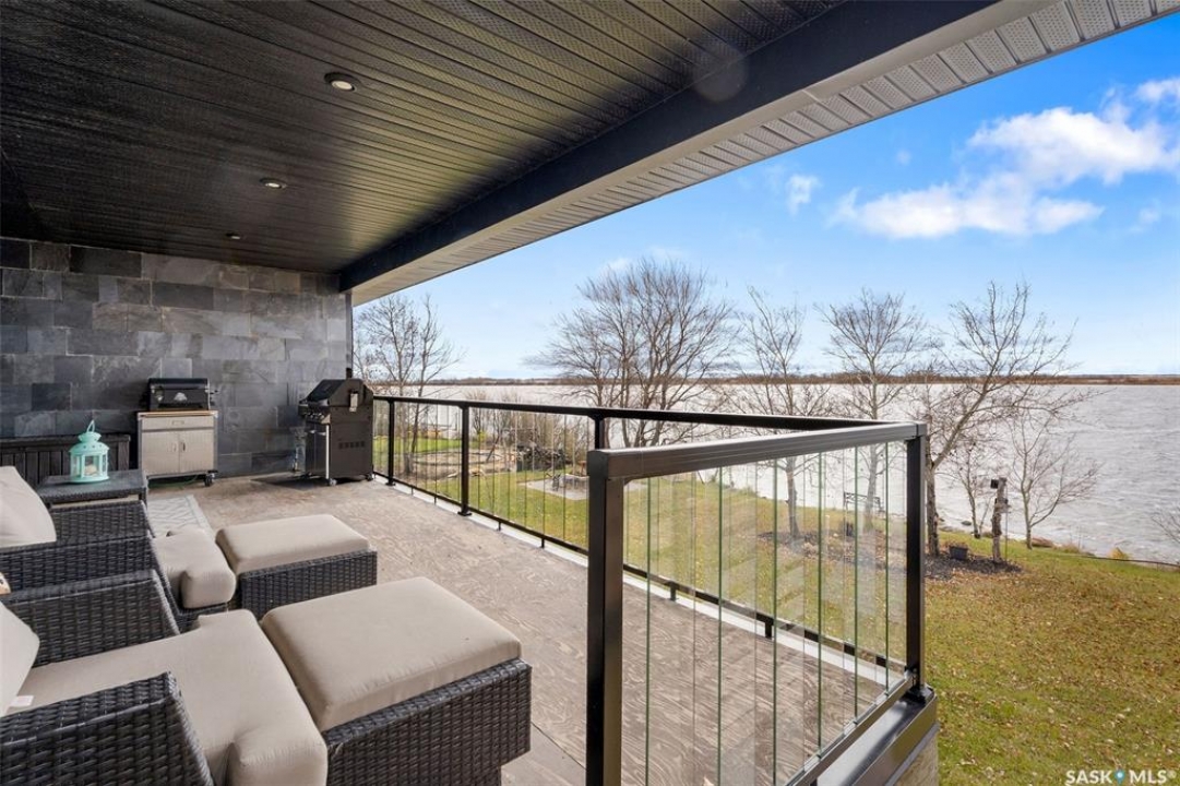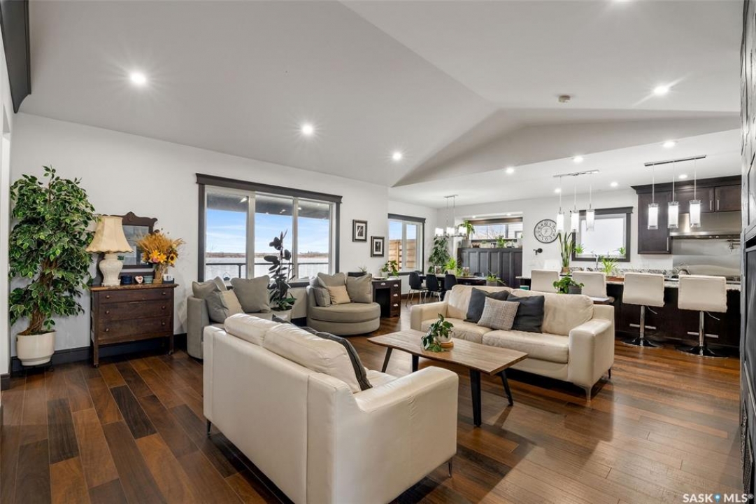 Lakefront Executive Style home at Humboldt Lake! Welcome to this stunning lakefront executive bungalow offering 1,733 sq. ft. of refined living space in a serene and private setting. Elegant Interiors & Gourmet Kitchen: The open-concept main living area features soaring vaulted ceilings and a striking natural gas slate fireplace, creating both warmth and elegance. A chef's dream kitchen awaits with gleaming granite countertops, a large island with seating, and a THOR Professional six-burner gas stove with griddle and pot filler tap. High-end appliances—double drawer dishwasher, ,including a built-in coffee maker, Miele speed oven, Miele espresso/coffee maker , Miele dish warming drawer and a well-planned butler's pantry—make entertaining effortless. Thoughtful Design & Luxurious Details: This home offers five bedrooms and three bathrooms, including a lakeside master retreat complete with walk-in closet and spa-inspired ensuite. A spacious foyer off the 1,000 sq. ft. attached garage with mezzanine sets the tone for style and function, while in-floor heating in both the garage and basement ensures year-round comfort. Outdoor Living & Recreation: The west-facing lot is perfect for evening sunsets, enjoyed from the covered deck with direct basement access. A dedicated sauna room overlooks the 6 person hot tub with waterfall feature, providing the ideal spot to relax after a day on the water. The basement boasts 9 ft ceilings, a large family room, an exercise area, and a versatile sauna/games room. Modern Comfort & Efficiency: Equipped with natural gas forced-air heating and central air conditioning, in floor heat in the basement and garage, this home blends contemporary convenience with lakeside tranquility. Experience the unmatched lifestyle of the Lakefront Executive at Humboldt Lake—where luxury meets comfort at every turn. Call today to arrange your private viewing!
