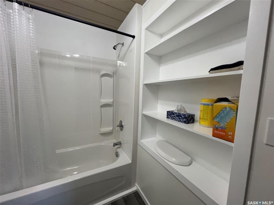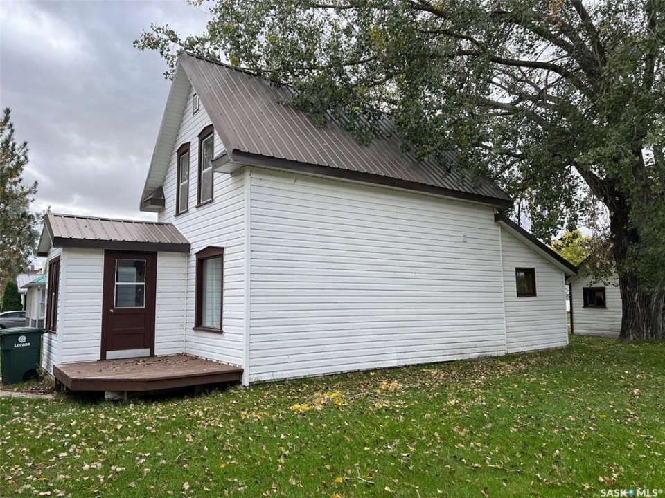 Located in Wilkie is the 1 1/2 storey home. Renovated 2 bedroom home with good workmanship. Main level has large kitchen with quartz countertop, oak cabinets, fridge & stove, cozy living room with gas stove, bright dining area, and laundry. Front and back porch. Second level has 2 bedrooms. Metal roof, vinyl siding, metal soffits. 11x25 shed in treed backyard.