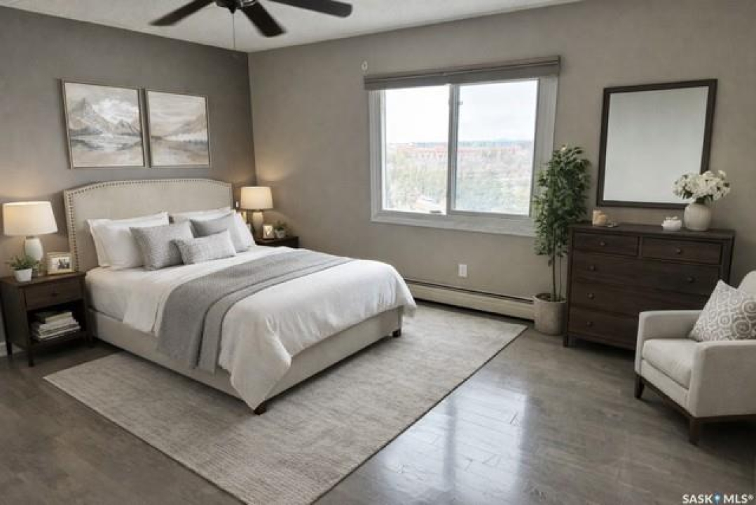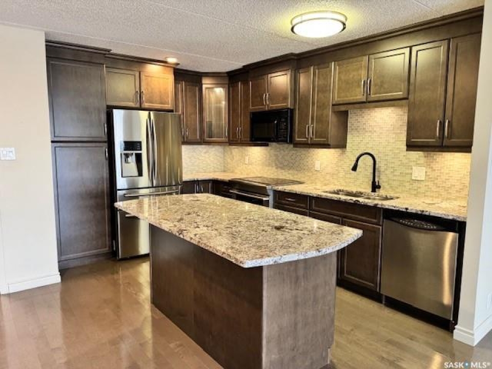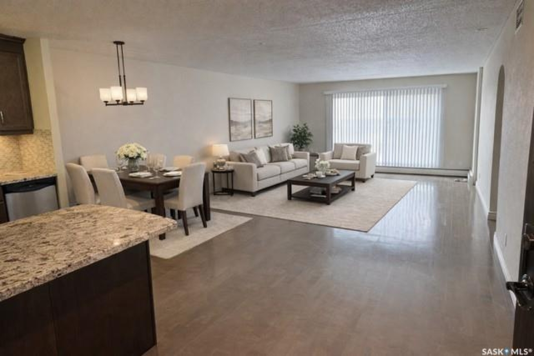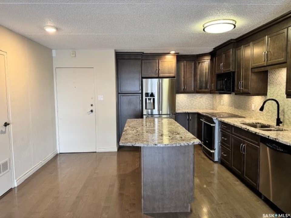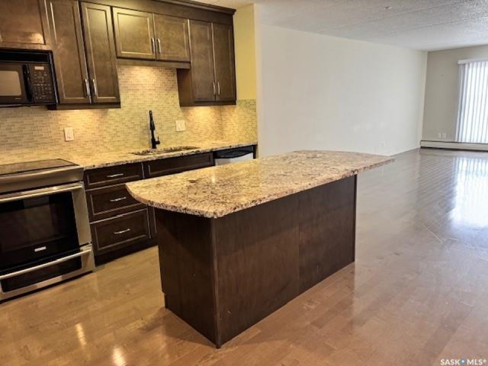Welcome to this beautifully upgraded 2 bedroom, 2 bathroom condo located in the well-established community of Roberts Plaza. This inviting unit features a bright and open floor plan, highlighted by rich espresso cabinetry in the kitchen with granite countertops throughout, and a functional sit up island- perfect for casual dining or entertaining. The modern kitchen is complete with stainless steel appliances, offering both style and practicality. The space flows into the dining area and a spacious living room. Patio doors lead to a private balcony where you can enjoy impressive city views. Both bathrooms have been tastefully updated with granite countertops that add a touch of luxury to the home. Additional features include 1 underground parking stall for added convenience and security. Residents of Roberts Plaza also enjoy access to a variety of desireable building amenities, including indoor swimming pool, sauna, newer gym, amenities room, and more, making this an ideal place to call home. Condo Fees include: Common Insurance, Common area maint., Ext. Building maint., garbage, lawn care, snow removal, reserve fund, sewer, HEAT, POWER, WATER, and all amenities. Some photos are virtually staged.